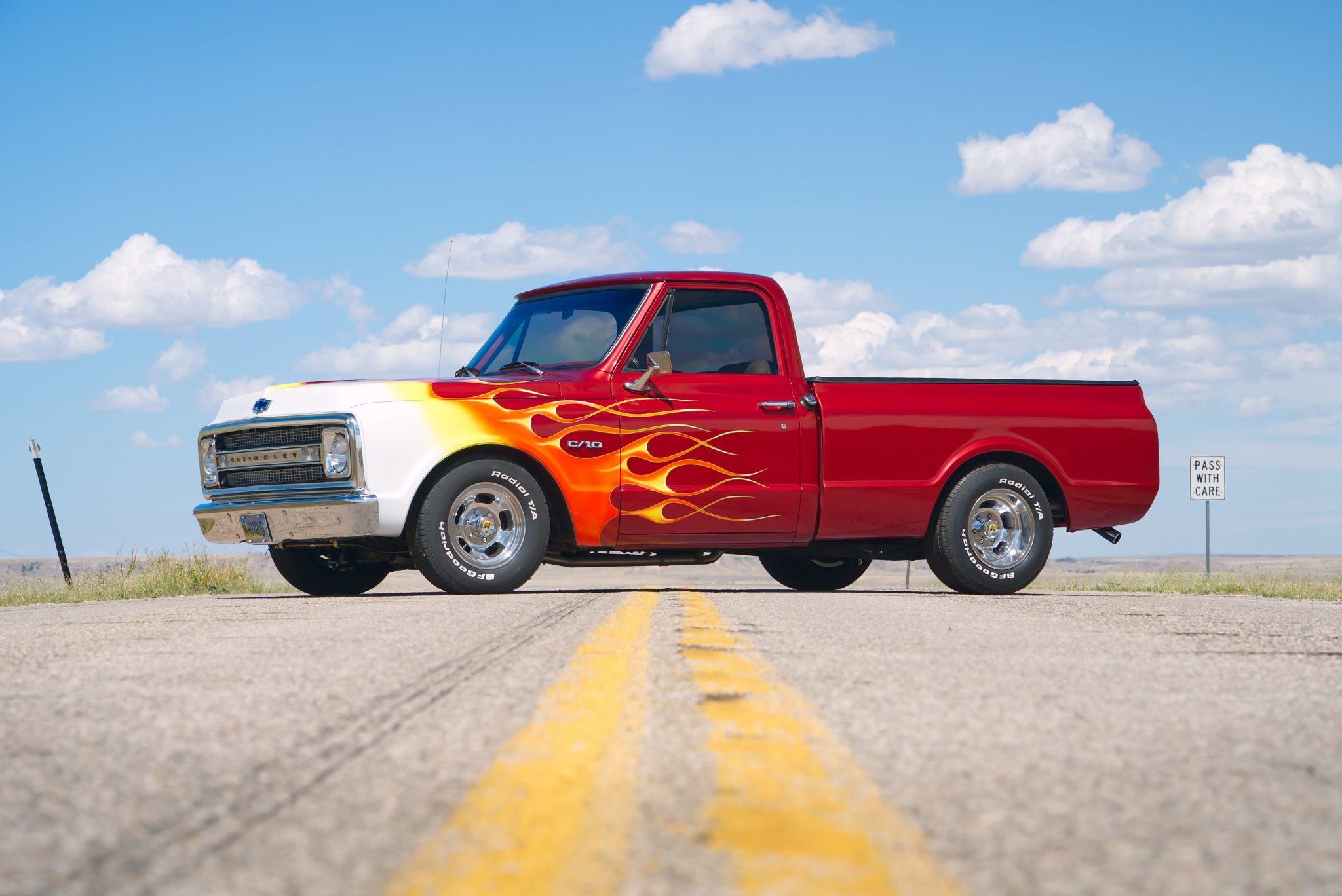 Polished slotted mag-style wheels are mounted with BFGoodrich Radial T/A white-letter tires measuring 235/70 up front and 275/60 out back. The truck rides on a lowered suspension and is equipped with power steering. Braking is provided by power-assisted front discs and rear drums.