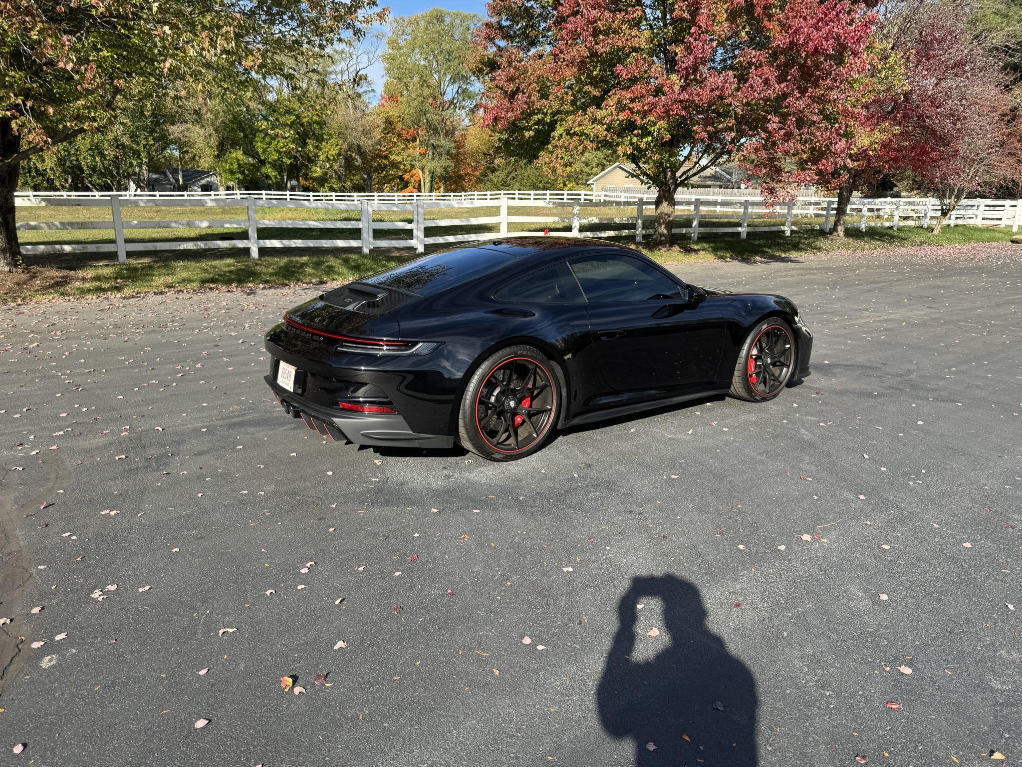 Satin Black-finished 20″ front and 21″ rear GT3 center-lock wheels feature Guards Red accent stripes and are mounted with Pirelli P Zero tires. Stopping power is provided by red Porsche-branded calipers over dimpled and ventilated discs at each corner. The car is equipped with a front-axle lift system and rear-axle steering.