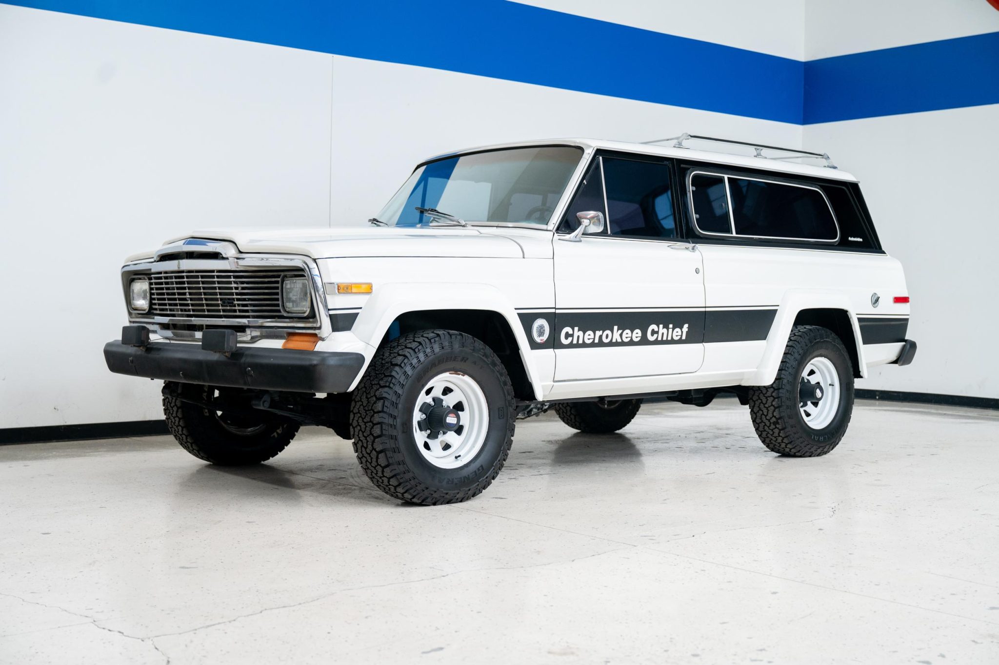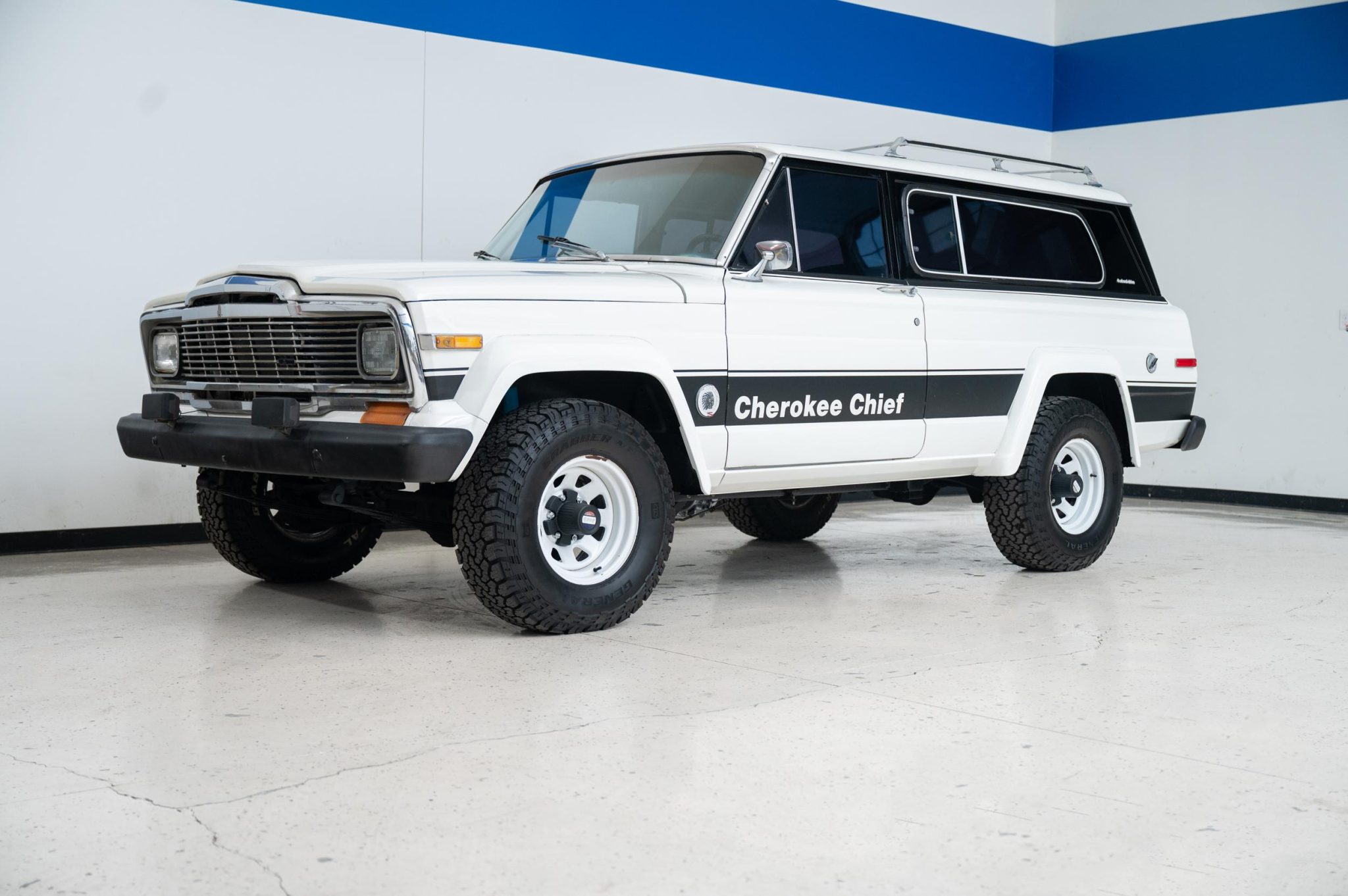 White 15″ steel wheels are mounted with 31×10.5″ General Grabber A/T tires. The Jeep is equipped with Bilstein shock absorbers, and braking is handled by front discs and rear drums.