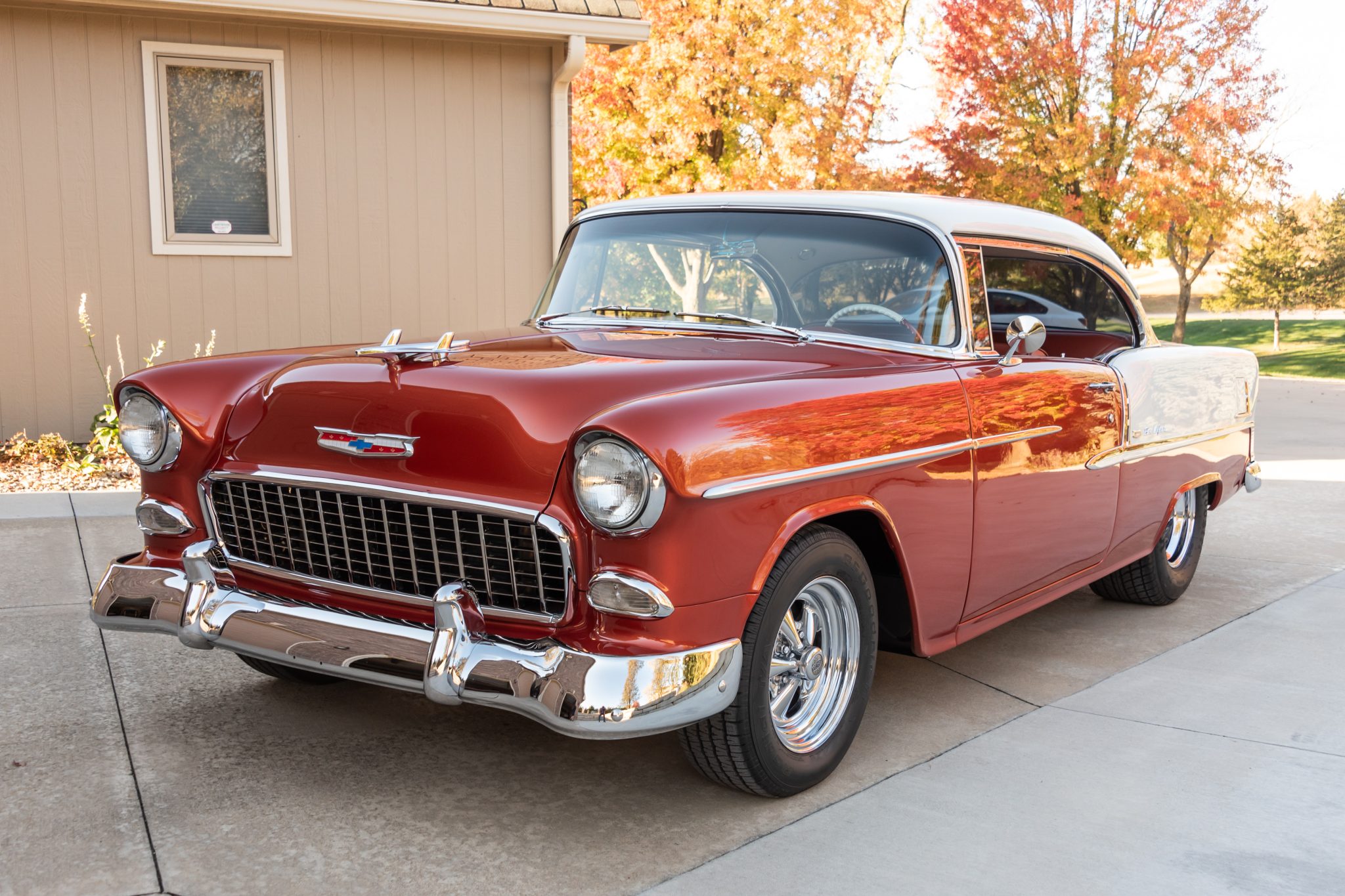 Chrome-plated 15″ Cragar S/S wheels are wrapped in 215/65 BFGoodrich Radial T/A tires up front and 29×12.5″ Hoosier Pro Street tires out back. A mini-tub kit has been installed for tire clearance in the trunk, and the car is equipped with tubular front control arms, power rack-and-pinion steering, and front disc brakes with rear drums.