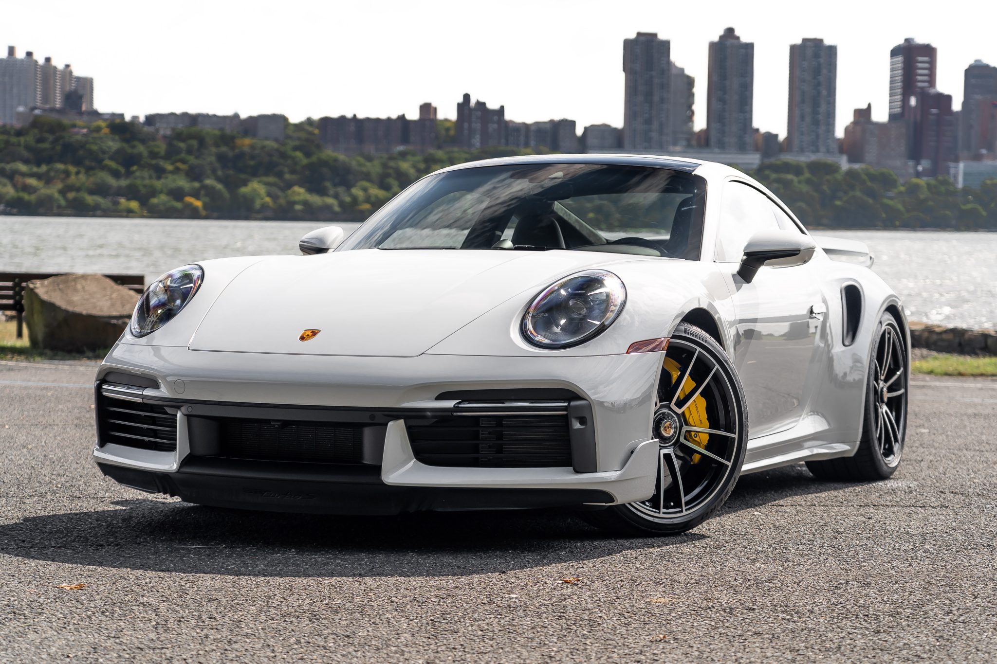 Center-locking 20″ and 21″ Turbo S alloy wheels are mounted with Pirelli P Zero tires. Stopping power is provided by Porsche Ceramic Composite Brakes (PCCB) with yellow-finished multi-piston calipers. The car is equipped with a front-axle lift system, Power Steering Plus, PASM sport suspension, and rear-axle steering.