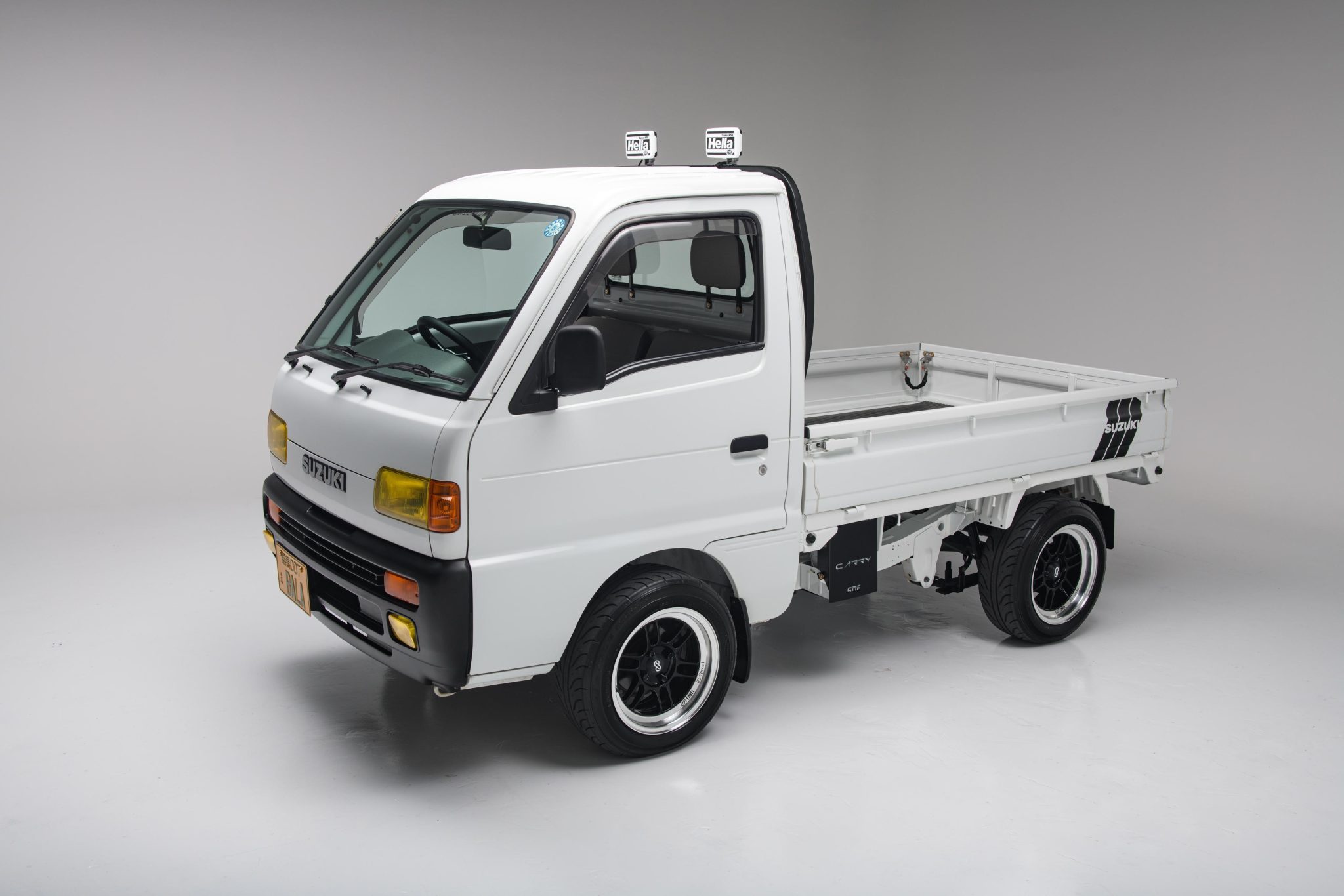 Enkei RPF1 14″ split-spoke wheels wear 3D-printed center caps and are mounted with 185/60 Goodyear Eagle RS Sport tires. Braking is handled by front discs and rear drums. The seller notes that the center steering link, brake pads and rotors, and strut bushings were replaced under current ownership.
