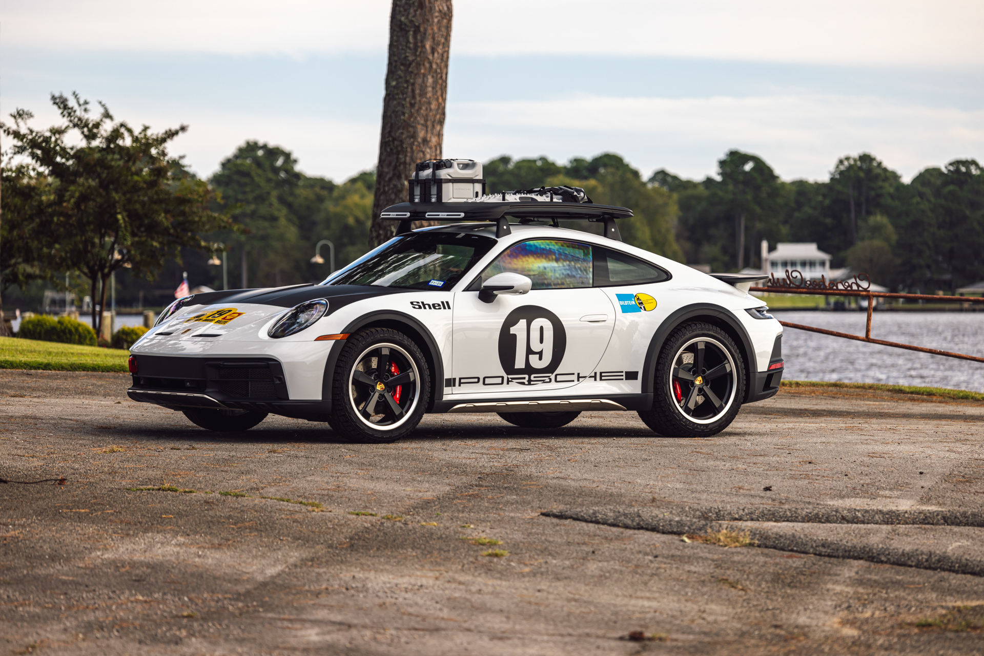 This example is finished in white with “Rallye 1971” graphics and has been fitted with a Tequipment roof rack that holds two water canisters, recovery boards, and a water-resistant travel bag. The Dakar-specific front and rear fascias incorporate stainless-steel skid plates as well as forged-aluminum tow eyes, while the side skirts wear inset stainless-steel guard plates and are accompanied by black wheel-arch extensions. The carbon-fiber front hood features air outlets shared with the GT3, and a carbon-fiber fixed rear spoiler is equipped out back. Further details include LED headlights with the Porsche Dynamic Lighting System as well as fog lights, 911 Dakar–logo puddle lamps, and a tinted taillight strip.