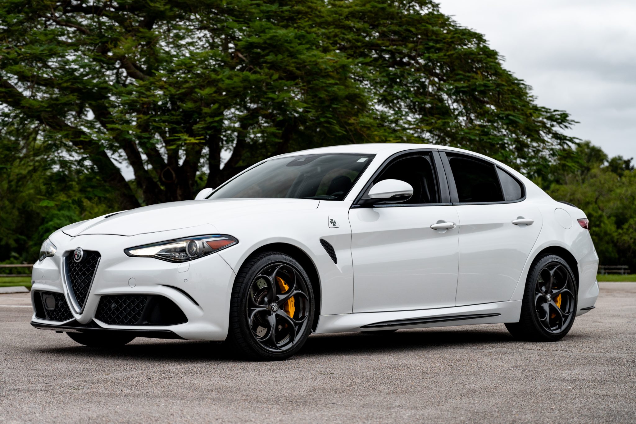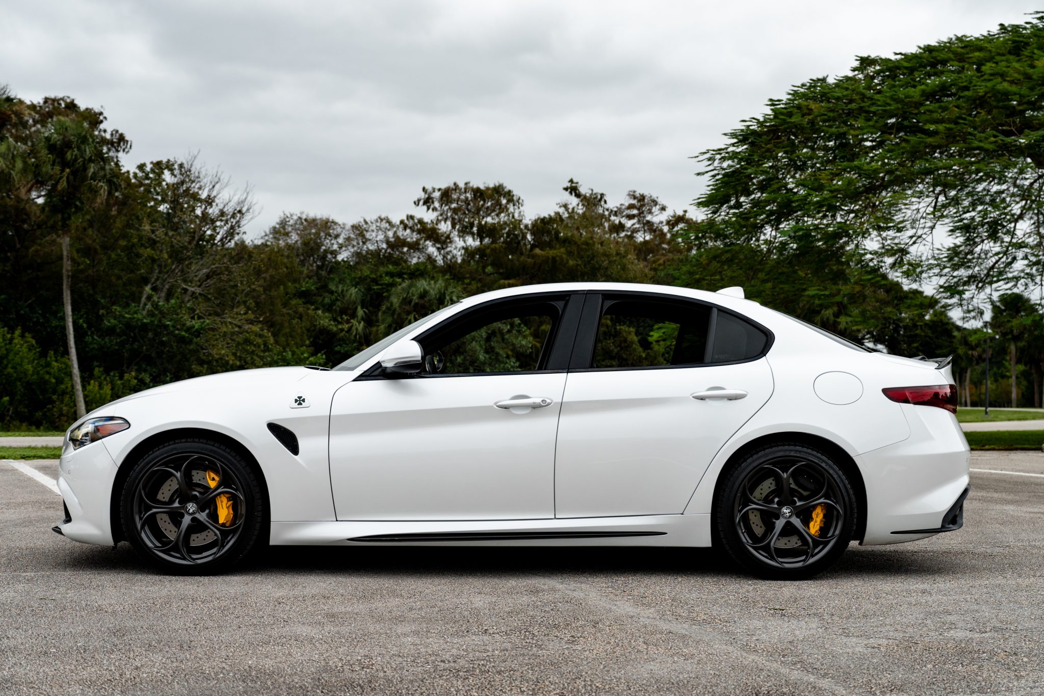 Dark-finished 19″ five-hole alloy wheels are mounted with Michelin Pilot Sport A/S 3+ tires, and braking is handled by Brembo cross-drilled and ventilated discs at each corner with gloss yellow calipers. The car came factory-equipped with an active suspension system. A brake fluid flush was completed in preparation for the sale.