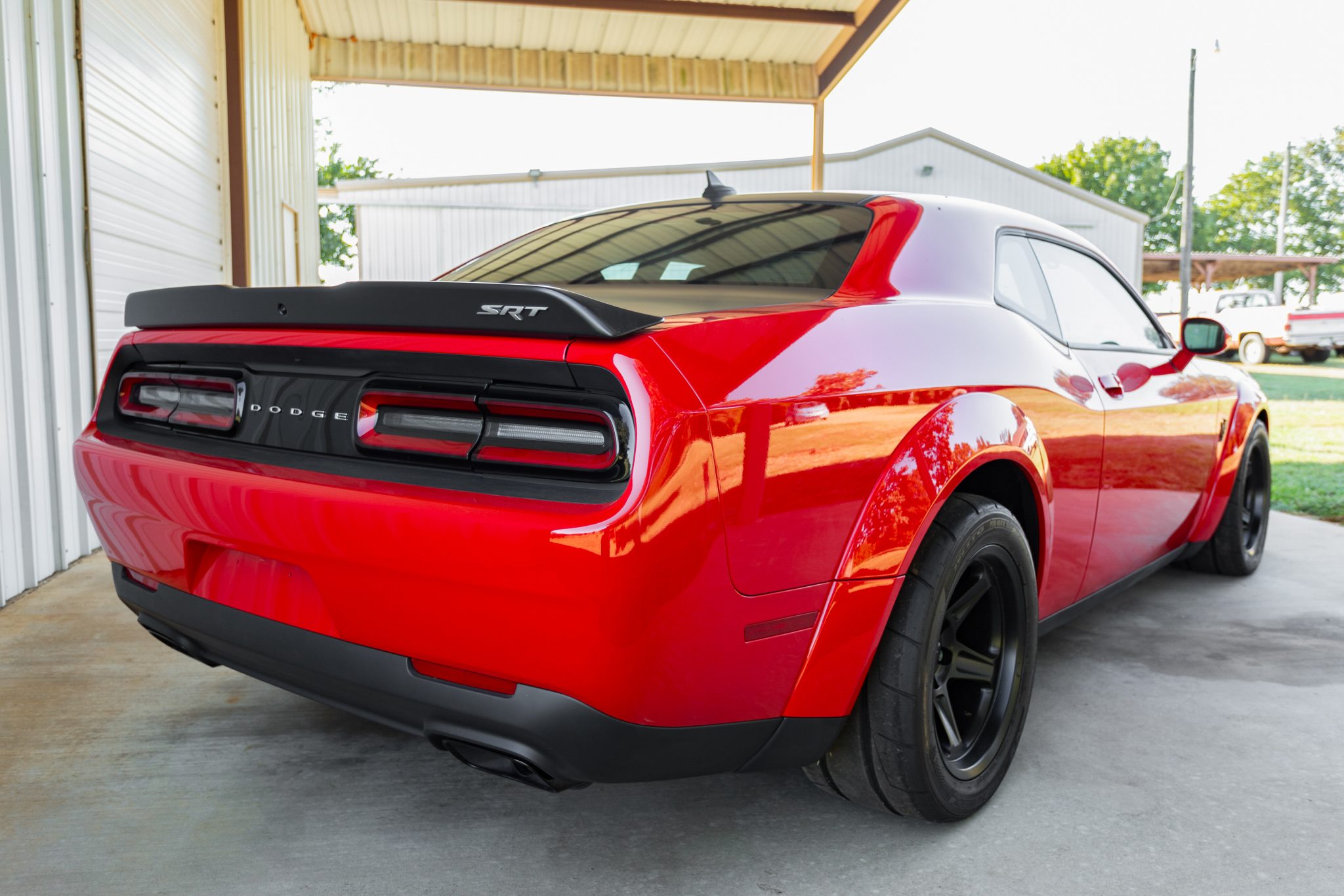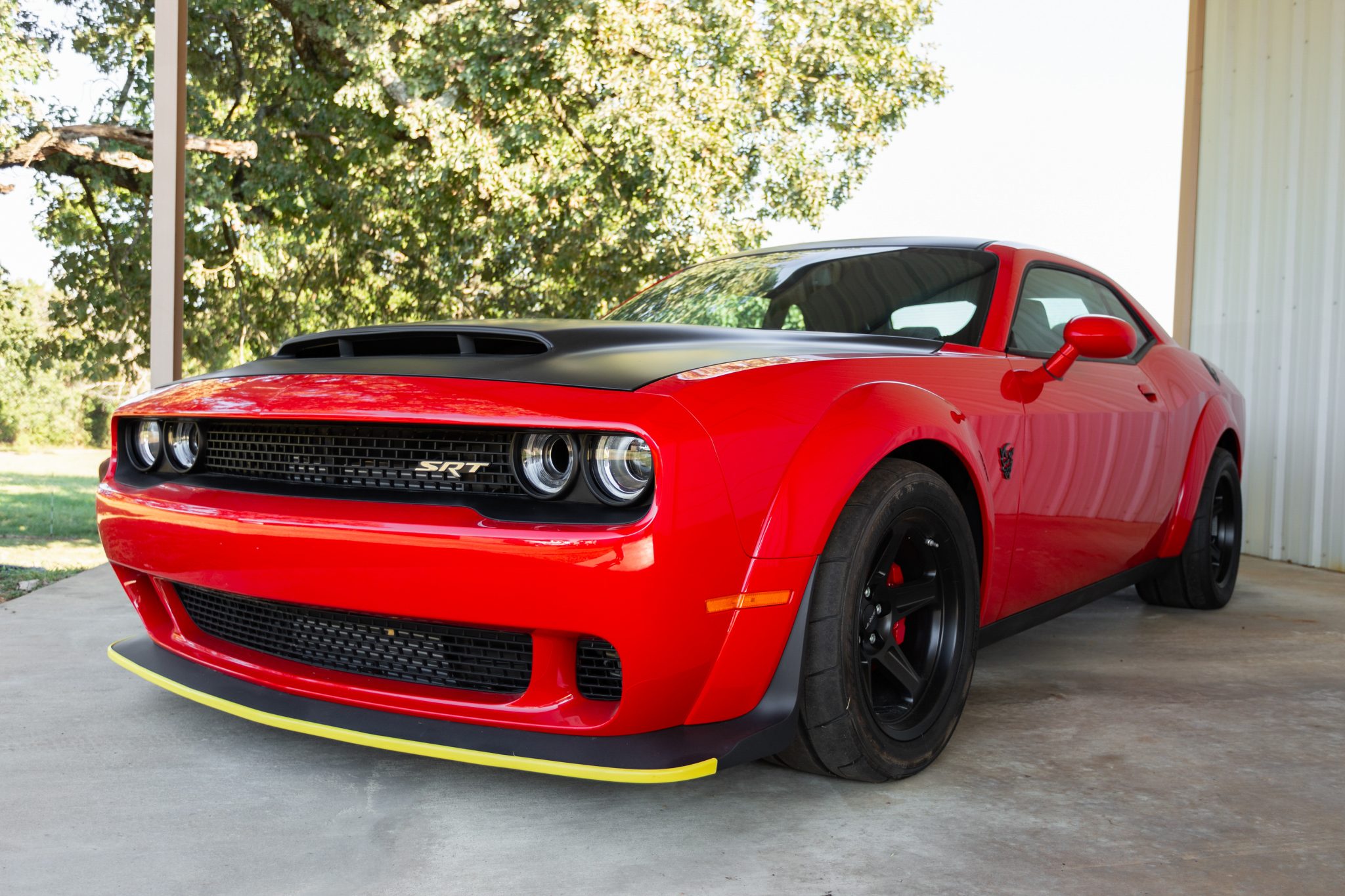 The 18″ Hole Shot aluminum wheels are mounted with 315/40 Nitto NT05R tires. Braking is handled by red-finished Brembo calipers fitted over slotted rotors at all four corners. The Demon is equipped with an active damping suspension as well as Drag Mode and Launch Assist, which alter the engine management profiles and activate the transbrake and line lock functions.