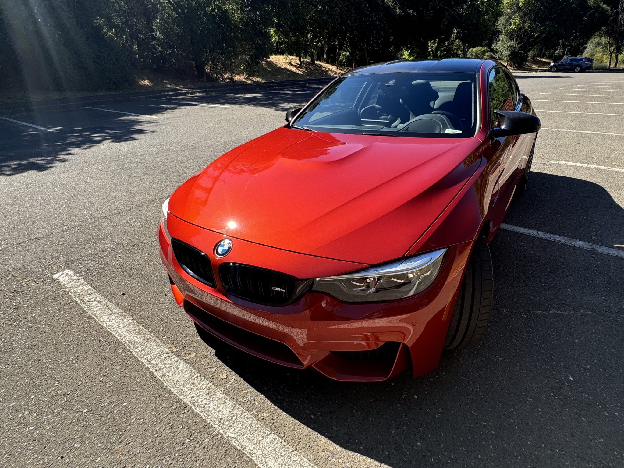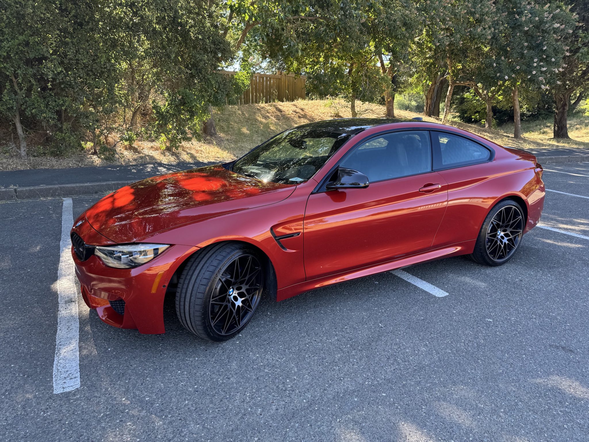 The 20″ Style 666M alloy wheels are mounted with Michelin Pilot Super Sport tires. Braking is handled by blue-finished M-branded calipers over cross-drilled and ventilated discs at each corner. The car is equipped with M Dynamic Mode as well as an adaptive M suspension. A brake fluid flush was performed in July 2024.