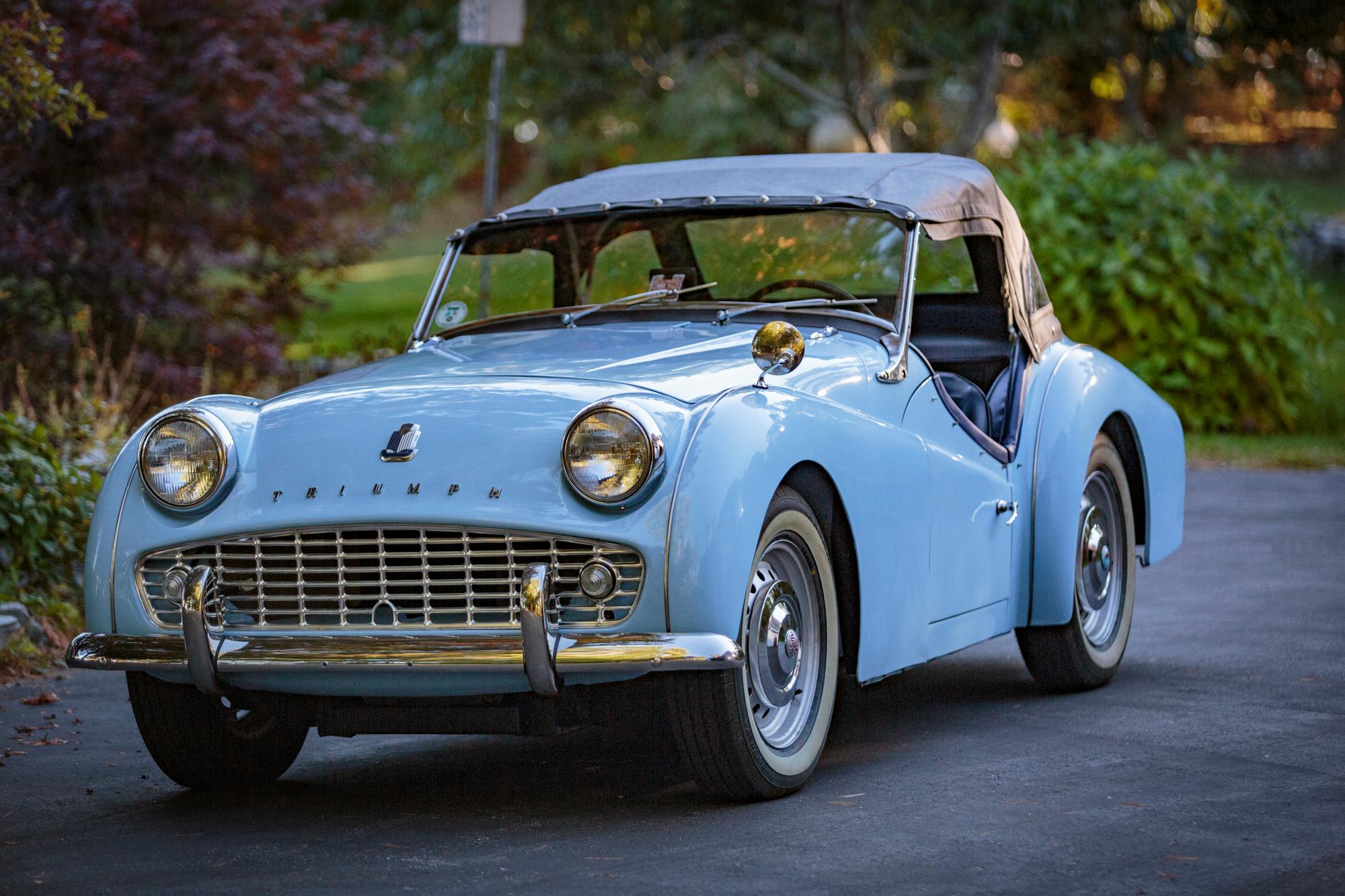 Silver-painted 15″ steel wheels wear Triumph-globe hubcaps and are mounted with Dimax Classic whitewall tires. The front bushings and shocks reportedly were replaced during the refurbishment, as were the tires, and the steering was rebuilt. Braking is provided by front discs and rear drums; the front calipers were rebuilt and the rotors, drums, and wheel cylinders were replaced.