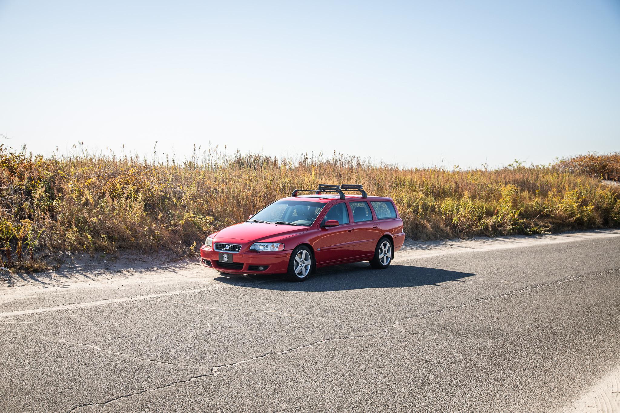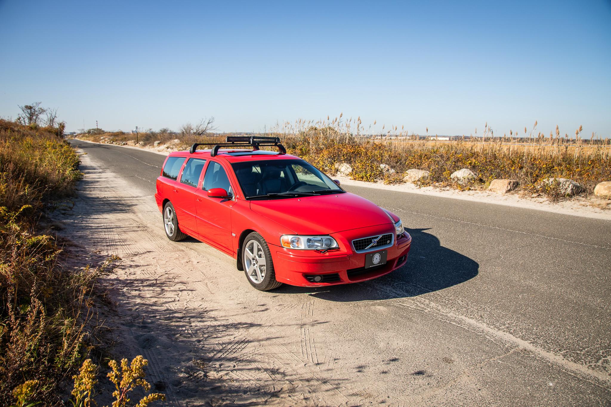The V70R was factory equipped with a Four-C electronically adjustable suspension, Dynamic Stability Traction Control (DSTC), and R-branded four-piston Brembo brake calipers. The 17″ Pegasus wheels are mounted with 235/45 Michelin Pilot Sport tires. The rear shocks were replaced in November 2023, and the front brake pads and rotors were replaced in 2024 along with the right-front wheel bearing, suspension control unit, and left-rear suspension level sensor.