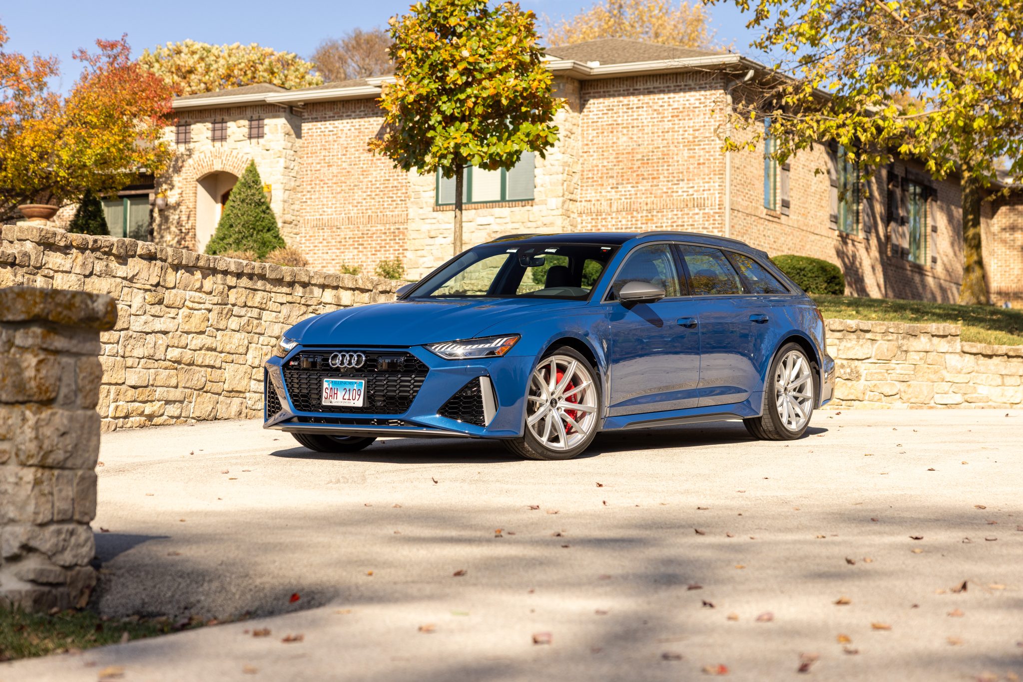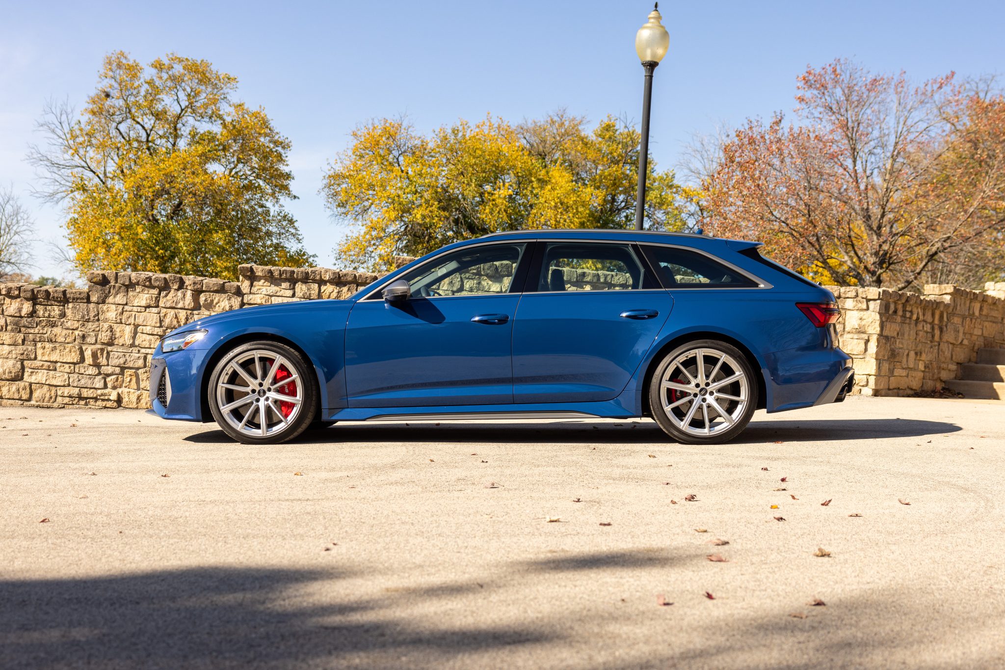 Audi Sport 21″ 10-spoke wheels are mounted with 275/35 Continental SportContact 6 tires. The car is equipped with rear-axle steering and an RS-tuned adaptive air suspension. Braking is handled by red RS-logo calipers mounted over cross-drilled and ventilated rotors that measure 16.5″ up front and 14.6″ out back. Curb rash is noted on the passenger’s rear wheel.