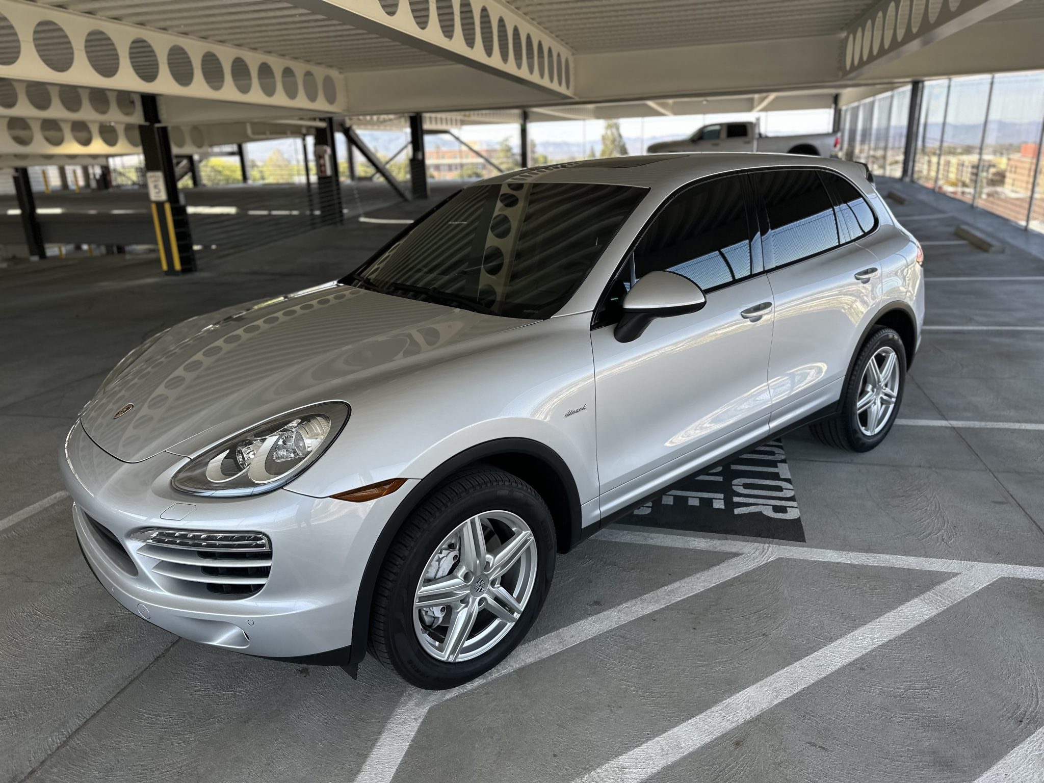 The 19″ Cayenne Design II alloy wheels are mounted with 265/50 Pirelli Scorpion Verde All Season tires. Stopping power is provided by silver-finished six-piston front and four-piston rear brake calipers over ventilated rotors at each corner. Rear brake service was reportedly completed in October 2024.
