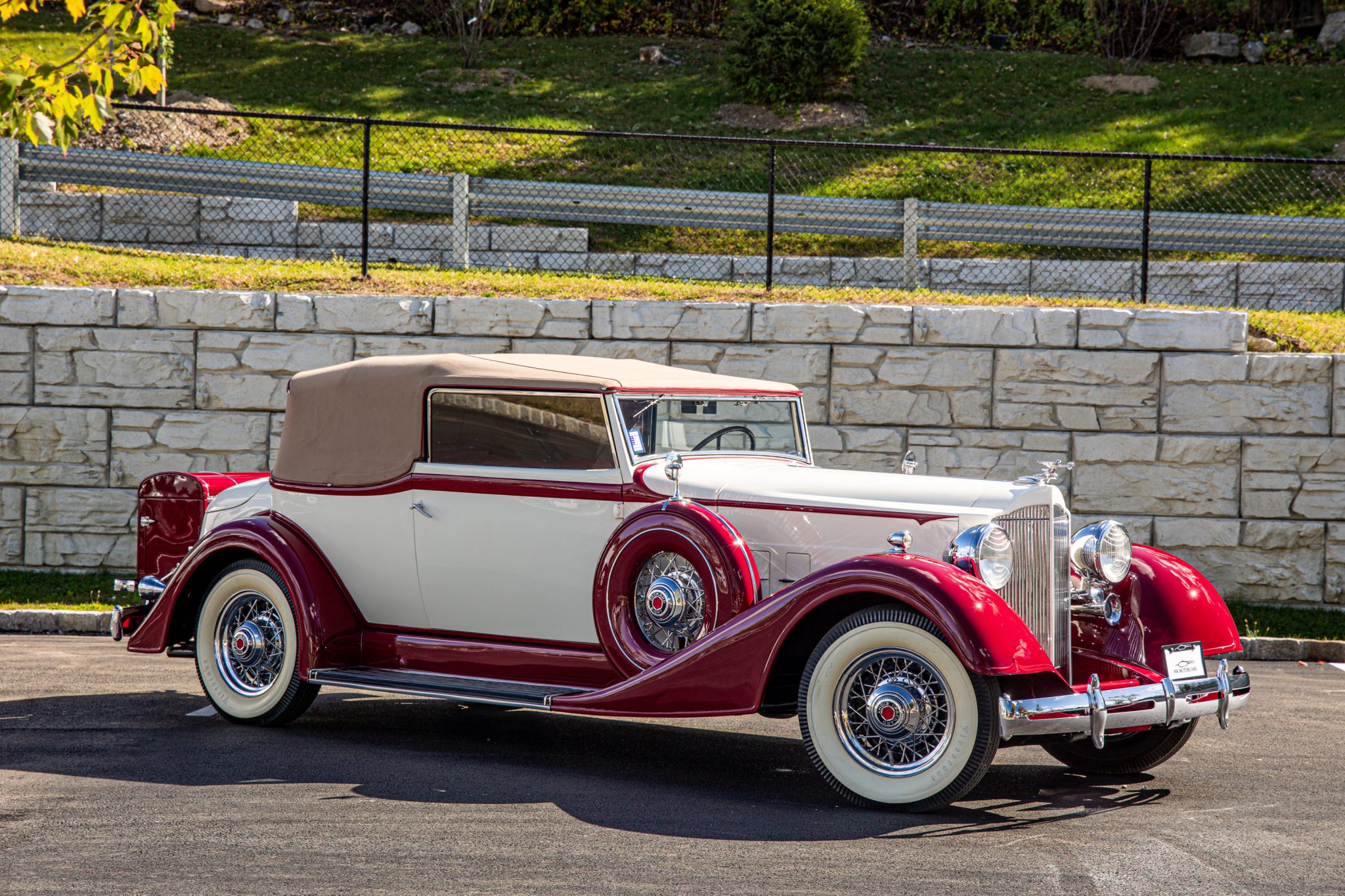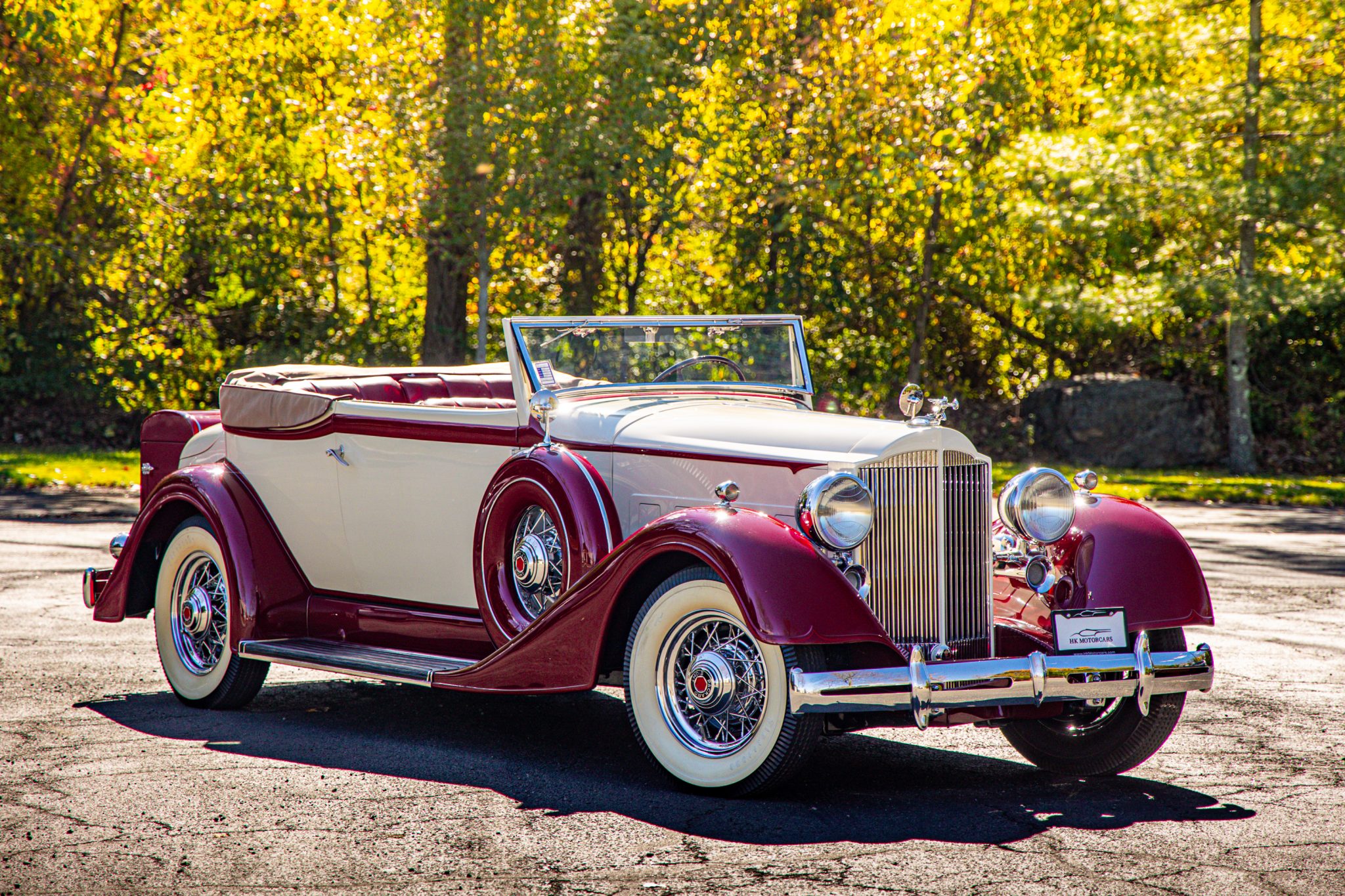 The body is said to have been repainted in its current color scheme of beige with maroon fenders and shoulder-line accents during the 1990s refurbishment, and various imperfections are noted in the finish. The frame was reportedly powder-coated during the 1990s project. Exterior features include chrome front and rear bumpers, thermostatically controlled grille shutters, a “Goddess of Speed” radiator mascot, an integrated trunk, and a fold-down rear luggage rack carrying a maroon-painted external trunk containing three suitcases. A CCCA Premier Senior First Prize Winner badge is affixed to the right cowl. Scratches and paint cracks are noted.