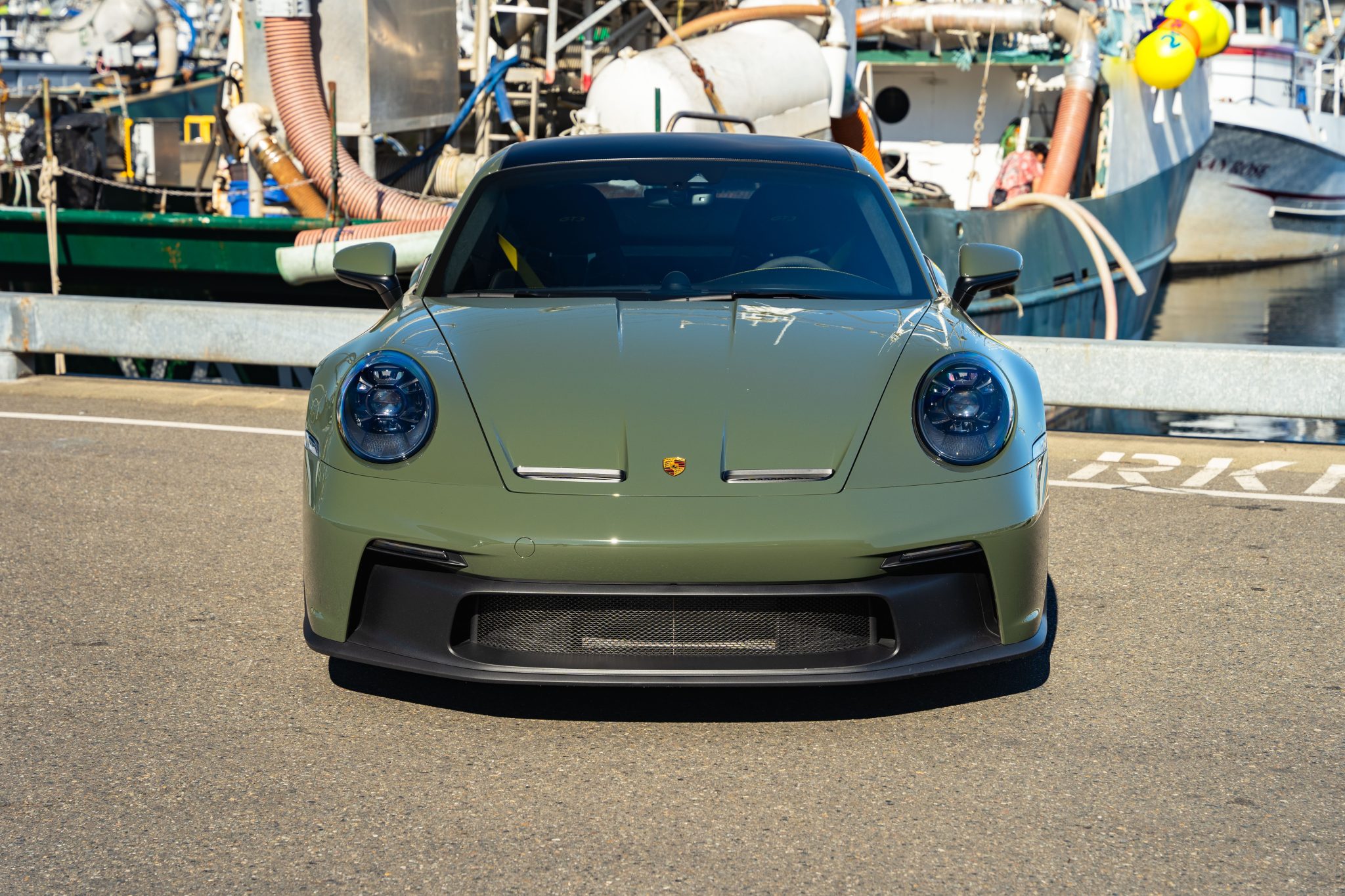 Satin Black-finished 20″ front and 21″ rear GT3 center-lock wheels are mounted with Goodyear Eagle F1 tires. Stopping power is provided by Porsche Ceramic Composite Brakes (PCCB) with yellow calipers over cross-drilled and ventilated discs at each corner. The car is equipped with a front-axle lift system and rear-axle steering.