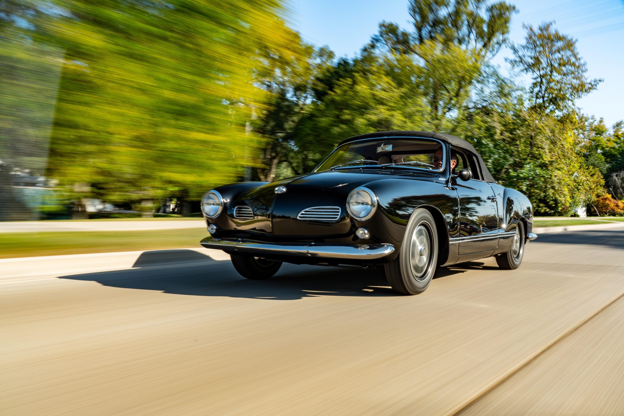 The car has been fitted with an adjustable front axle beam, an EMPI steering box, KYB Gas-a-Just shocks, a rear camber compensator, and four-wheel disc brakes in addition to a set of 15″ Möbelwagen 730M Schnell wheels wrapped in 155-series Vredestein Sprint Classic tires and mounted with 5x205mm to 4x130mm wheel adapters.