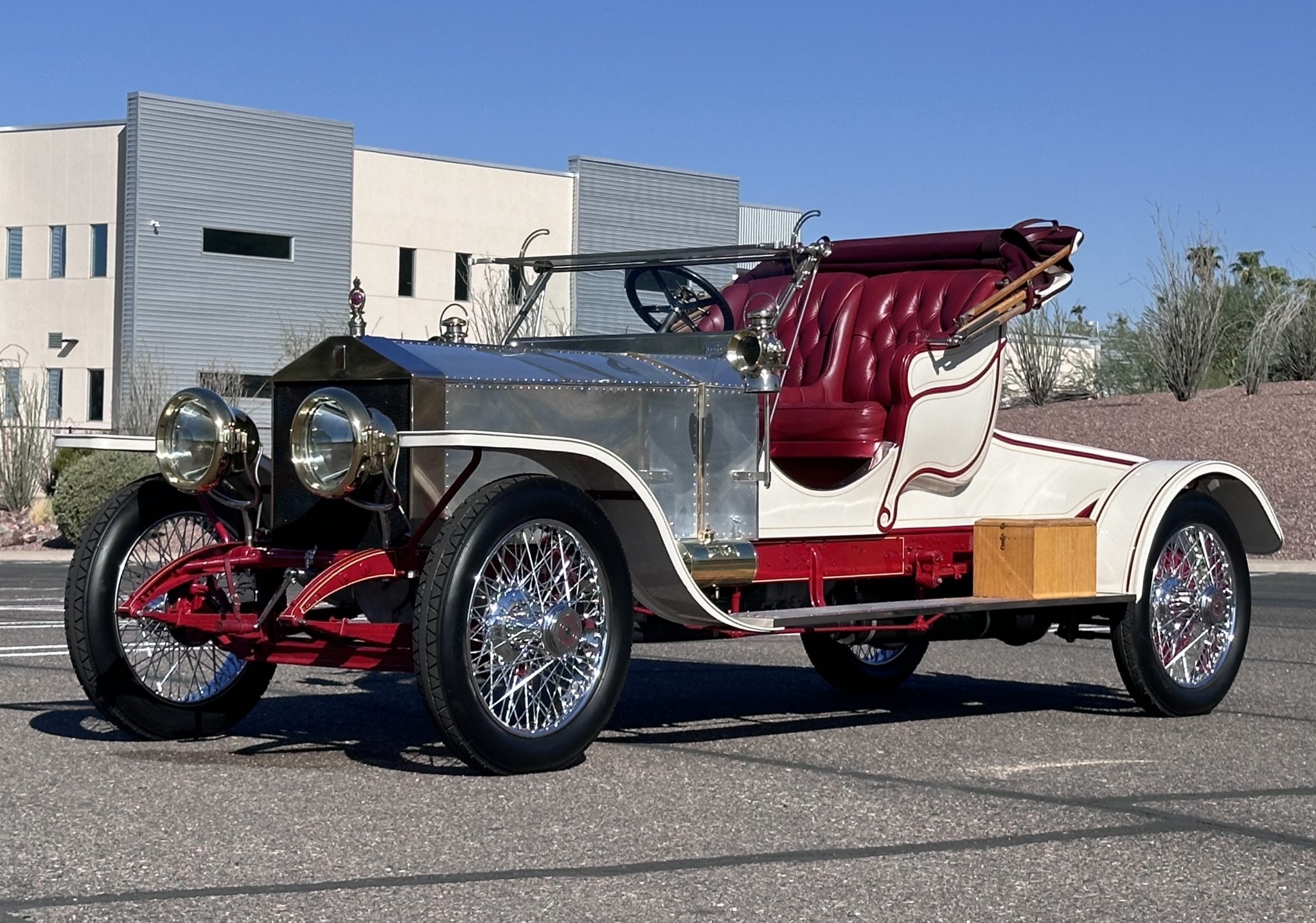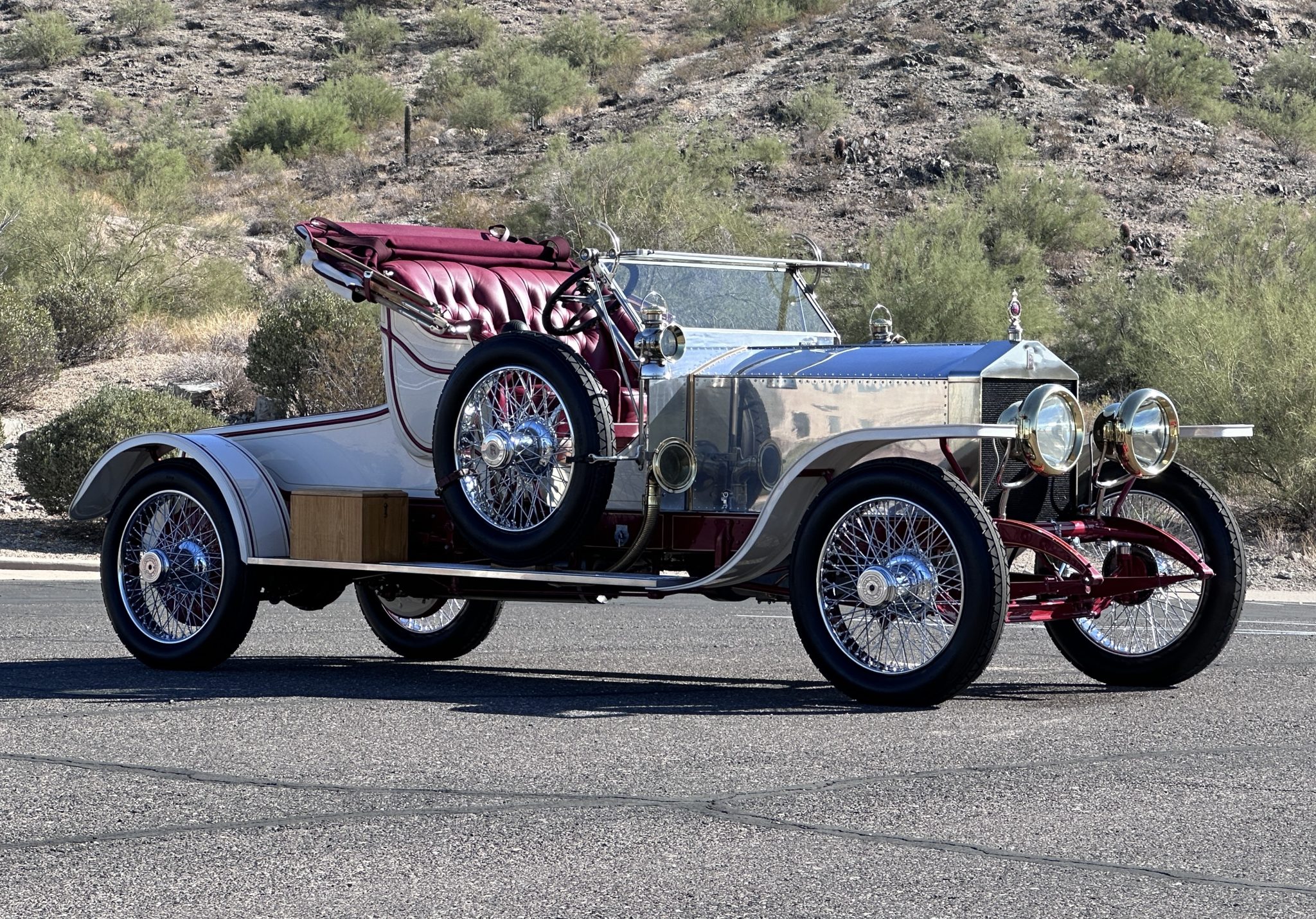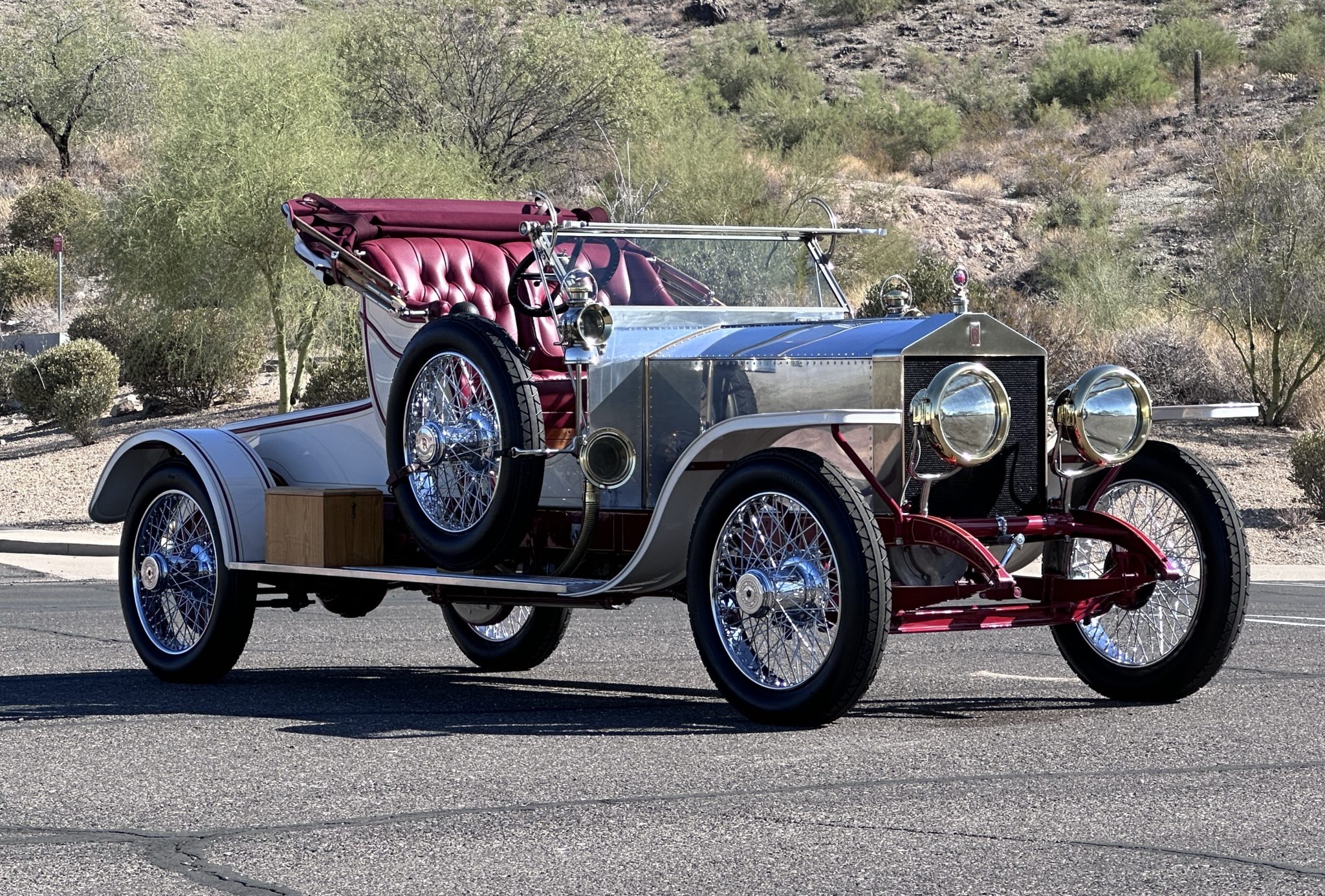 The re-creation bodywork was designed to fit the 144”-wheelbase chassis of later Silver Ghosts instead of the shorter wheelbase of early models like the original balloon car, while the updated-style taller radiator was also retained. The body and fenders are finished in white with maroon and gold accents, while the cowl and hood are constructed from exposed riveted aluminum panels. Features include CAV electric headlights, cowl-mounted Lucas King of the Road oil lamps, lantern-style electric taillamps, a fold-down windshield, wood running boards hosting storage boxes, and a white convertible top with maroon accents. One of the hood bows was replaced in 2018, and turn signals were added in 2024. A balloon basket is included in the sale, as is a removable aluminum rack that can be mounted over the rear deck.