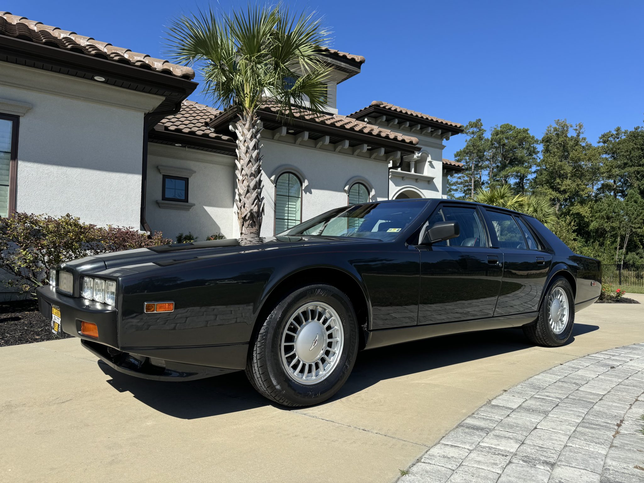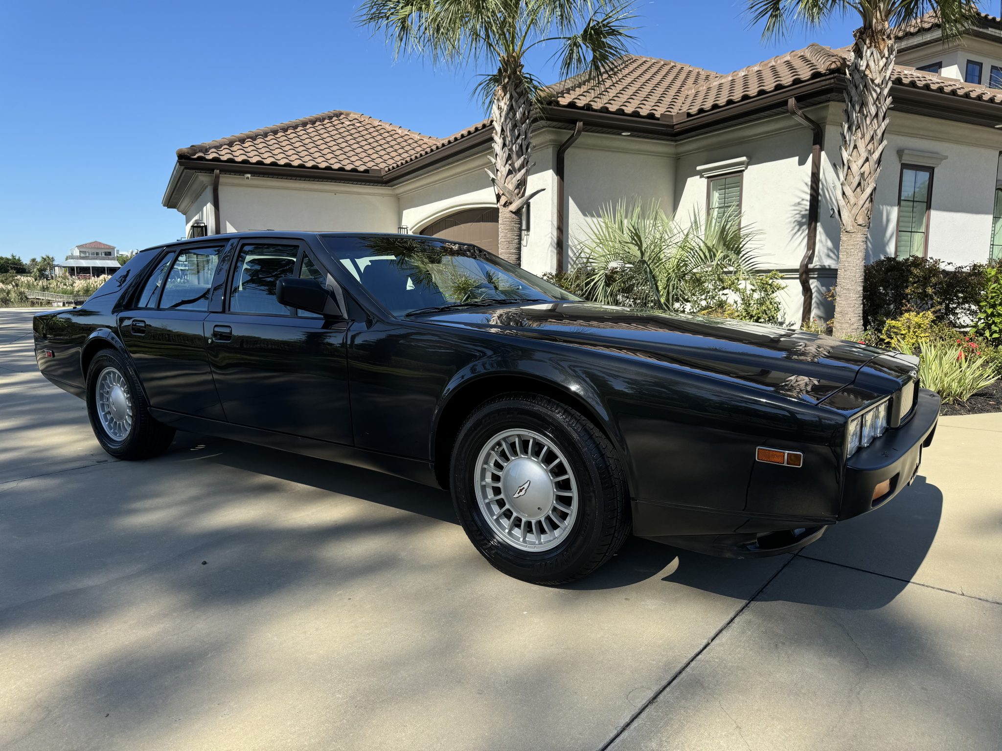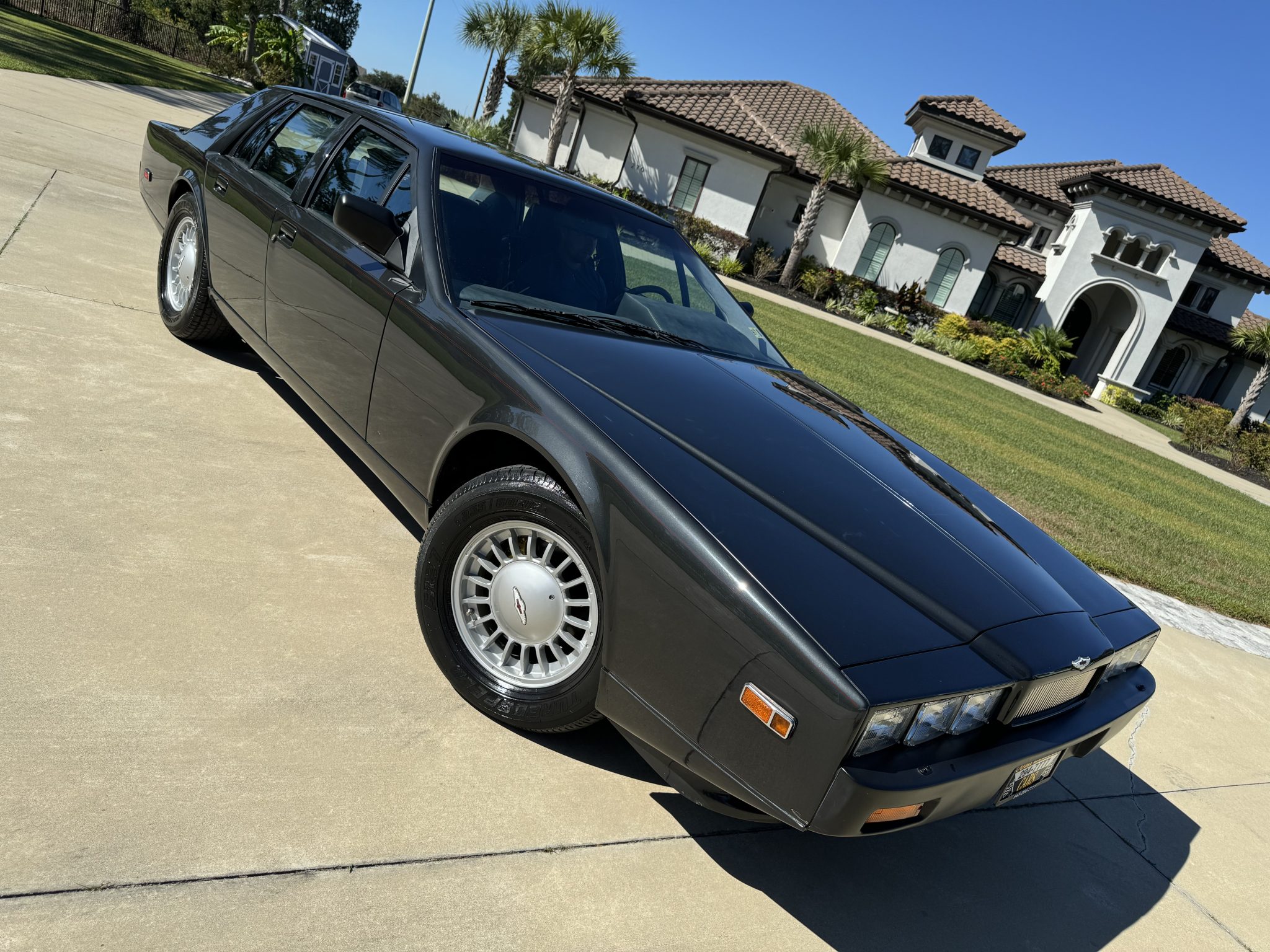 Silver-finished 16” alloy wheels wear Lagonda-branded center caps and are mounted with older 255/60 Avon Turbospeed CR27 tires. The car rides on a fully independent suspension, and braking is handled by four-wheel discs that are inboard-mounted out back. The parking brake switch was adjusted in May 2024.