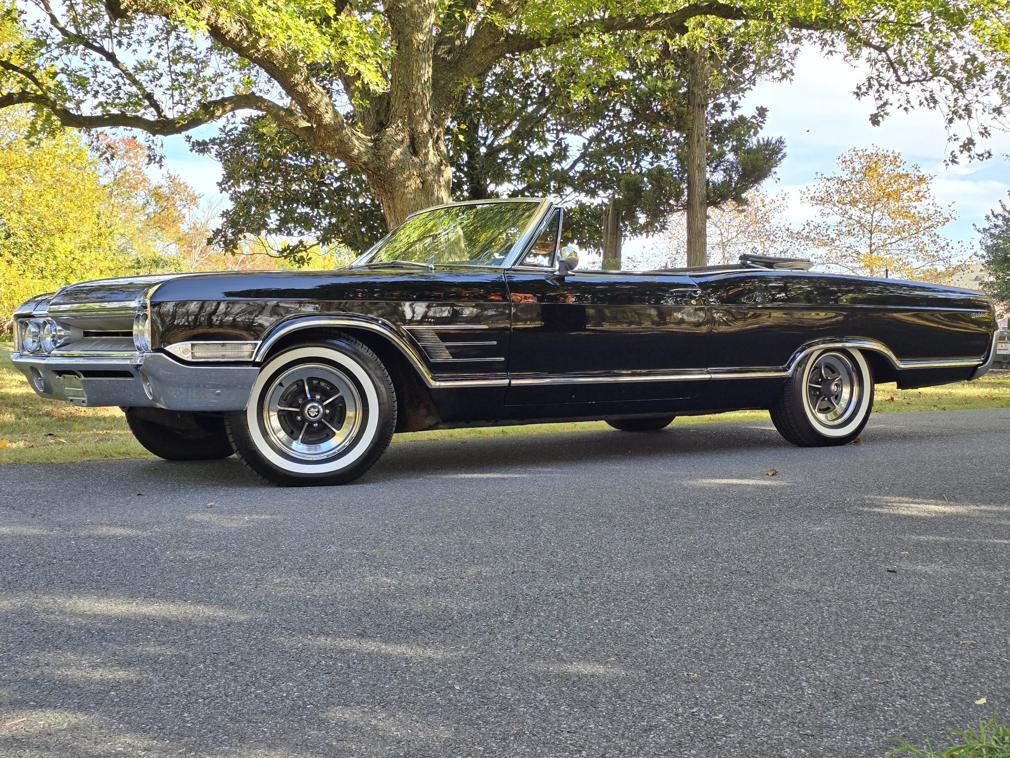 Chrome-accented Rally 15″ wheels with Wildcat-logo center caps are mounted with American Classic whitewall tires; a steel spare with a Wildcat cover is housed in the trunk. Braking is provided by power-assisted front discs and rear drums. The steering is also power assisted, and the car rides on front and rear coil springs.