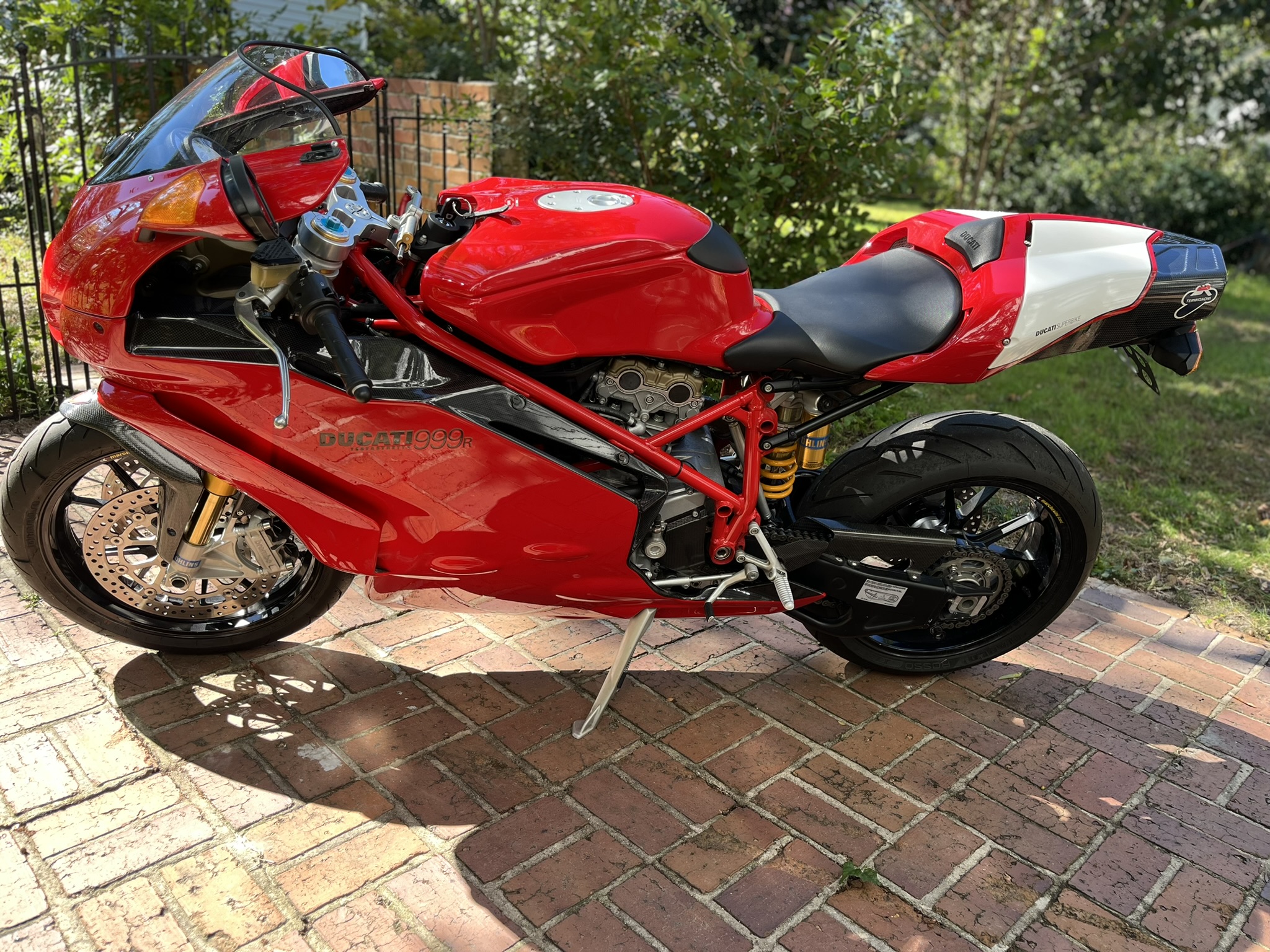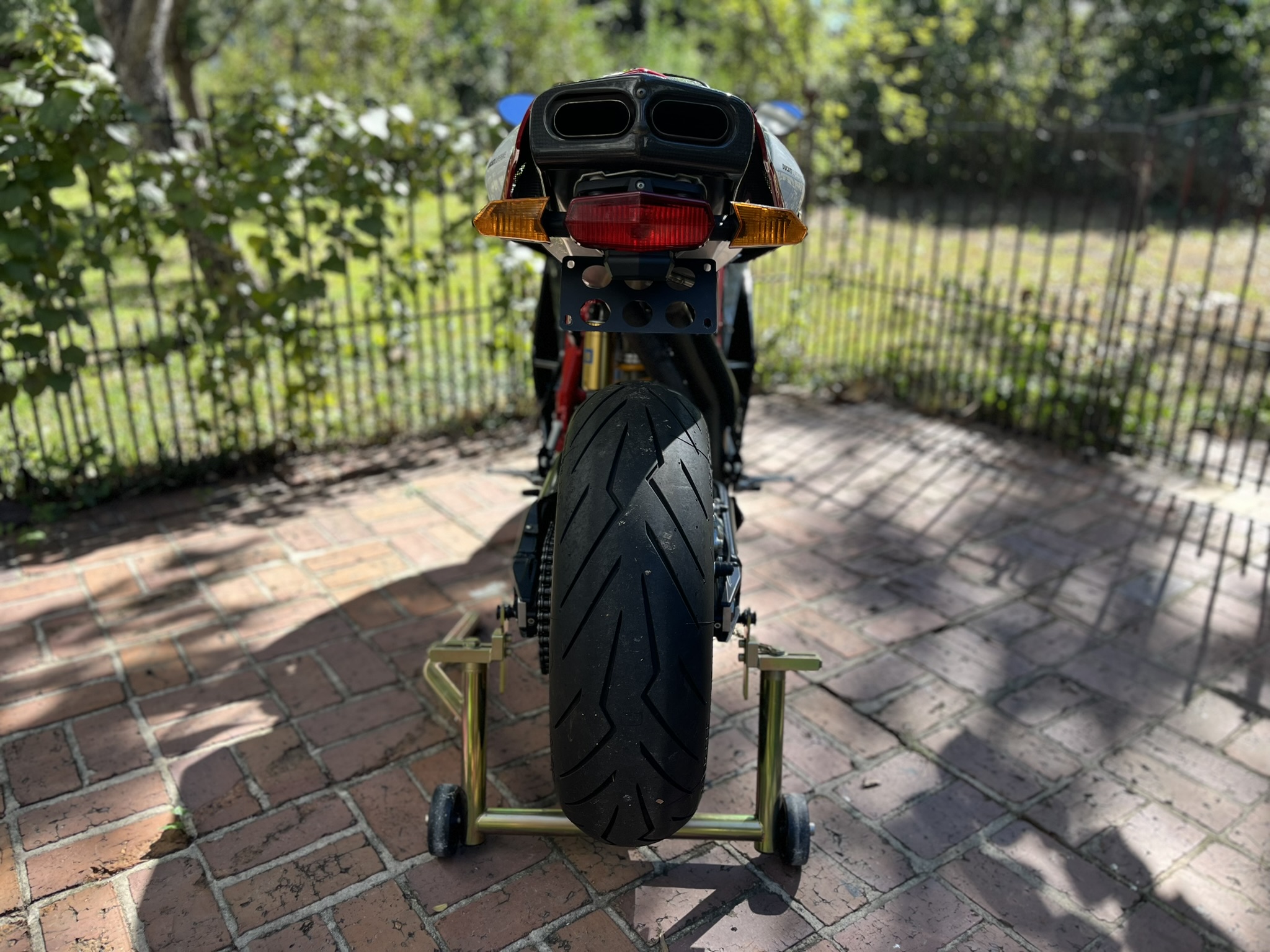 Marchesini 17″ forged alloy wheels are finished in black and wrapped in Pirelli Diablo Rosso III tires. Adjustable Öhlins suspension consists of an inverted 43mm fork with titanium nitride-coated stanchions in addition to a piggyback monoshock attached to the swingarm via progressive linkage. Braking is provided by radially mounted four-piston Brembo calipers fitted over dual 320mm discs up front and a two-piston caliper mounted over a single 240mm disc at the rear. The right fork seal is noted to leak.
