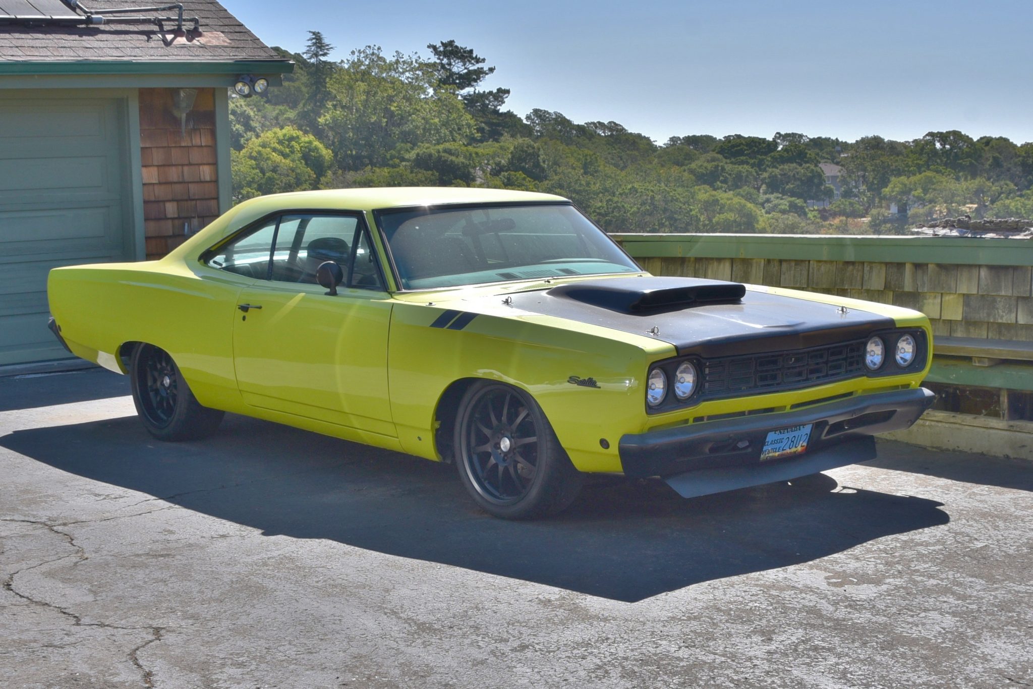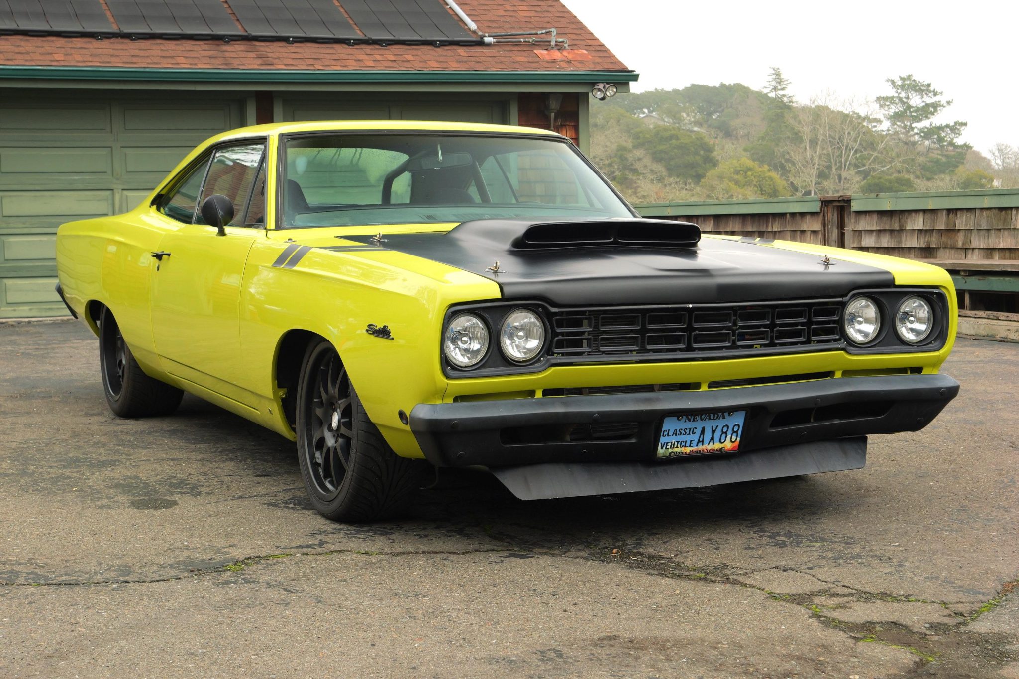 Black-finished 18″ BSA Motorsports alloy wheels are wrapped in Sumitomo HTRZ tires measuring 235/40 in front and 275/40 at the rear. Chassis modifications include subframe connectors, an engine-compartment brace, 1″ torsion bars, ADDCO front and rear sway bars, tubular upper control arms, braced lower control arms, 11/16″ tie rods with solid adjustment sleeves, rearward-mounted circle-track-spec rear leaf springs, polyurethane suspension bushings, quick-ratio steering, a Mopar Performance master cylinder, drilled and slotted 12″ brake rotors, and Wilwood four-piston calipers. Corrosion is visible on the brake rotors. The seller states that the lower control arms and the steering and its linkage are components that were offered in the late 1960s by Chrysler to builders of racing cars.