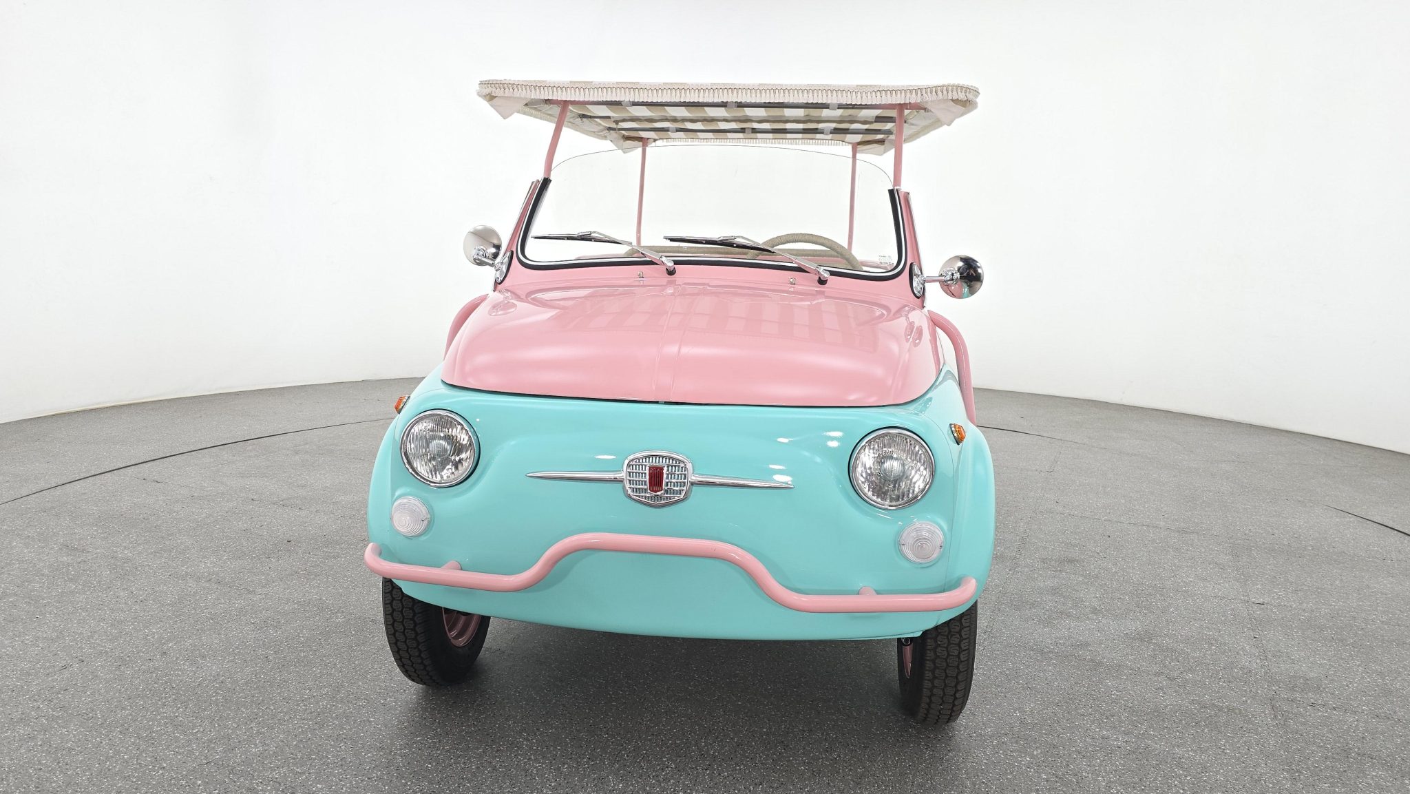 The 12″ wheels have bright covers, while the Deestone tires are trimmed with whitewall inserts, and a matching spare is stored in the front trunk. Replacement brake hoses, drums, shoes, and wheel cylinders are noted.