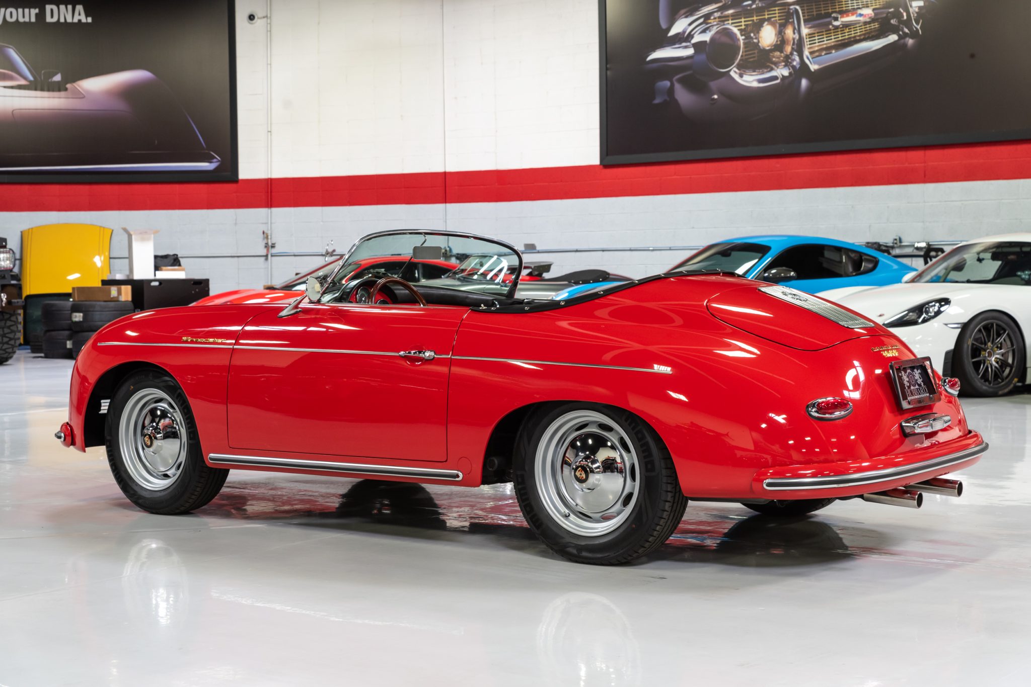 The 15″ Vintage 190 wheels wear chrome-finished hubcaps with full-color Porsche-crest centers and are mounted with 195/65 MOMO Outrun M20 Pro tires. Stopping power is provided by four-wheel disc brakes.
