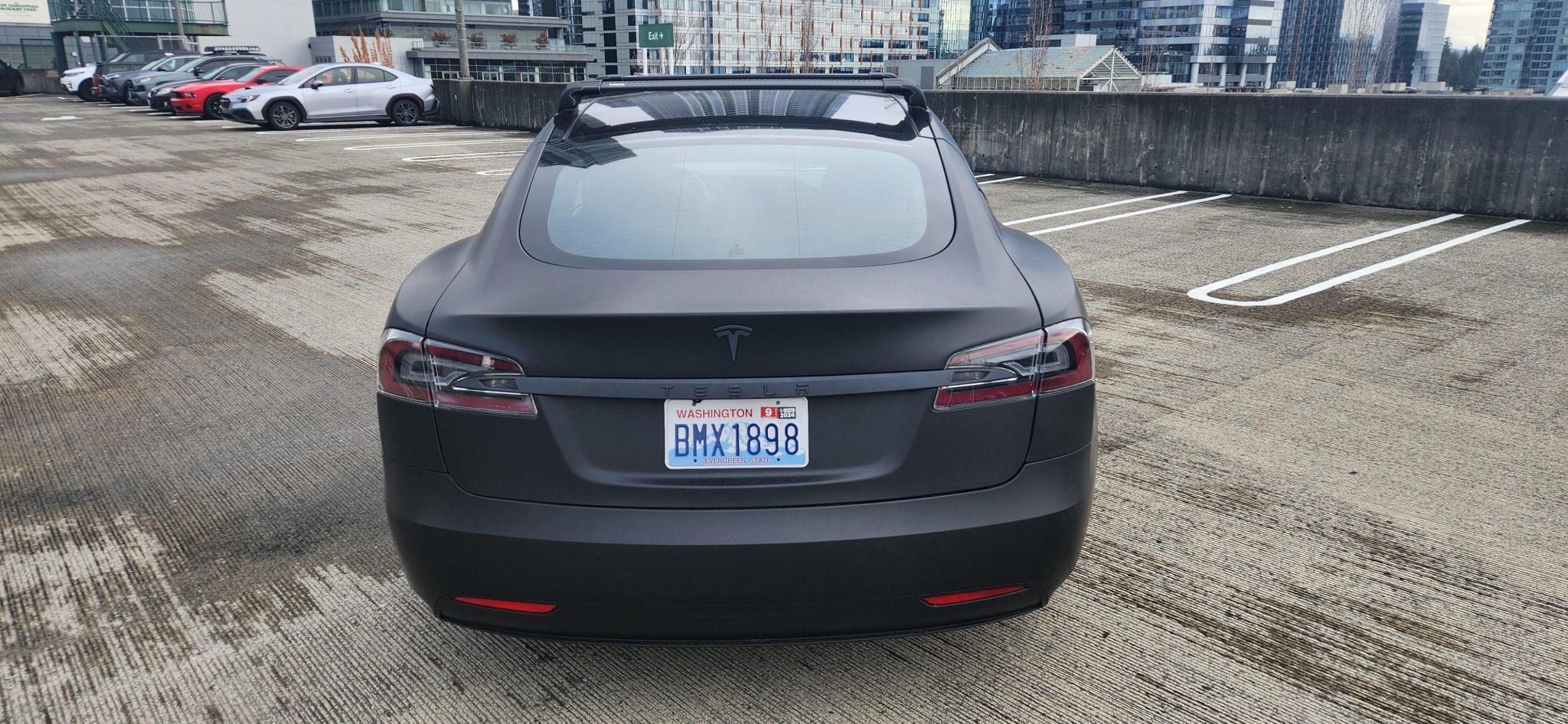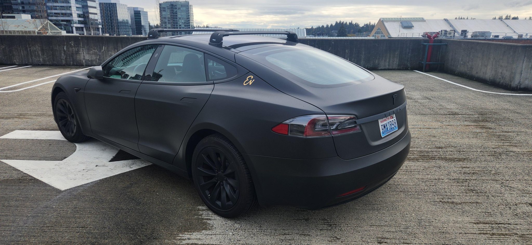 Slipstream 19″ alloy wheels have been finished in black and show curb rash. The selling dealer notes that the air suspension was repaired in preparation for the sale. Braking is handled by a regenerative braking system as well as four-piston aluminum calipers over vented discs at all four corners.