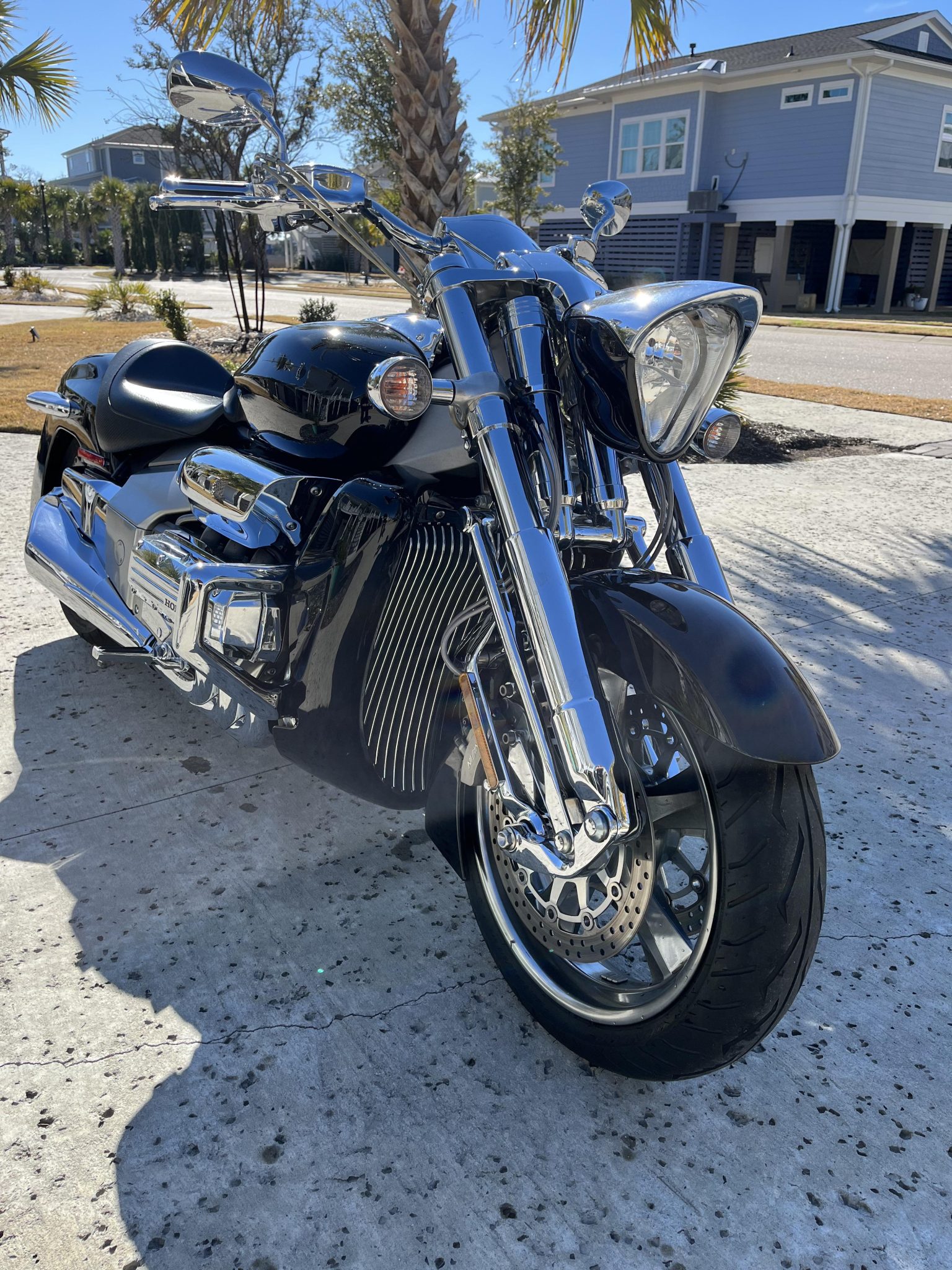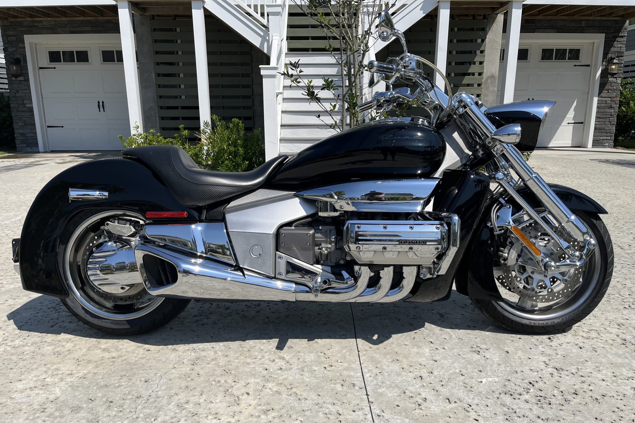 Five-spoke aluminum wheels measuring 18″ up front and 17″ out back were mounted with Dunlop tires in 2024. Suspension consists of a chrome-finished trailing-link fork along with a remote-reservoir monoshock that is attached to the single-sided swingarm via a Unit Pro-Link linkage. Braking is handled by Nissin three-piston calipers mounted over a pair of drilled rotors up front as well as a two-piston Nissin caliper fitted over a drilled rotor at the rear. A May 2024 service consisted of rebuilding the rear brake master cylinder and flushing the brake fluid. A scratch is visible on the rear wheel.