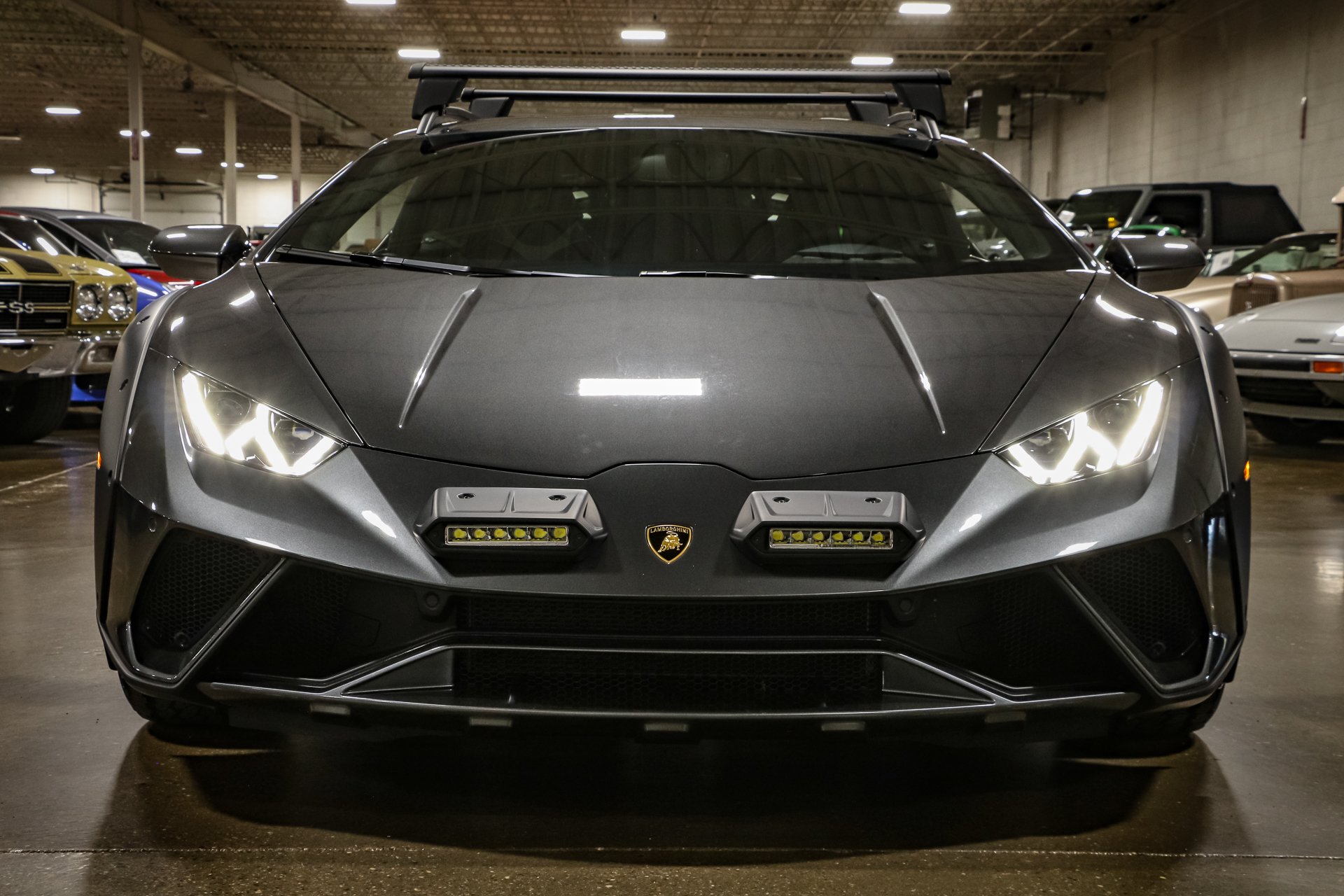Black 19″ Morus forged wheels are mounted with Bridgestone Dueler tires. The Sterrato features the Lamborghini Dinamica Veicolo Integrata (LDVI) system, which controls the torque vectoring, traction control, and all-wheel-drive systems. Stopping power is provided by carbon-ceramic disc brakes with green Lamborghini-branded calipers.
