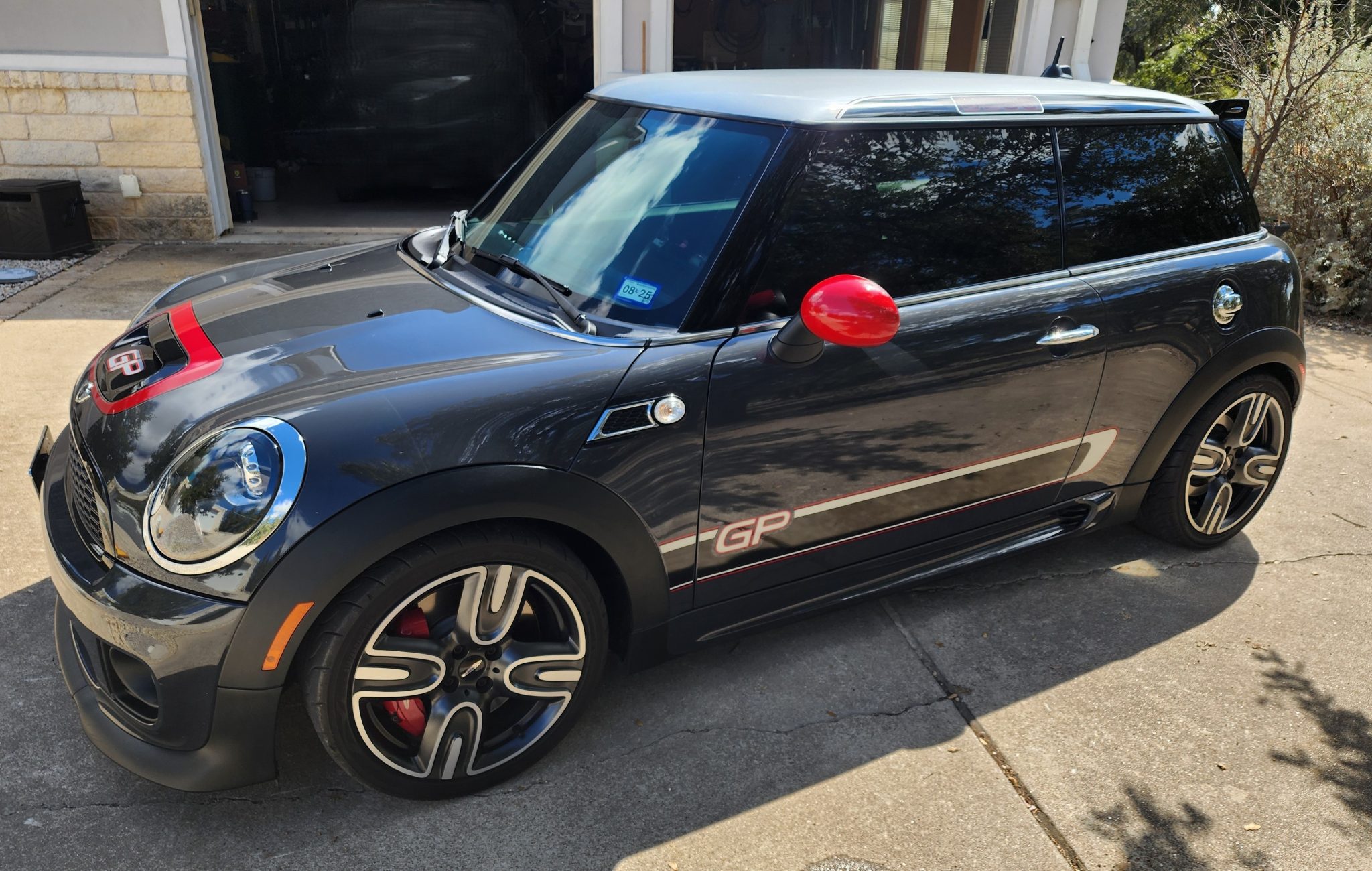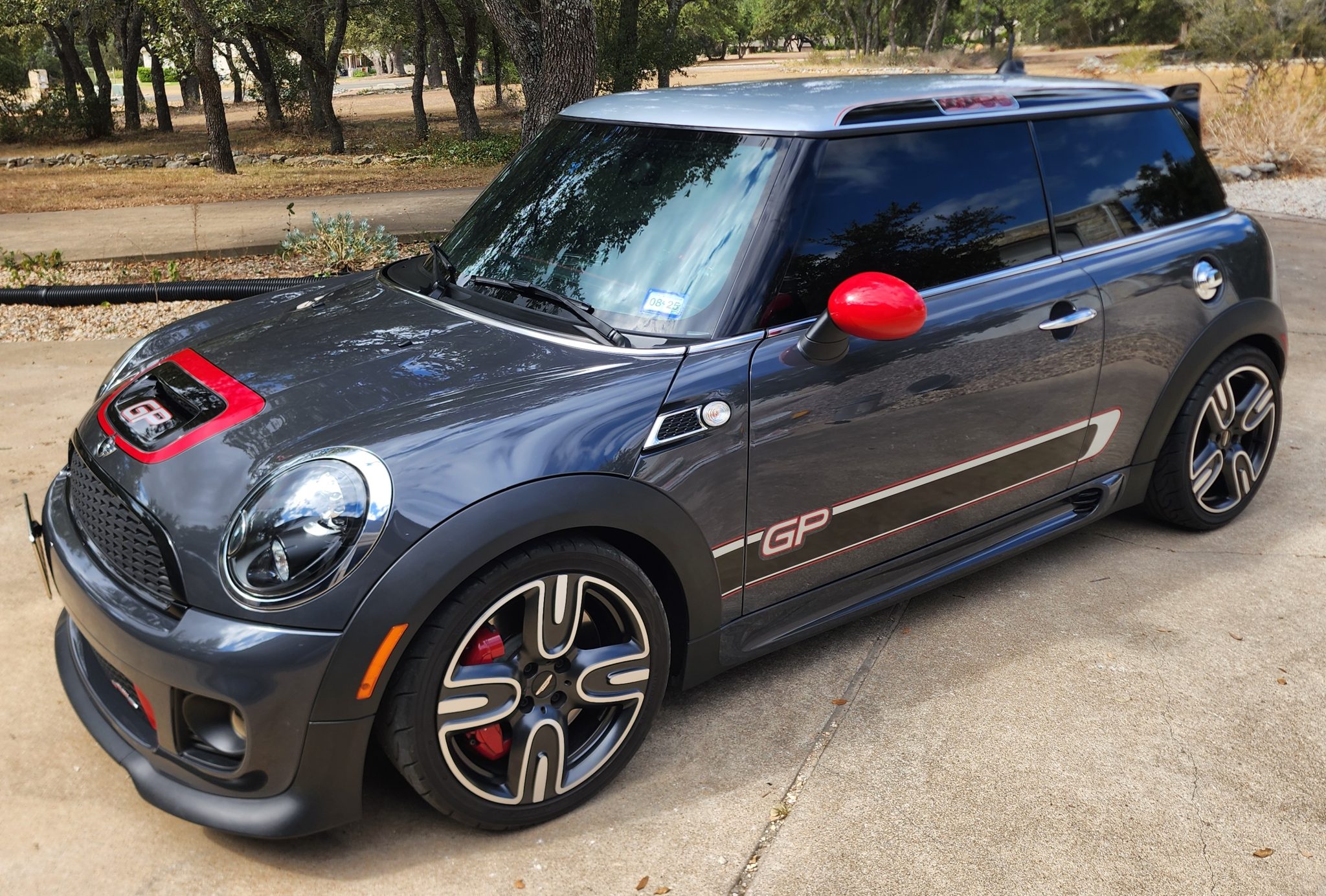 The 17″ John Cooper Works GP alloy wheels are mounted with Yokohama Advan Neova AD08 R tires measuring 215/40. The car is equipped with an adjustable coilover suspension, a front cross brace, and a GP-Mode Traction Control program that incorporates Electronic Differential Lock Control (EDLC). Braking is handled by four-wheel ventilated discs with Brembo six-piston front calipers.