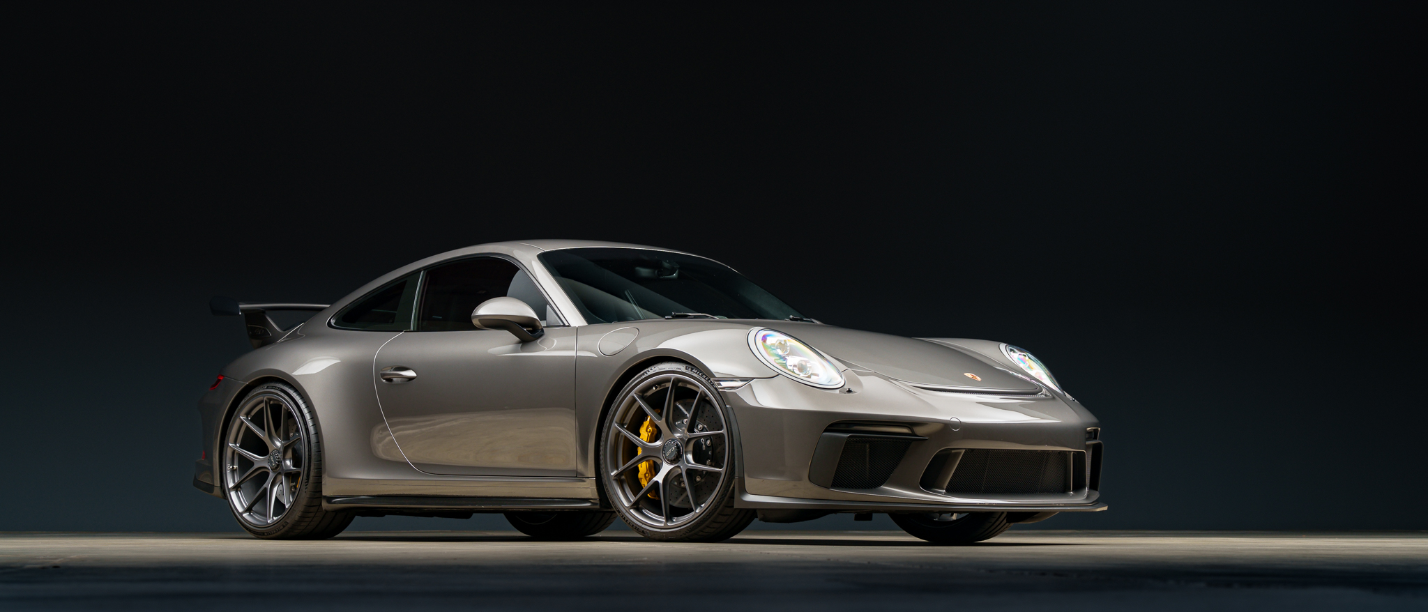 The 21″ HRE center-lock wheels are mounted with Michelin Pilot Sport 4s tires. Braking is handled by yellow Porsche-branded calipers over ceramic-composite rotors. The car is equipped with a front-axle lift system, rear-axle steering, and Porsche Active Suspension Management. The right-side wheels were repaired in preparation for the sale.