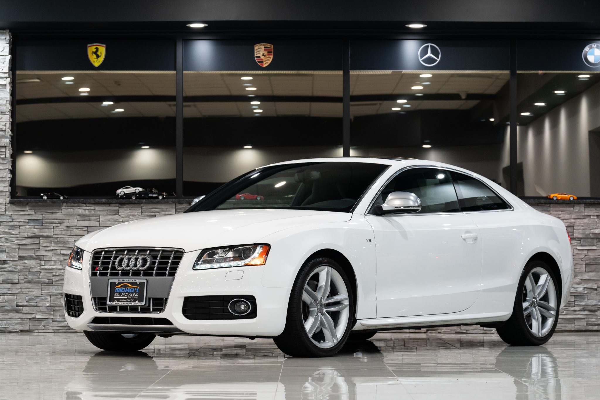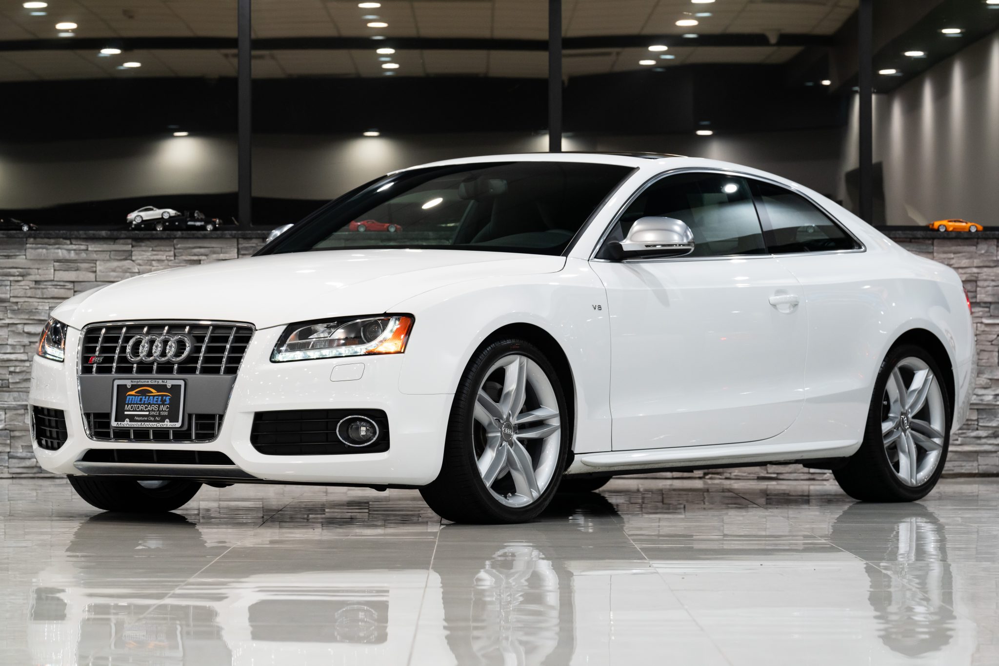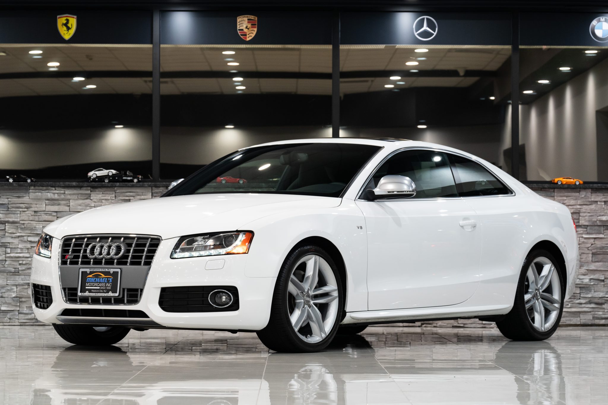 The 19″ double-five-spoke alloy wheels are mounted with Pirelli P Zero tires. The car is equipped with electronic stability control and speed-sensitive power steering. Stopping power is provided by four-wheel disc brakes with S5-branded front calipers.