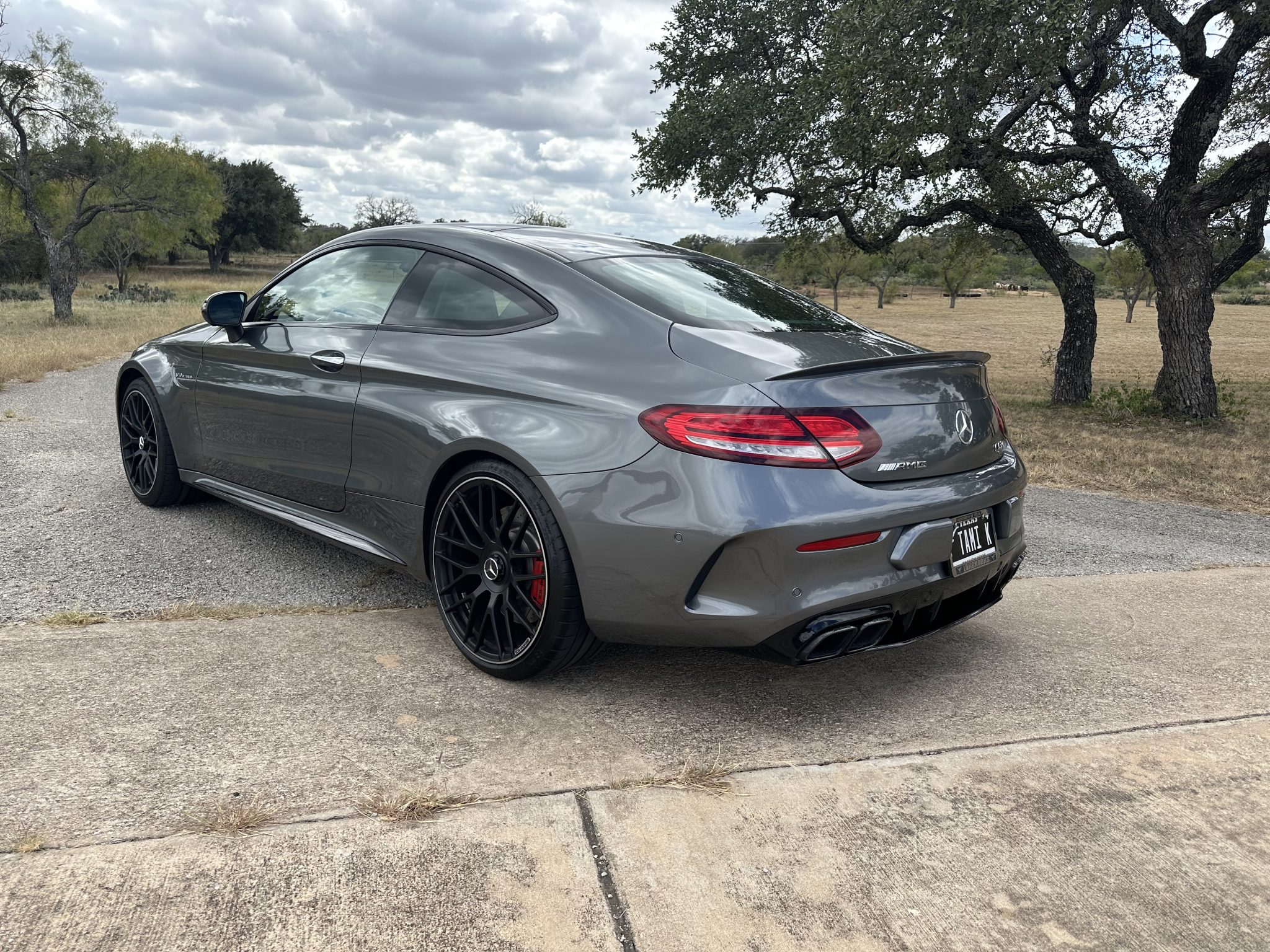 The 19″ black-finished AMG cross-spoke forged wheels are mounted with Michelin tires. Braking is handled by red AMG-branded calipers over cross-drilled and slotted rotors, and the car is equipped with an AMG Ride Control sport suspension with three-stage adaptive damping.