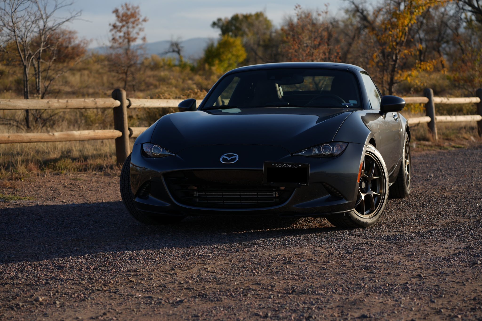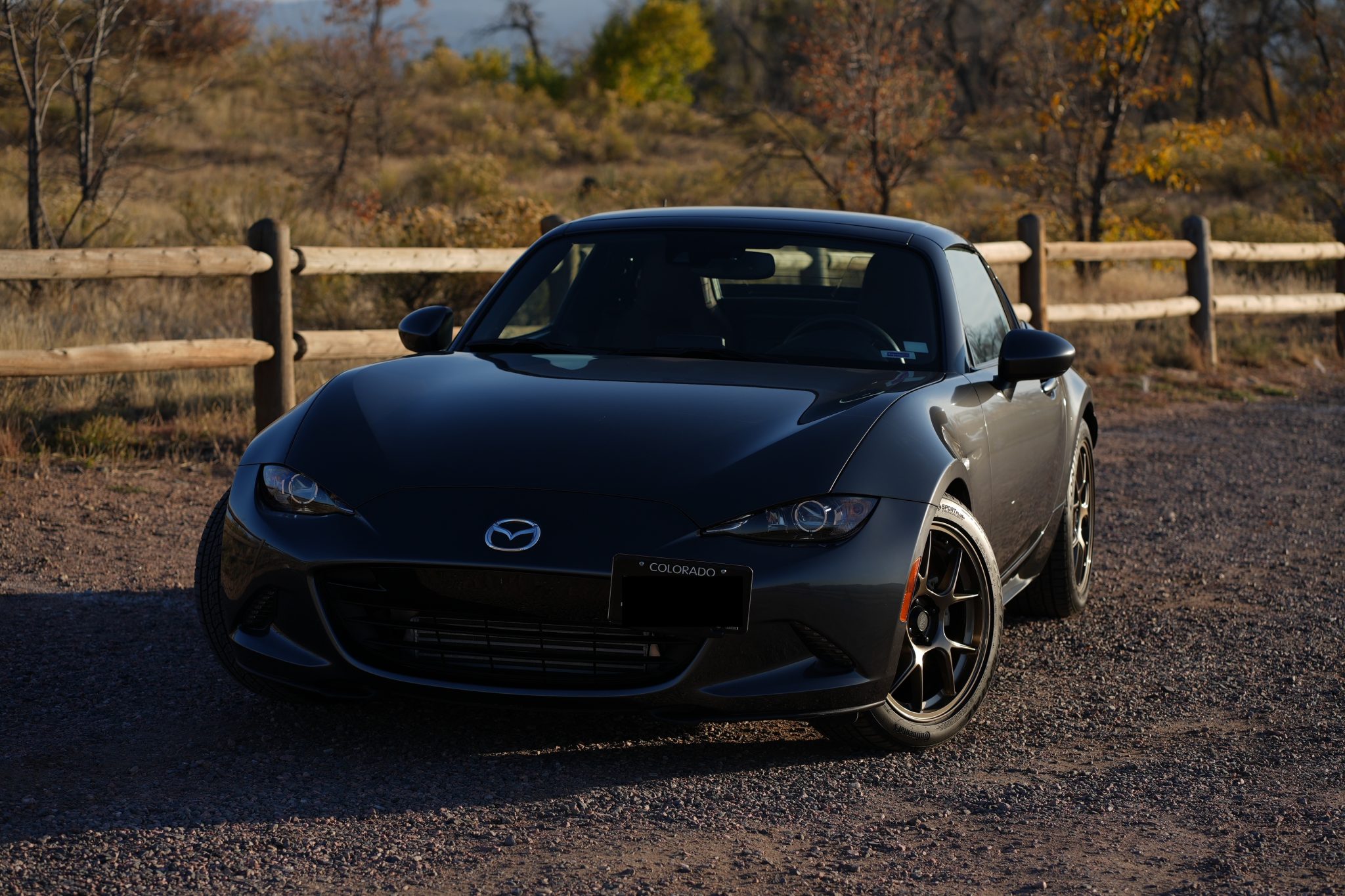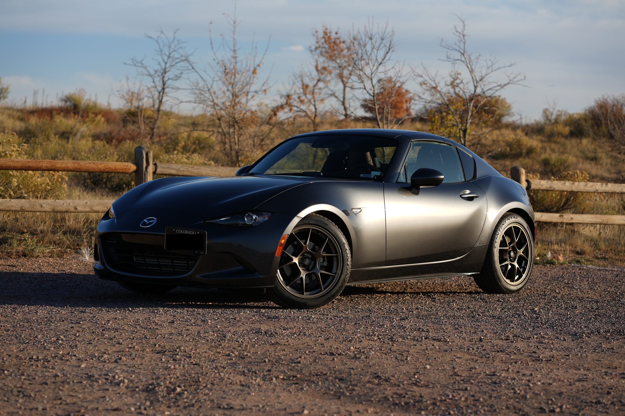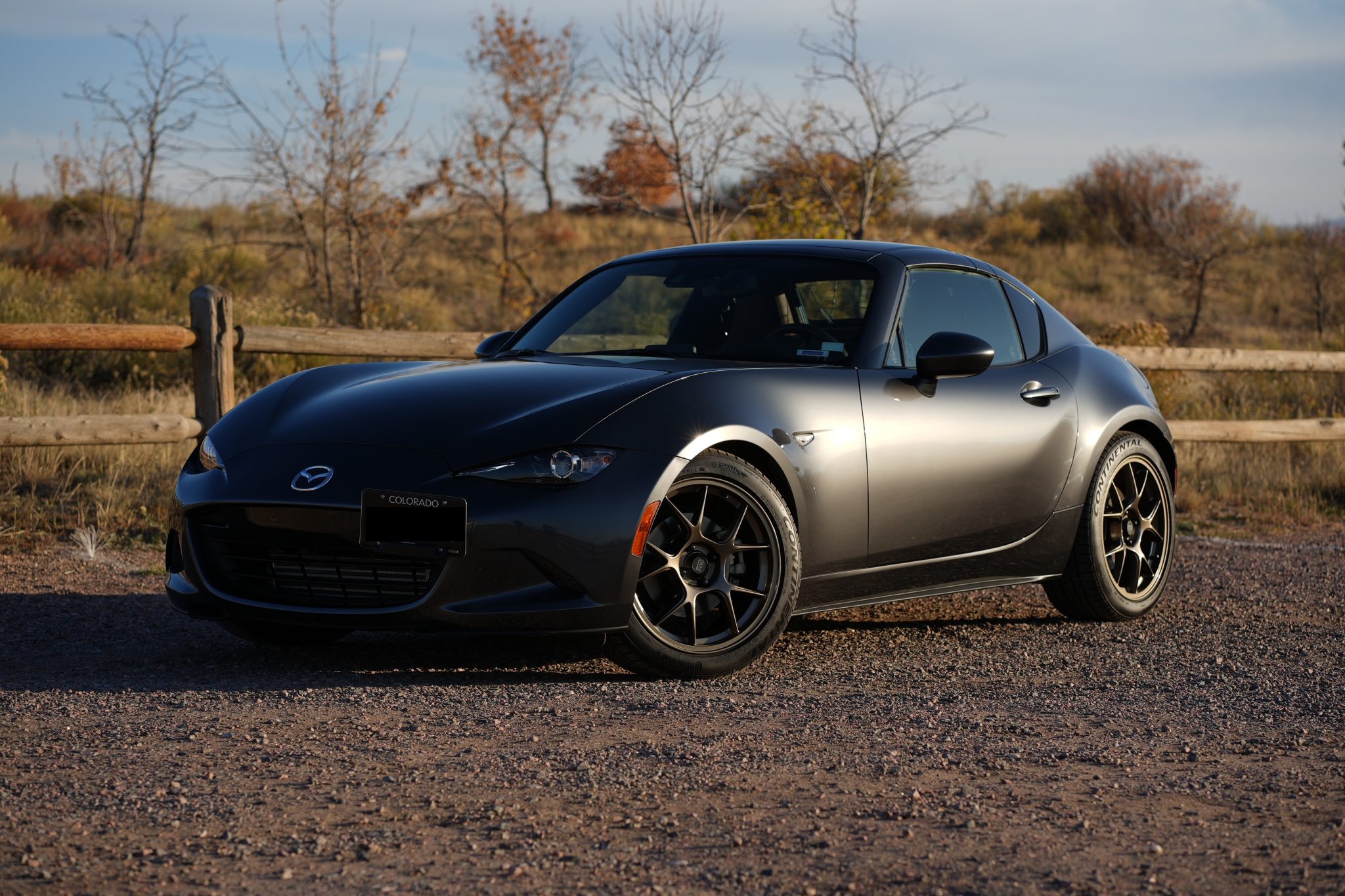 Bronze-finished 17×8” Kogeki wheels from Flyin’ Miata are mounted with 225/45 Continental ControlContact Sport tires. A Flyin’ Miata Koni Stage 2 suspension package was installed at Coyote Motors in June 2021 and includes upgraded sway bars and springs. The car is further equipped with Dynamic Stability Control, and braking is handled by four-wheel discs.