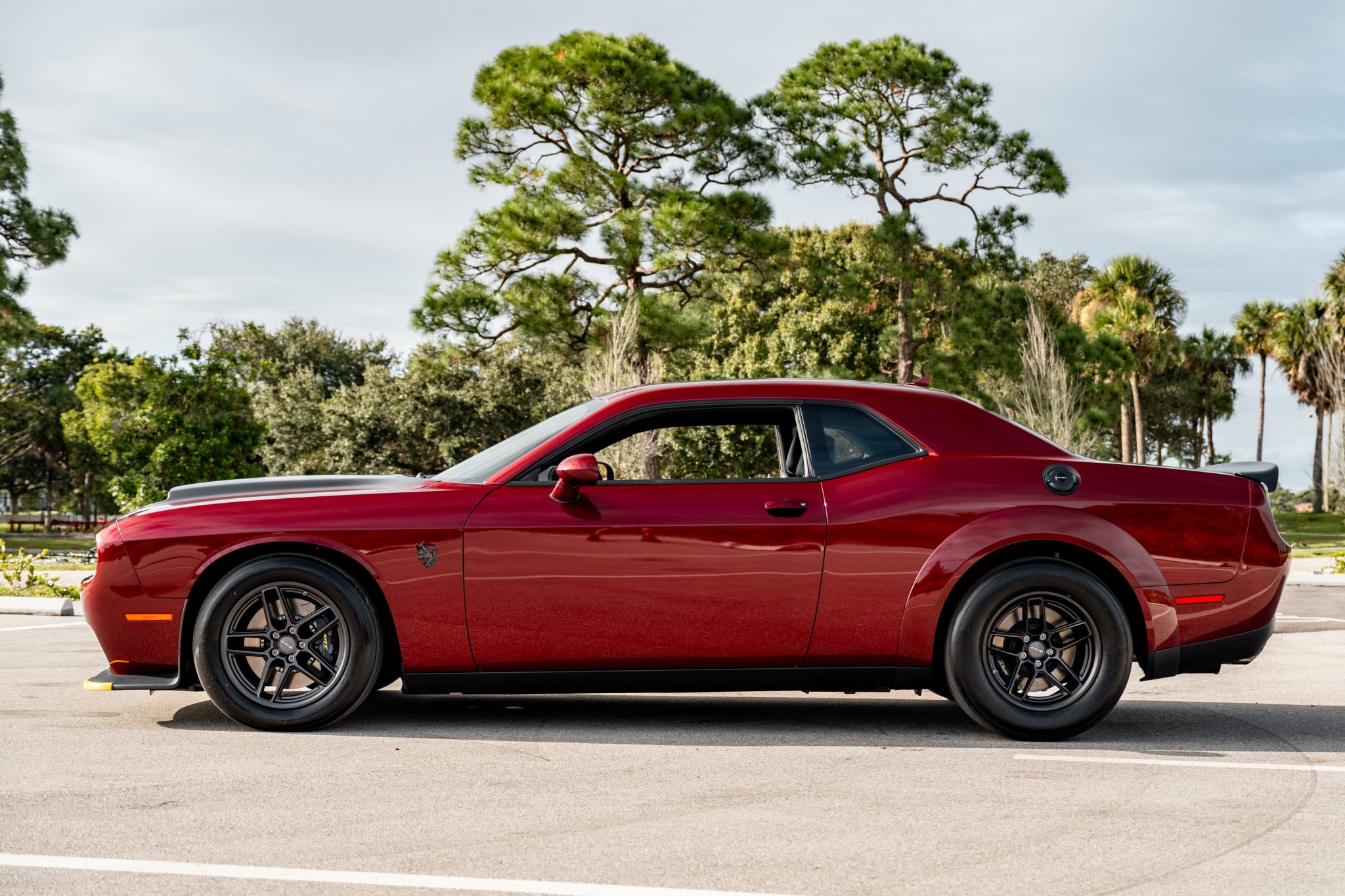 Black 18″ front and 17″ rear forged aluminum wheels are mounted with Mickey Thompson tires. Stopping power is provided by black four-piston Brembo calipers with yellow SRT lettering over ventilated discs. The Demon 170 is equipped with an edition-specific Drag Mode suspension with adaptive-damping shocks as well as launch control, a line lock, and a revised transbrake.