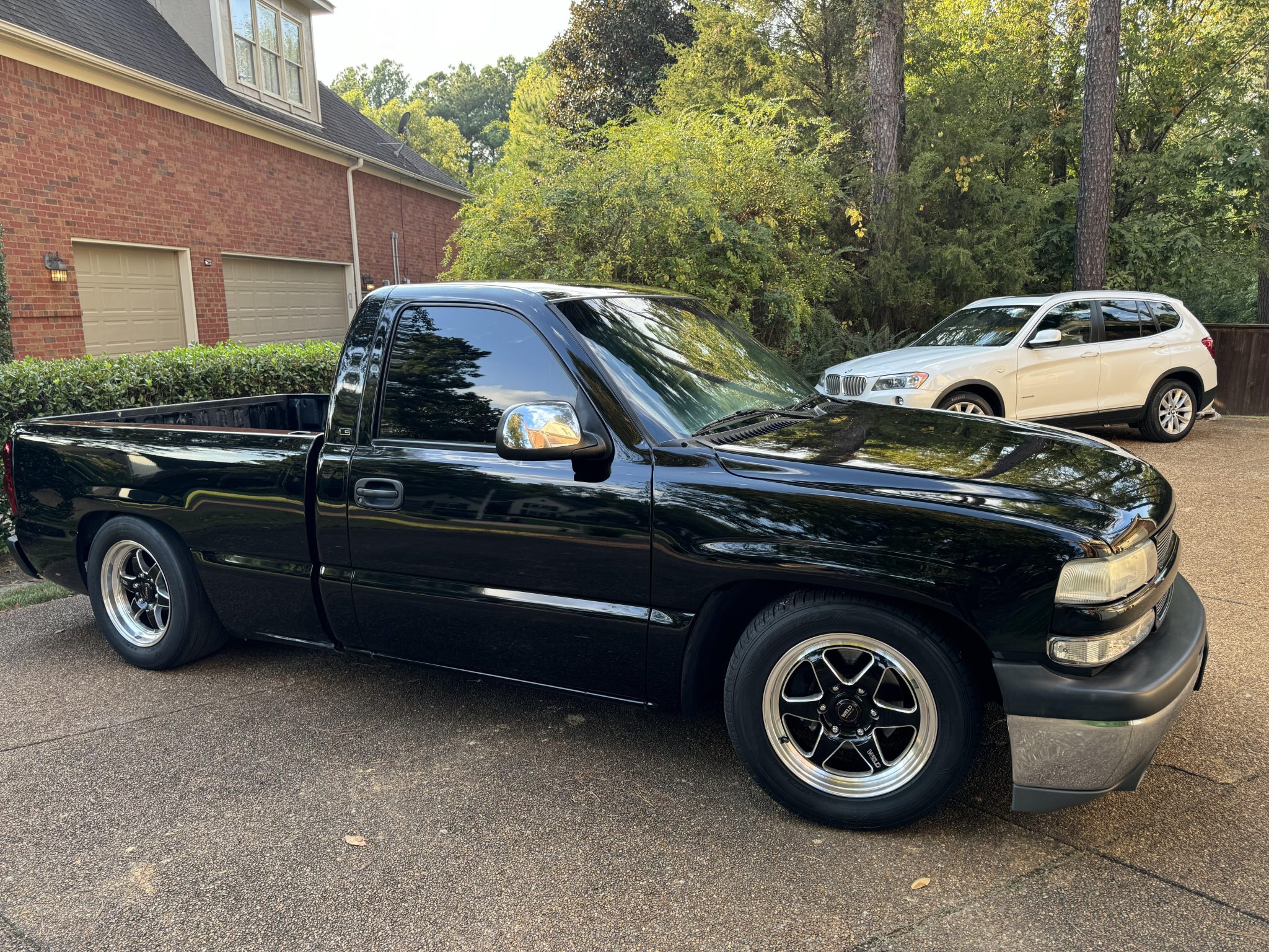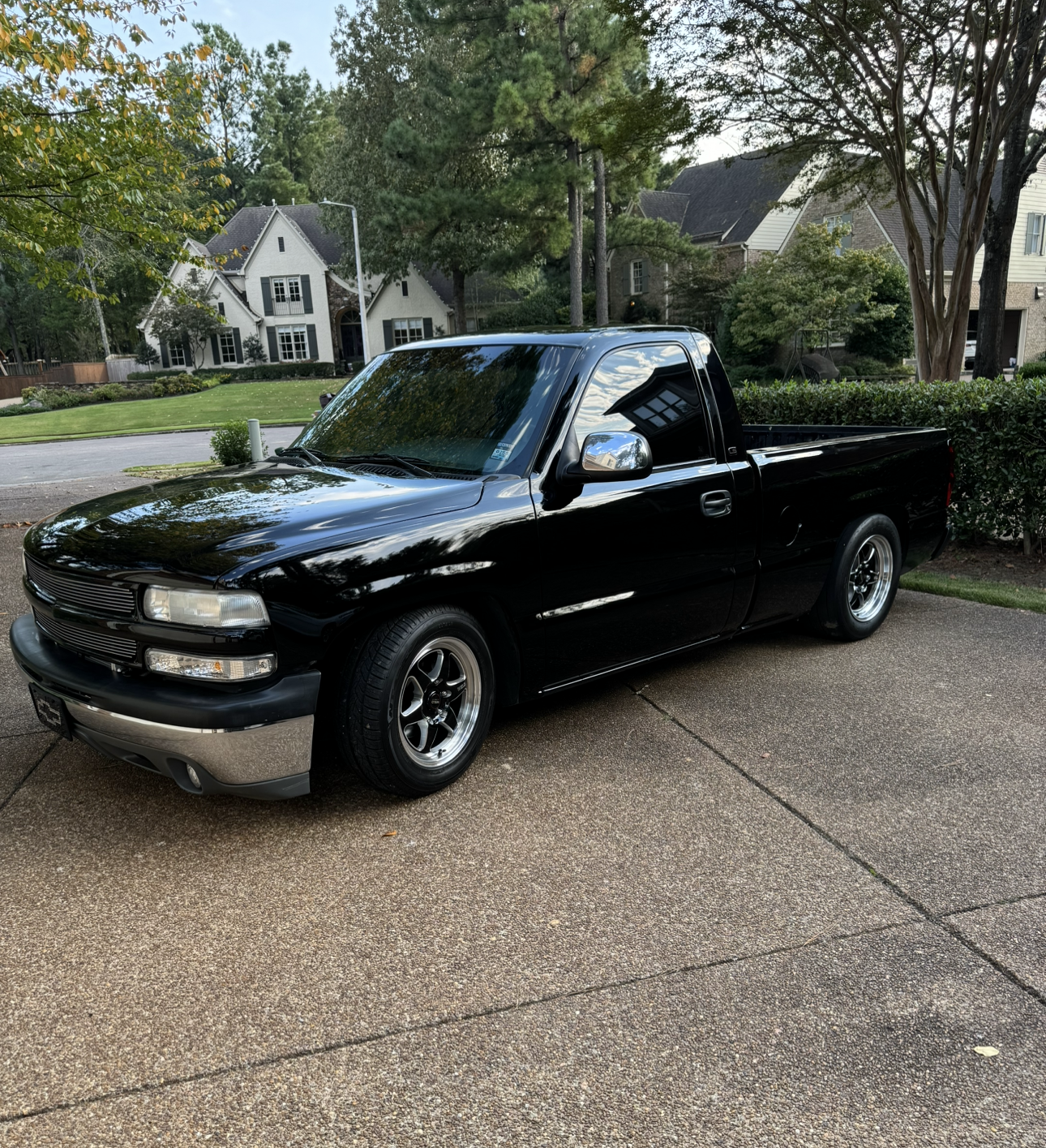 The 17″ WELD Racing Ventura wheels wear 225/60 front and 305/45 rear mixed Nitto NT421Q and Mickey Thompson ET Street R tires that were mounted in June 2023. Stopping power is provided by disc brakes at all four corners. The suspension has been lowered utilizing a DJM lowering kit, and the rear frame rails have been modified with C-notches for rear-axle clearance.
