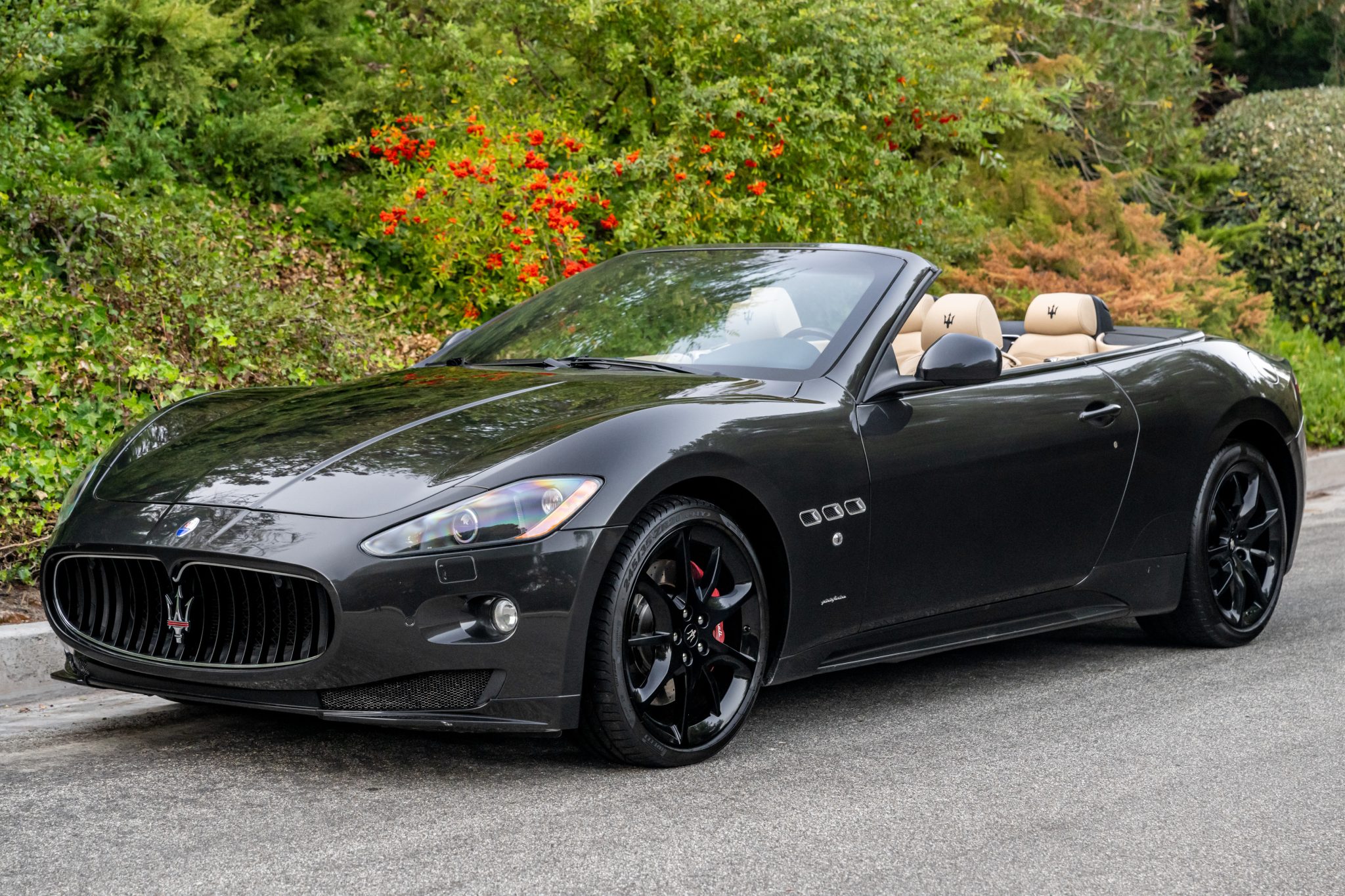The 20″ Astro Anthracite alloy wheels are mounted with Pirelli tires. Braking is handled by red-finished calipers over cross-drilled and slotted rotors at each corner. The car is equipped with the Skyhook adaptive suspension. Curb damage is located on the right-rear wheel, and a brake fluid flush was performed in October 2023.