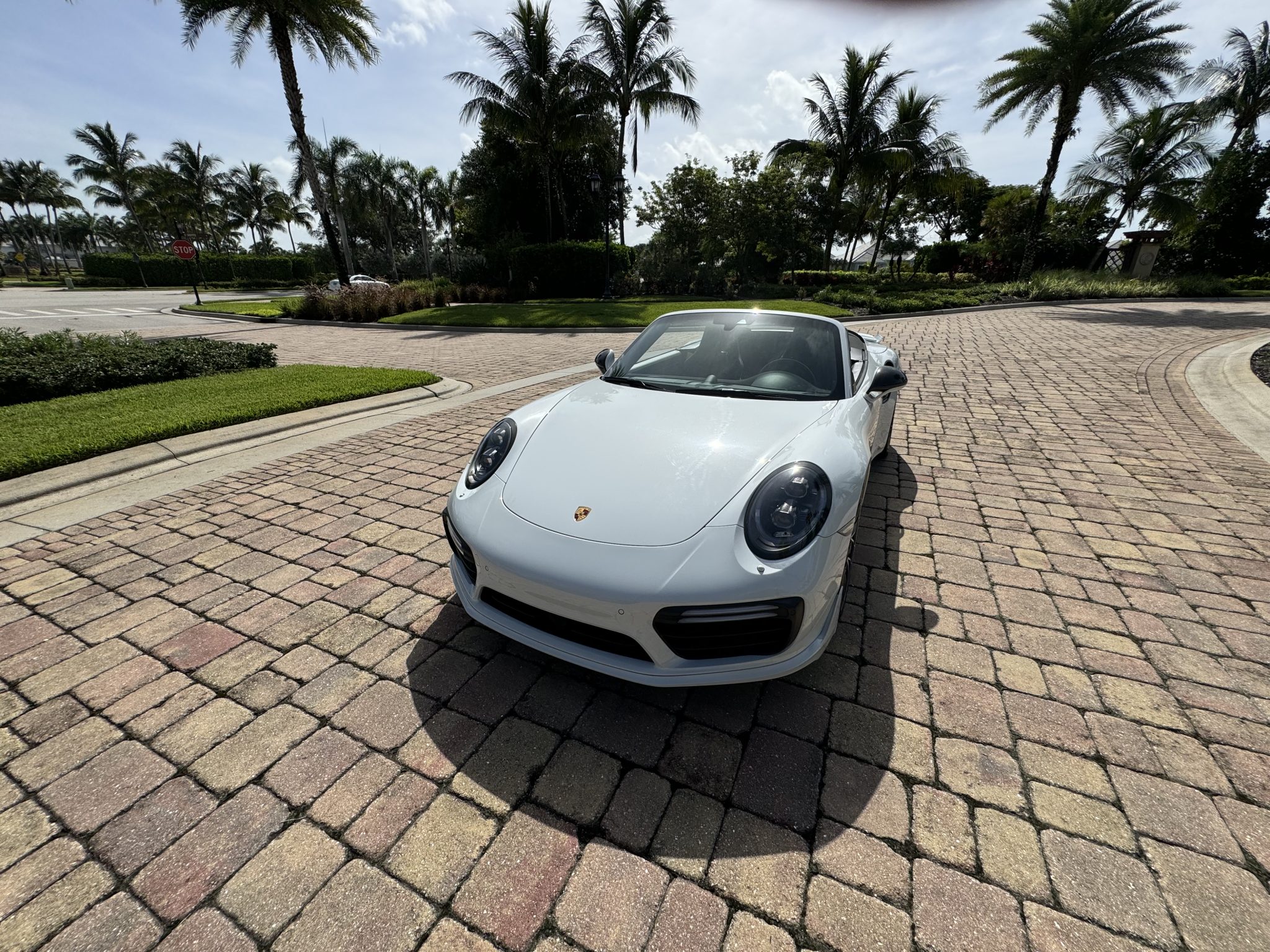 The 20″ Turbo S center-lock alloy wheels are mounted with Michelin Pilot Sport Cup 2 tires. Braking is handled by Porsche Ceramic Composite Brakes (PCCB) featuring yellow-painted Porsche-branded calipers at all four corners. The car is equipped with rear-axle steering, Porsche Dynamic Chassis Control (PDCC), Porsche Active Suspension Management (PASM), Power Steering Plus, and a front-axle lift system.