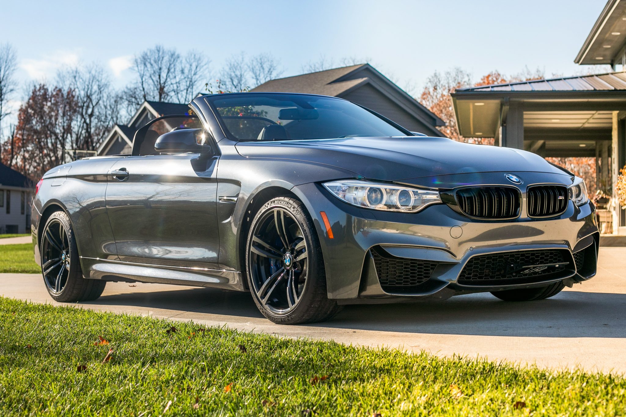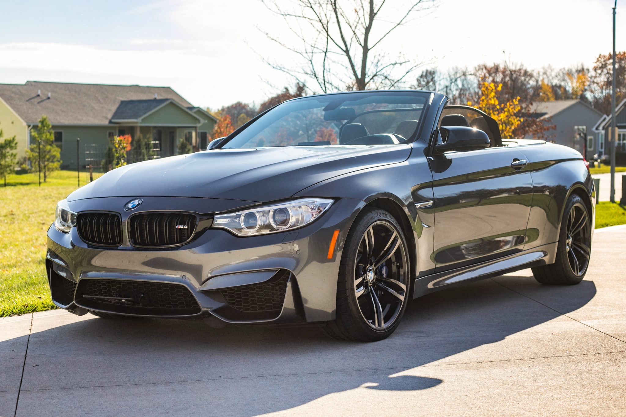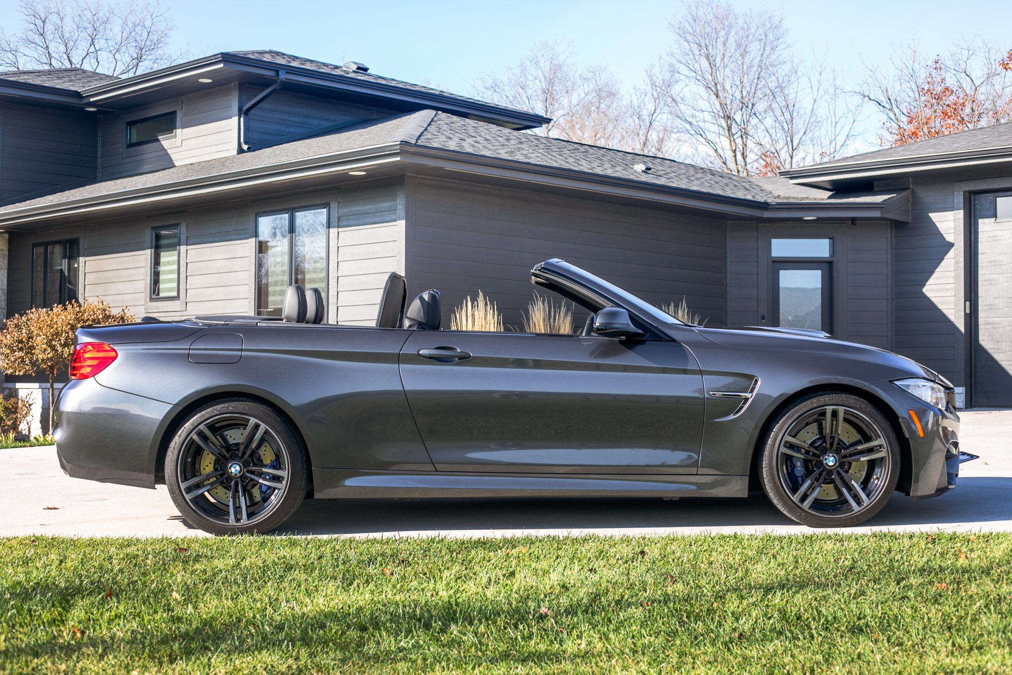The 19″ Style 437M alloy wheels are mounted with Michelin tires. Braking is handled by blue-finished M-branded calipers over cross-drilled and ventilated discs at each corner, and the car is equipped with an adaptive M suspension. Three wheels have curb damage, and the tire condition is described in the “Inspection” video shown below.