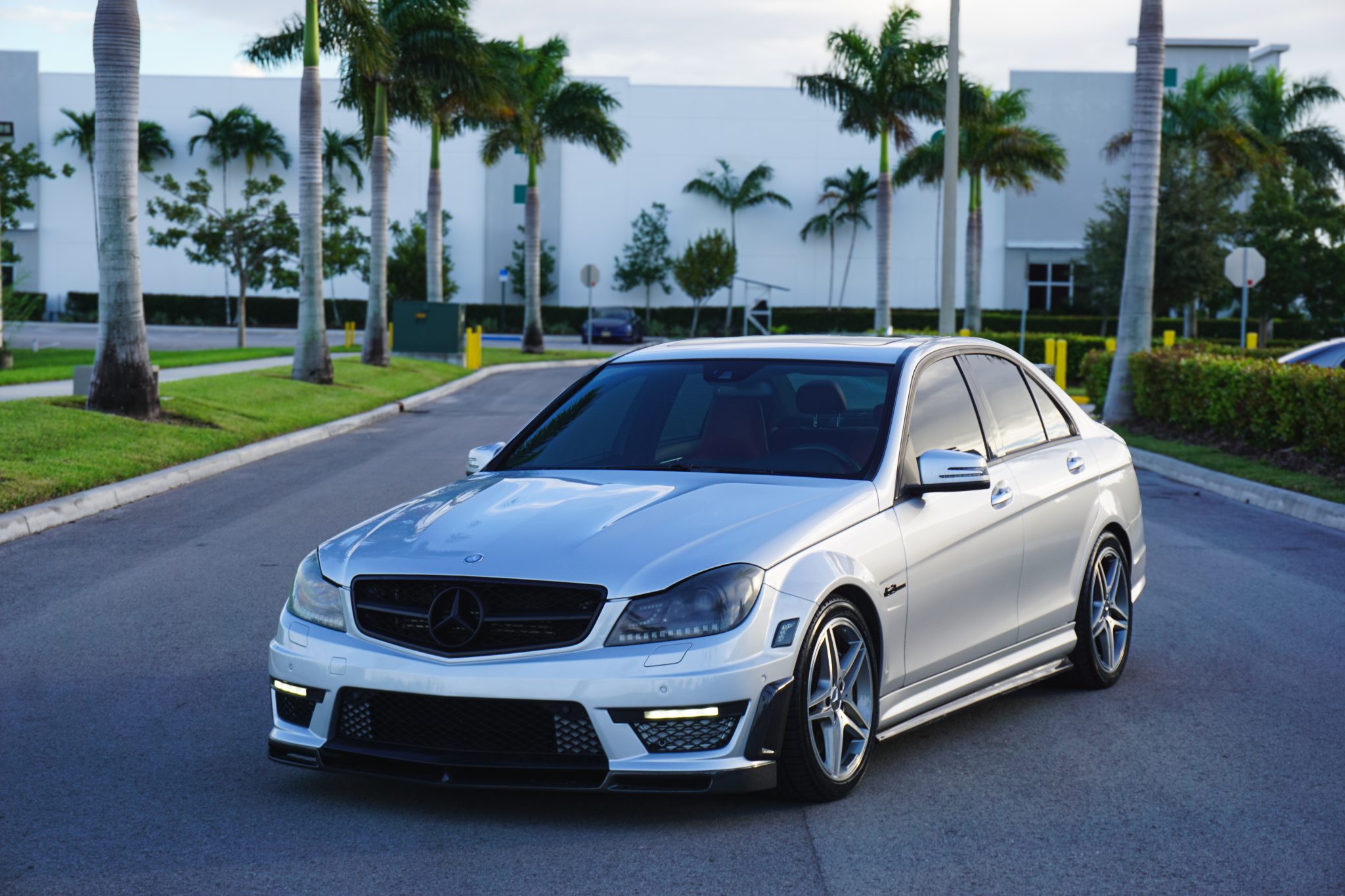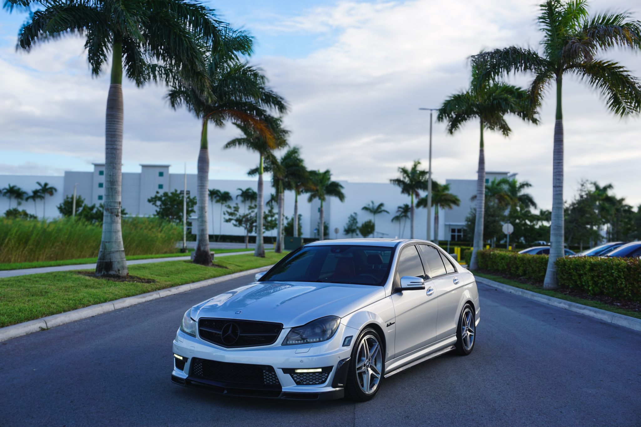 Staggered-width 18″ split-spoke AMG alloy wheels are mounted with mismatched tires. The C63 AMG features a revised front suspension with a widened front track compared to the standard C-Class as well as an AMG Sport Suspension and an Electronic Stability Program (ESP). Braking is handled by silver AMG-branded six- and four-piston calipers over drilled and slotted rotors. A brake fluid flush was performed in September 2024. Two wheels have curb damage.