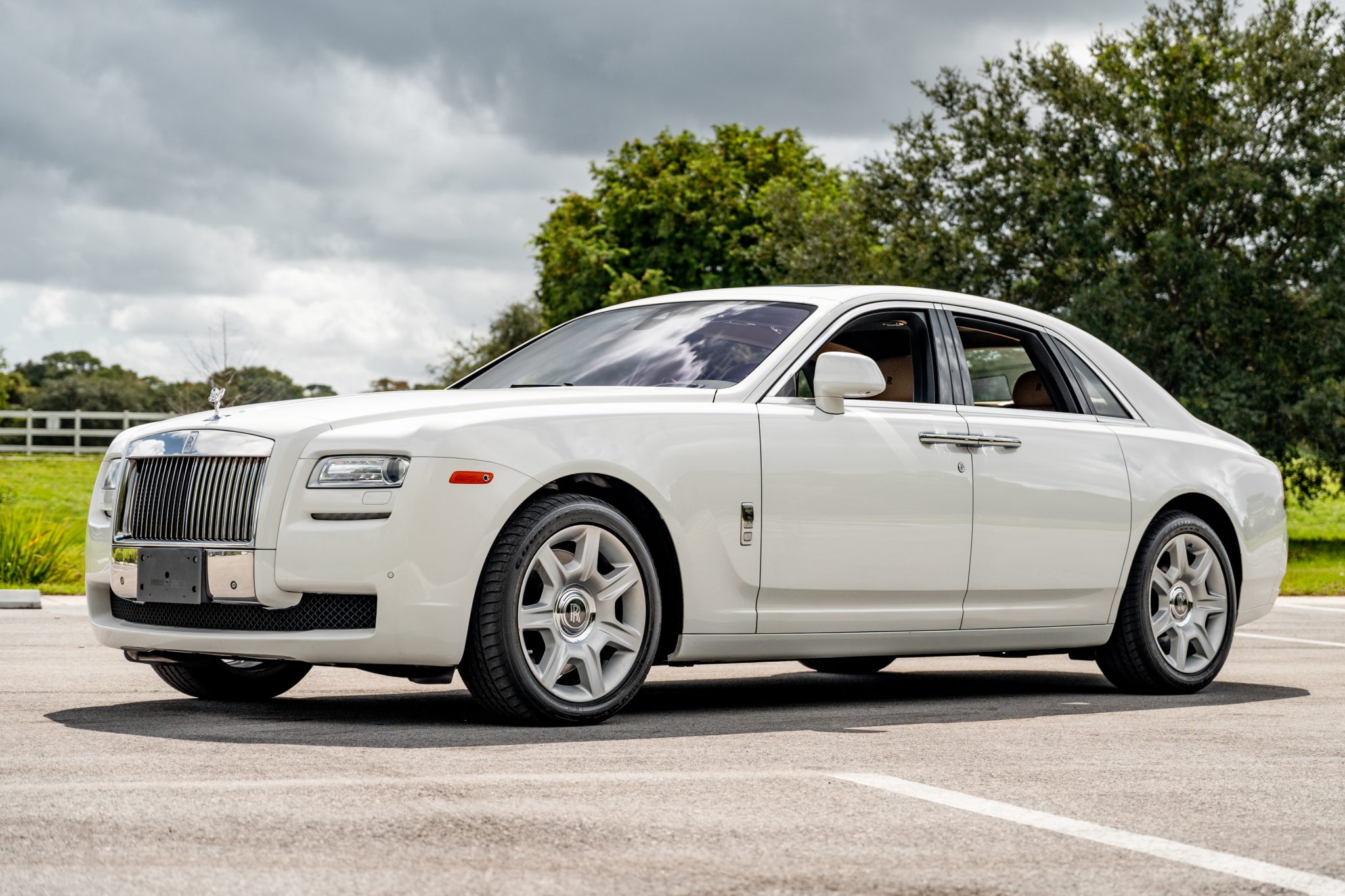 The 20″ alloy wheels wear self-centering Rolls-Royce center emblems and are wrapped with Goodyear EfficientGrip tires measuring 255/45 up front and 285/40 out back. The four-wheel disc brakes feature brake-energy regeneration and a four-channel anti-lock system, and the car is equipped with self-leveling air springs with anti-roll stabilization and electronic Variable Damping Control (VDC). A brake fluid flush was performed in July 2024.