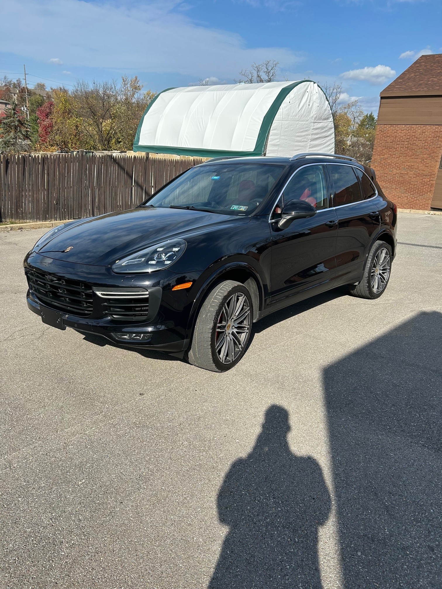 The 21″ 911 Turbo Design alloy wheels are mounted with 295/35 Michelin Latitude Sport 3 tires. The truck is equipped with an adjustable air suspension, Porsche Active Suspension Management (PASM), Power Steering Plus, and Porsche Dynamic Chassis Control (PDCC). Stopping power is provided by red-finished six-piston front and four-piston rear brake calipers over ventilated rotors at each corner.