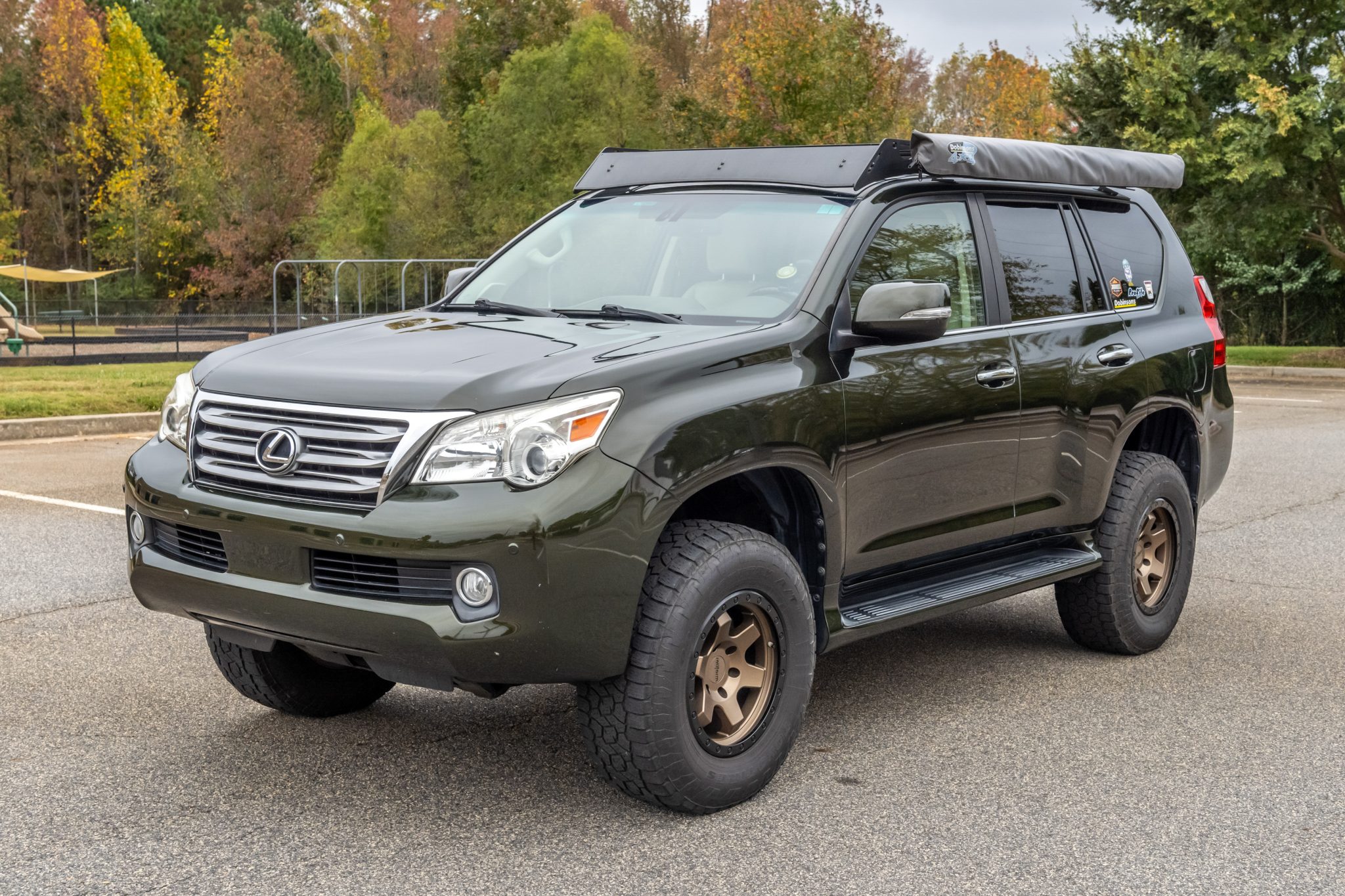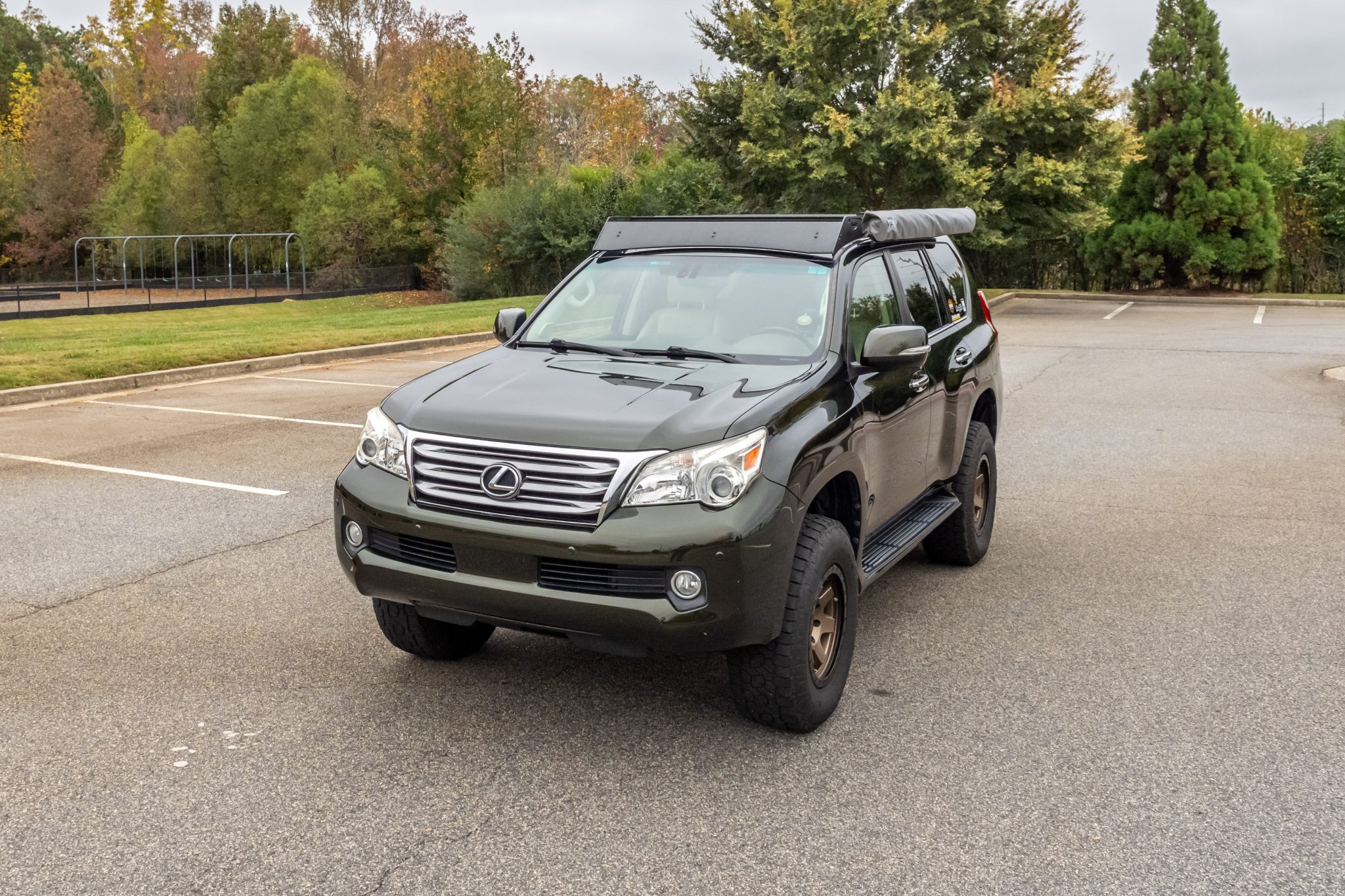 The bronze-finished Rotiform 17″ wheels are mounted with 285/70 Toyo Open Country tires. A spare wheel and tire assembly is secured to the undercarriage. The truck is equipped with a Dobinsons 2.5″ lift, PowerStop drilled and slotted brake rotors. The rear brake pads are due for replacement.
