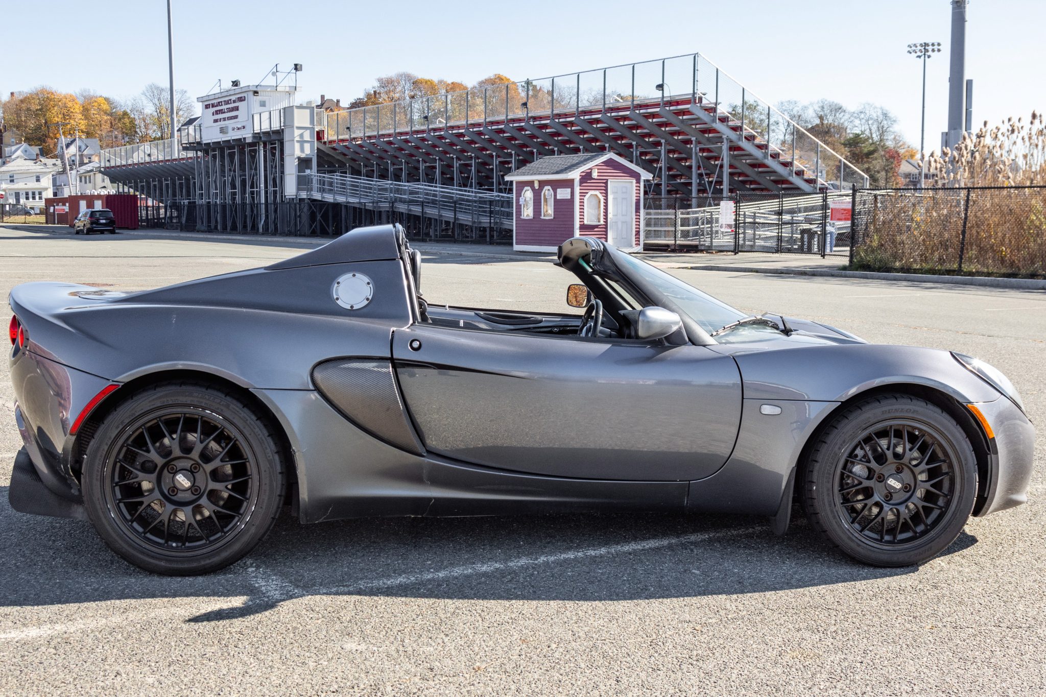 Black-finished BBS multi-spoke wheels wear 205/45-16 Dunlop Direzza tires up front and 245/40-17 rubber out back. Braking is handled by ventilated and slotted discs, and the parking brake cable was replaced in 2022.
