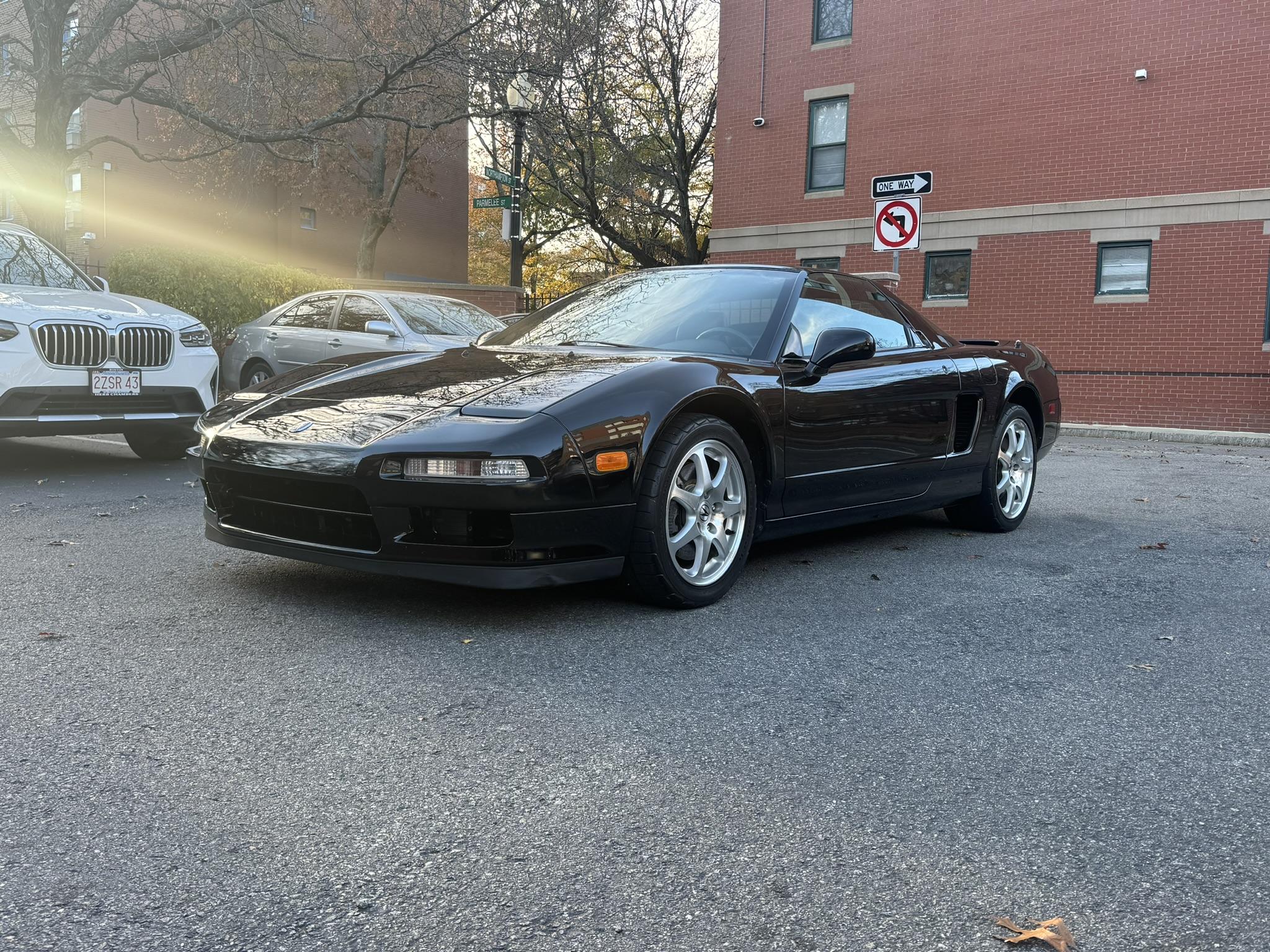 Staggered-diameter 16” and 17” seven-spoke aluminum wheels are mounted with BFGoodrich tires. The car features a four-wheel double-wishbone suspension with front and rear stabilizer bars, and braking is handled by NSX-branded calipers over vented rotors at each corner. Pitting in the finish is visible on the wheels. The brake and clutch fluids were flushed in March 2024.