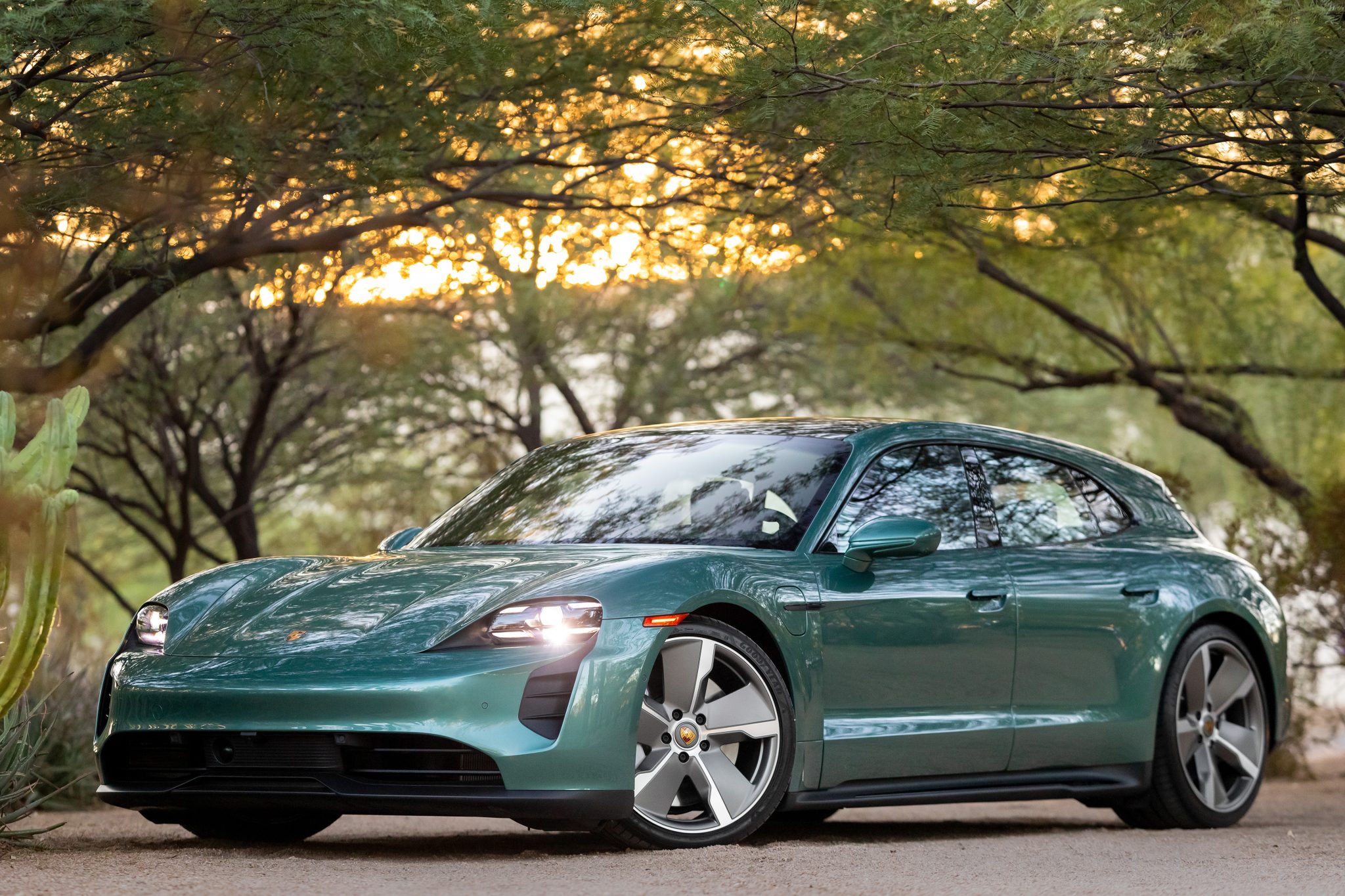 Satin Platinum-finished 21” Taycan Exclusive Design wheels are mounted with Goodyear Eagle F1 tires. The car is equipped with rear-axle steering and Porsche Active Suspension Management (PASM). The regenerative braking system features white calipers over Porsche Surface Coated Brake (PSCB) rotors at all four corners.