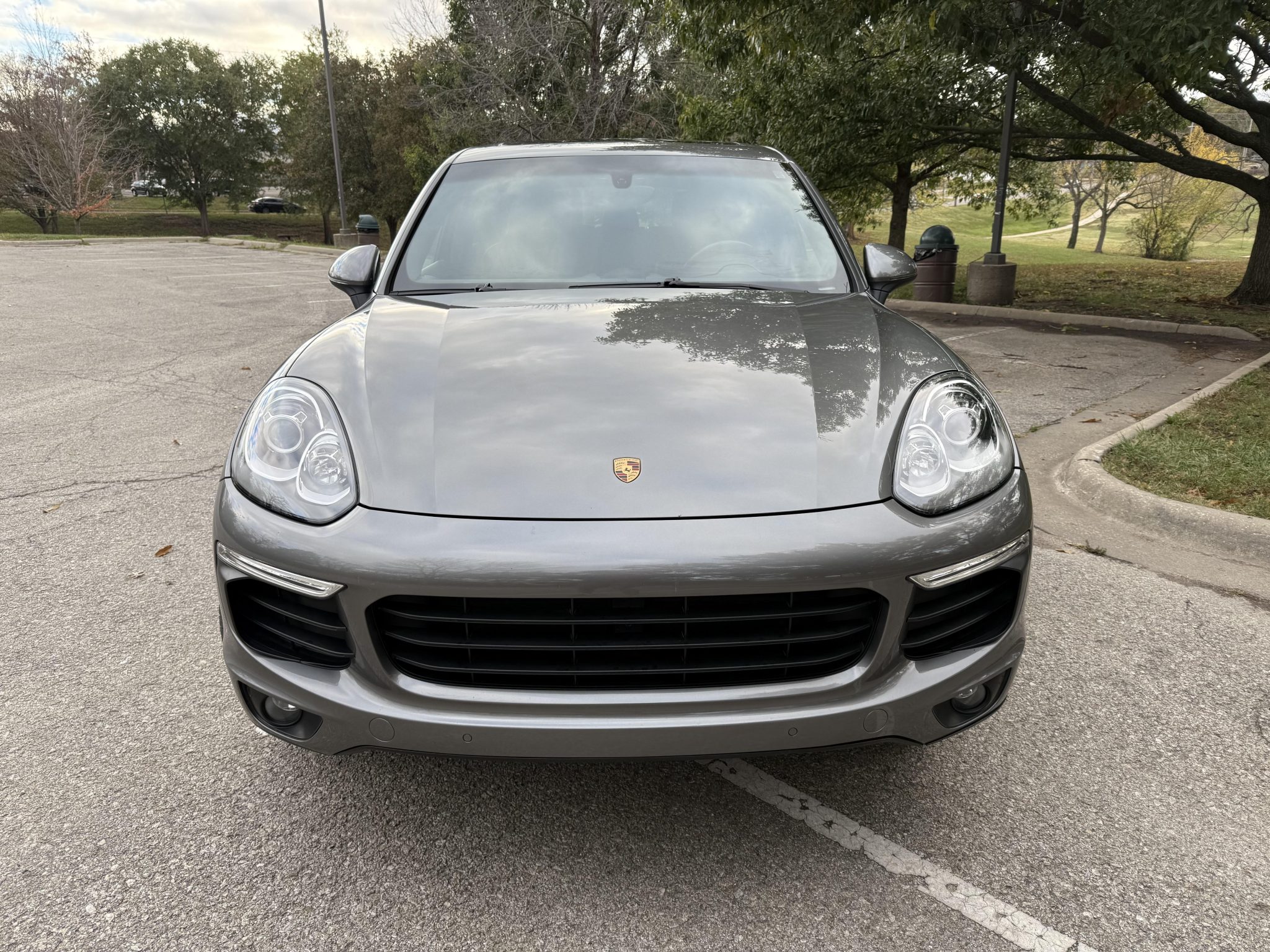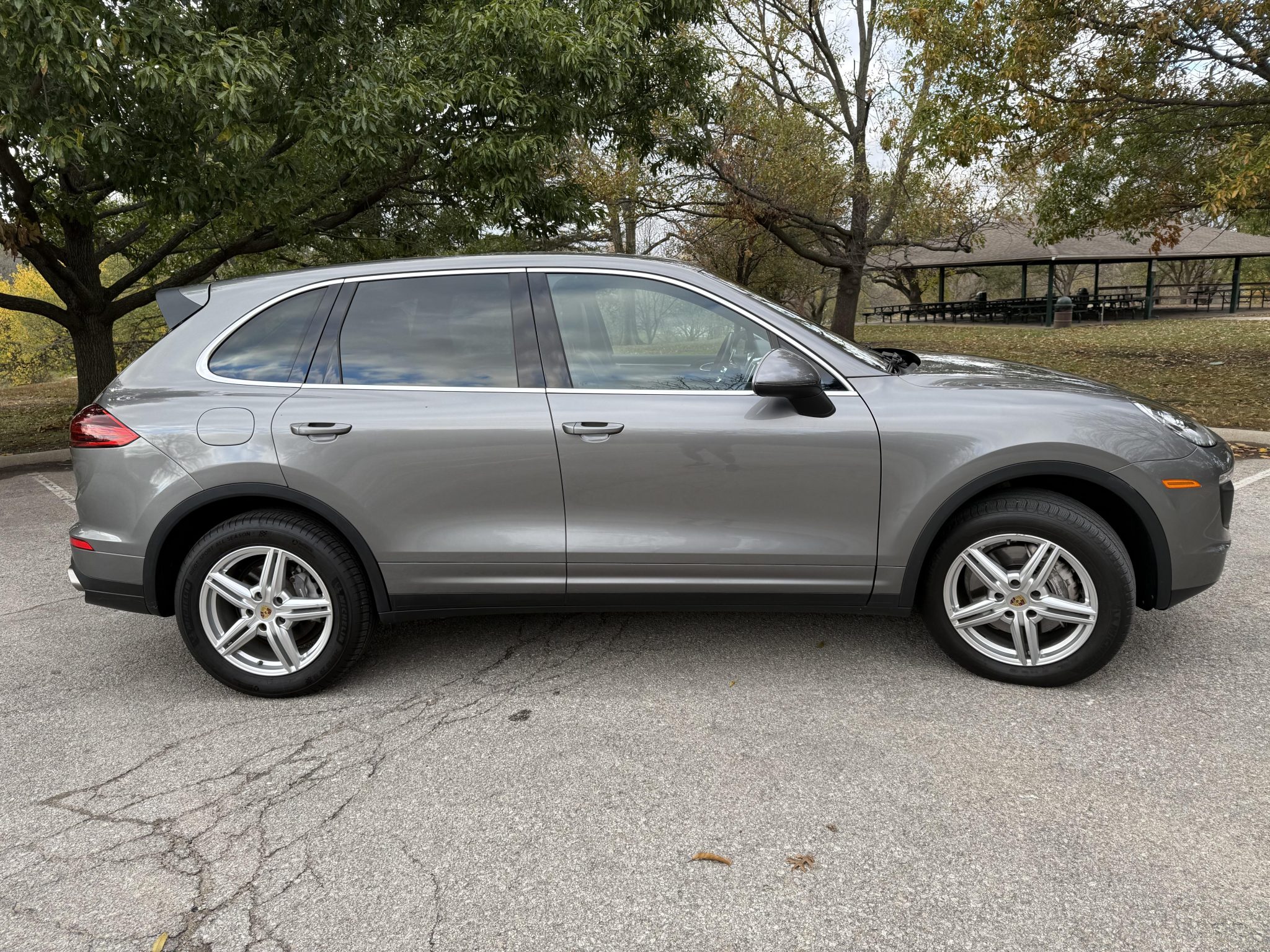 Silver-finished 19″ Cayenne Design II alloy wheels are mounted with 265/50 Michelin Pilot Sport All Season tires. Power Steering Plus was optioned from the factory, and stopping power is provided by six-piston front and four-piston rear brake calipers over ventilated rotors at each corner.