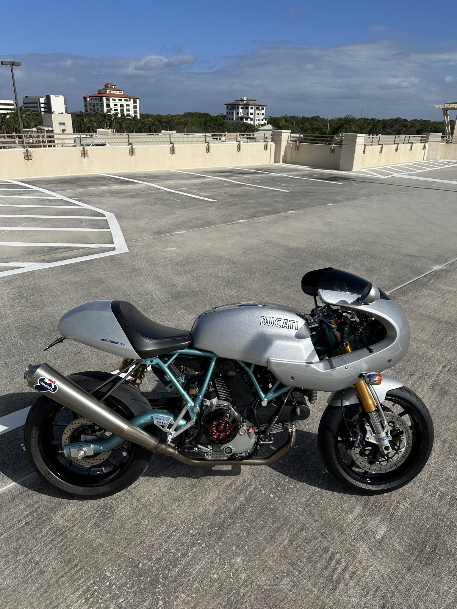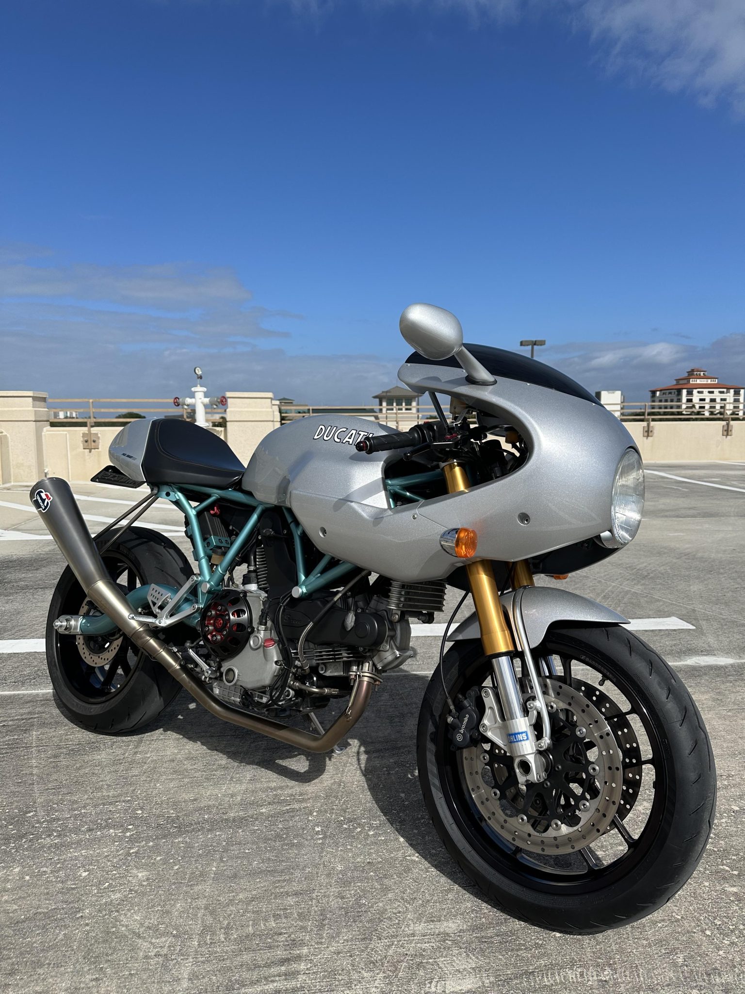 Aftermarket 17″ Carrozzeria forged aluminum wheels are finished in black, and they were mounted with 120/70 front and 180/55 rear Pirelli Diablo Rosso 4 tires in 2022. Öhlins suspension consists of an inverted 43mm fork as well as a piggyback monoshock attached to the left side of the tubular double-sided swingarm. Braking components include dual 320mm rotors with four-piston Brembo calipers up front and a 245mm rotor with a two-piston Brembo caliper at the rear. Additional work under current ownership included refinishing the frame in green and rebuilding the rear shock.