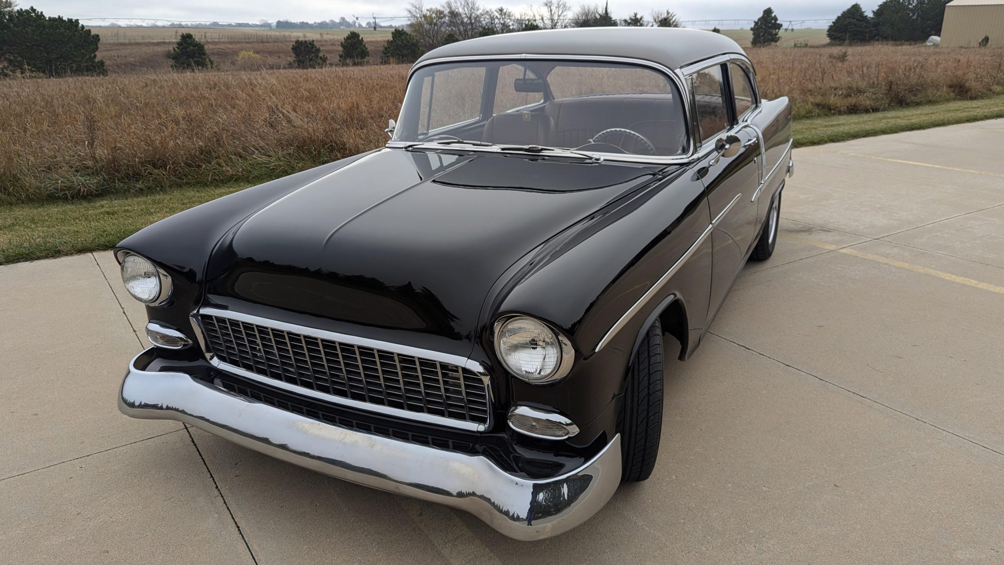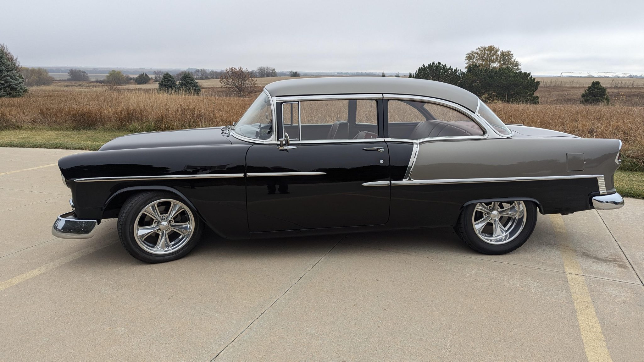 Polished 17″ front and 18″ rear wheels are wrapped in 215/55 Ohtsu tires and 265/50 Nitto NT555 tires, respectively. Modifications include tubular front control arms, power steering, and power-assisted front disc brakes with rear drums.