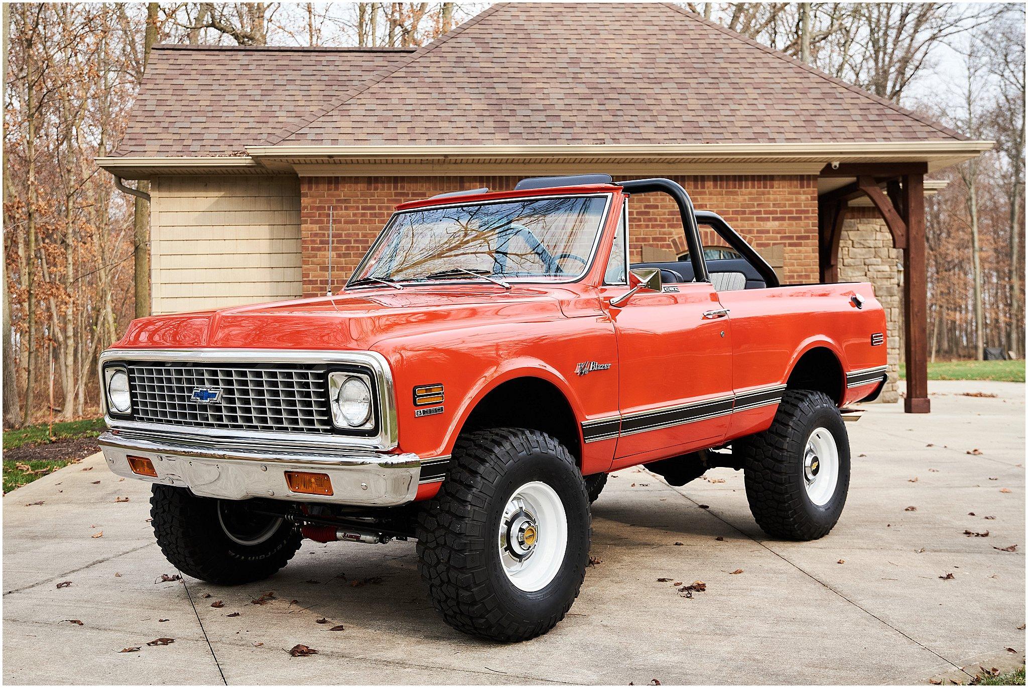 White 16″ steel wheels wear hubcaps and are mounted with 315/75 BFGoodrich Mud-Terrain T/A KM2 tires. The truck is equipped with manually locking front hubs, power steering, Rancho dual steering stabilizers, and a 4″ suspension lift. Braking is handled by power-assisted front discs and rear drums.