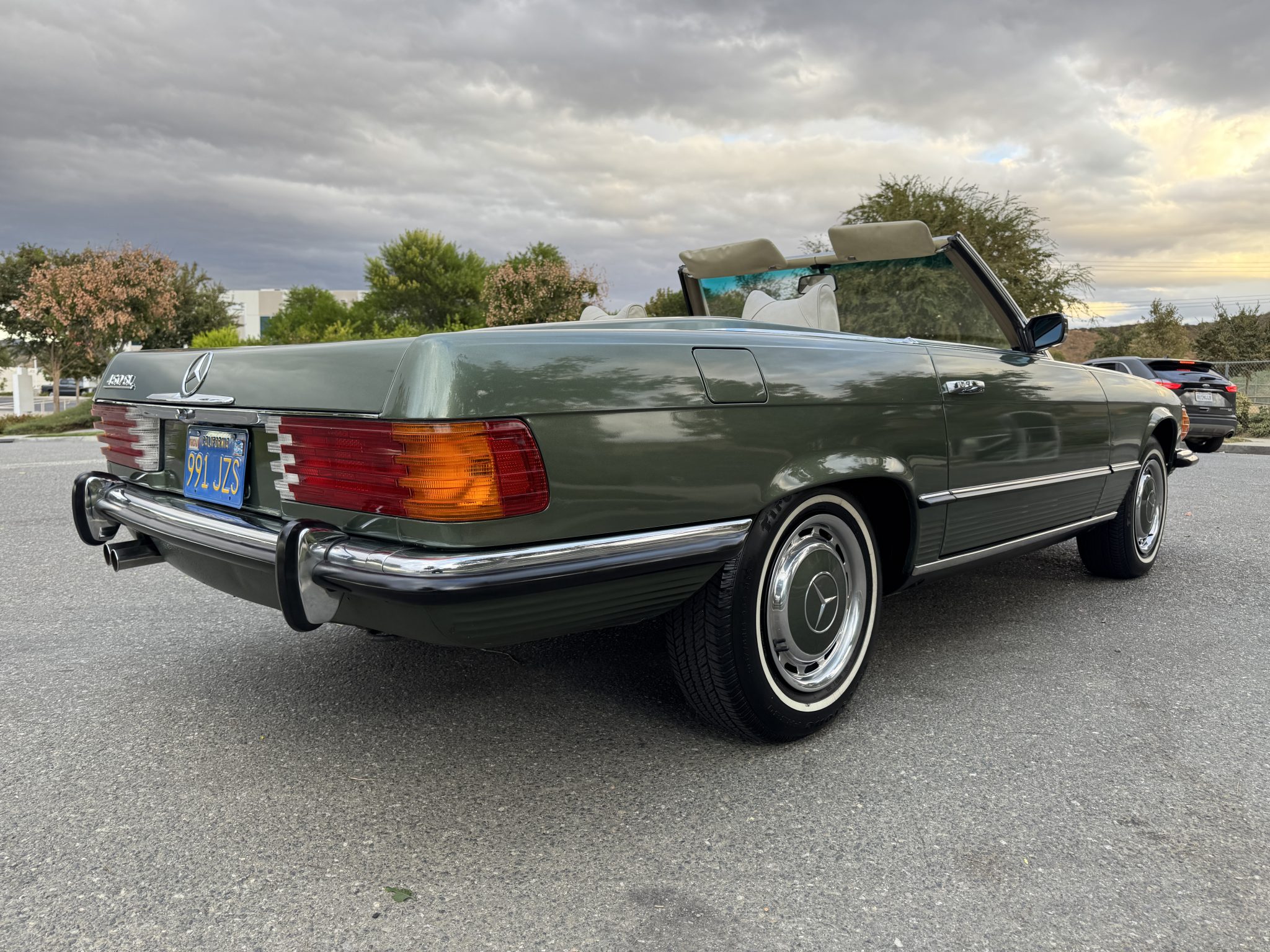 The 14″ steel wheels wear painted covers and are mounted with Firestone tires. The car was factory-equipped with power steering and power-assisted four-wheel disc brakes.