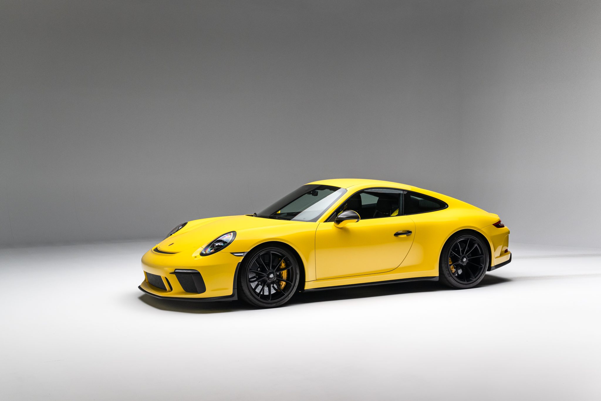 Black-finished 20″ center-lock alloy wheels are mounted with Dunlop tires. Braking is handled by yellow Porsche-branded calipers over ceramic-composite rotors, and the car was optioned with a front-axle lift system. A brake fluid flush was performed in January 2024.